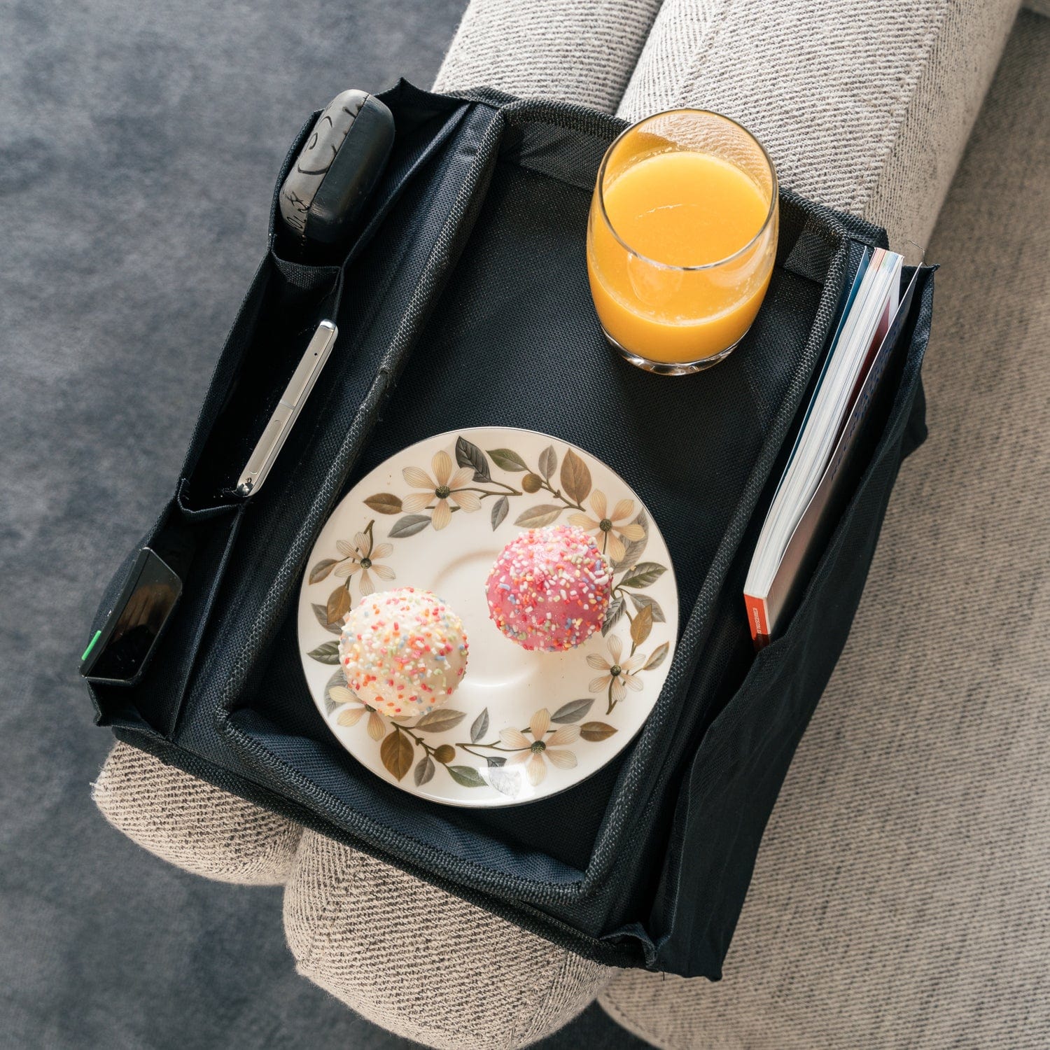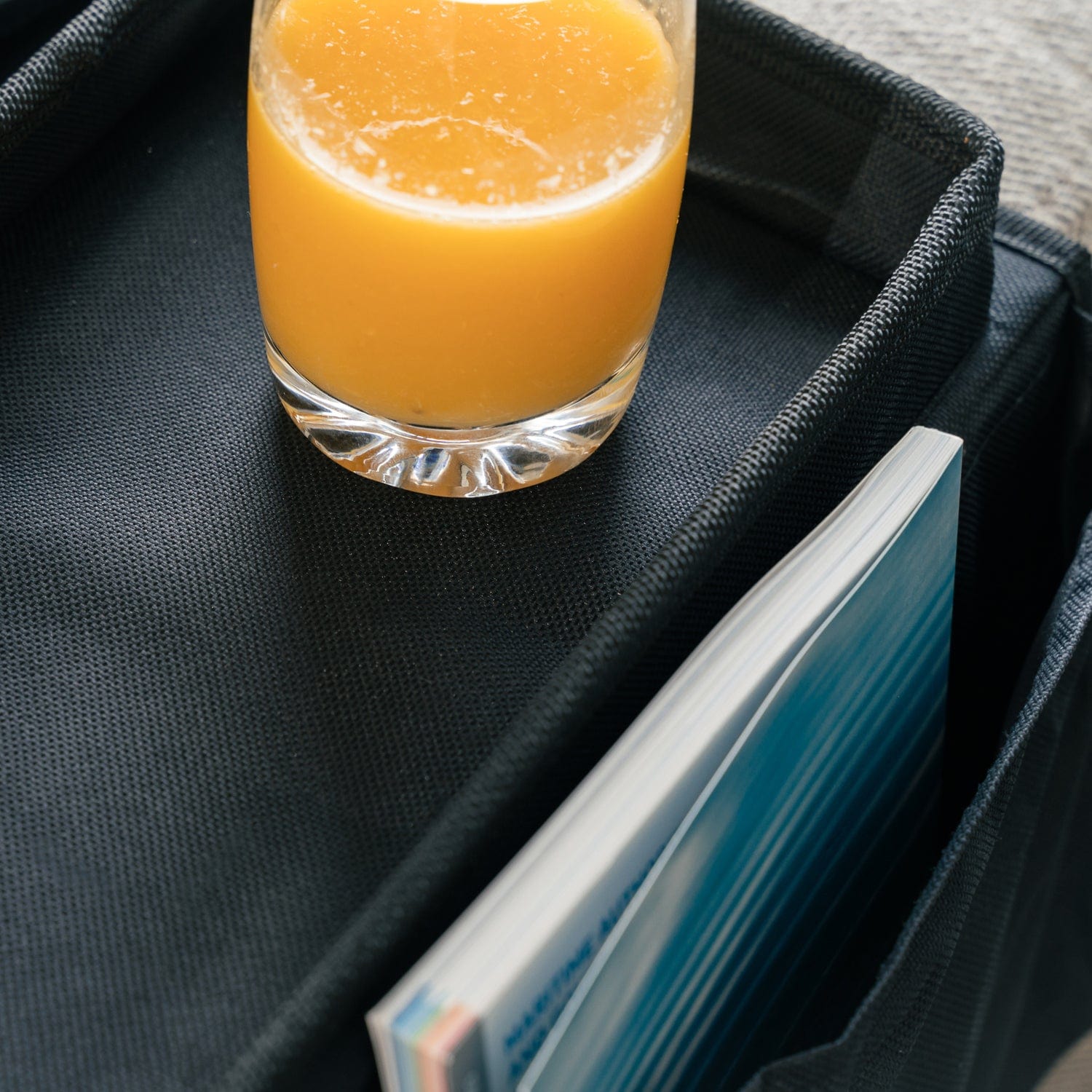 This sofa armrest fabric organiser is designed to help keep your living space neat and organized. It features multiple pockets of different sizes, providing convenient storage for remote controls, magazines, glasses, snacks, and other essentials. Made from durable, water-resistant material with a non-slip backing, it stays securely in place during use.
