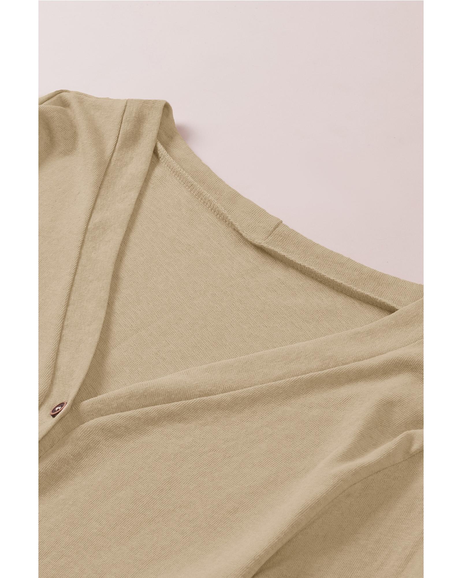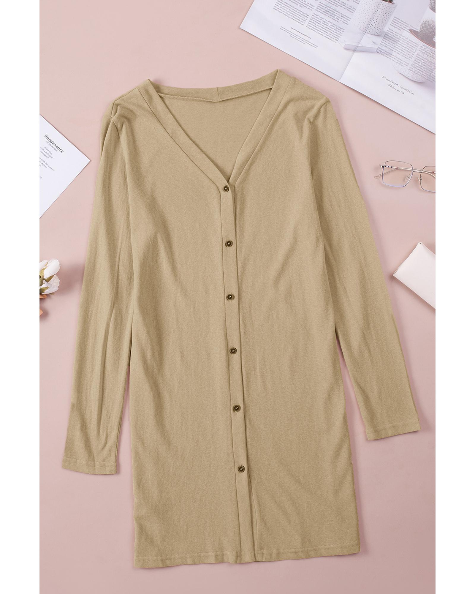 This solid color open-front cardigan features a classic button closure and a relaxed, longline fit. Designed for versatility, it is suitable for early autumn and warm spring days, offering a lightweight and comfortable layering option. Its loose fit and long sleeves make it a stylish choice for various casual outfits.