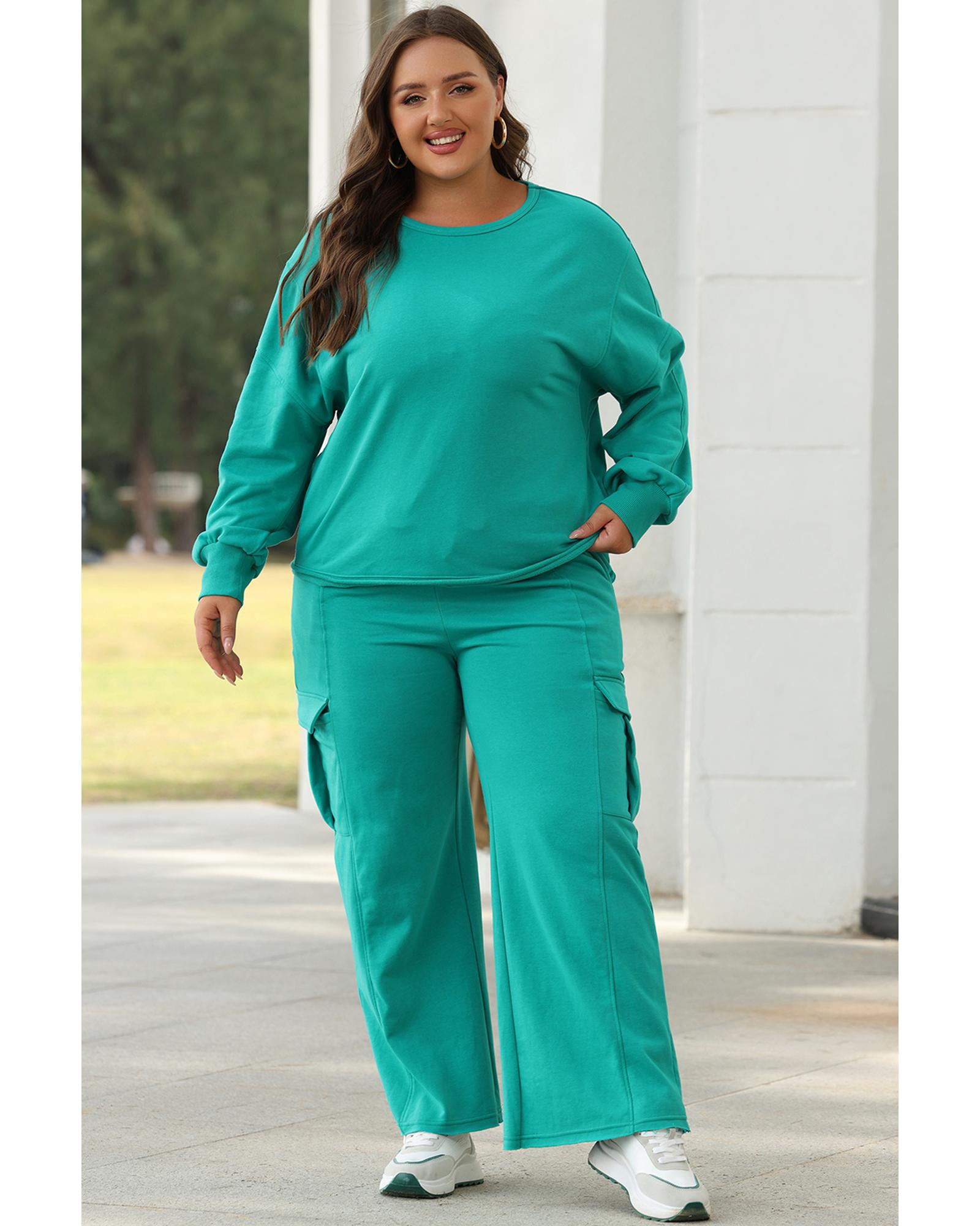 This solid color pullover top and cargo pants set offers a stylish and comfortable outfit option. Designed with a trendy fitted look, it features a vintage mineral wash finish and versatile style suitable for women of various ages and body types. The set includes a drop shoulder pullover and wide-leg cargo pants with functional cargo pockets, making it ideal for casual wear.