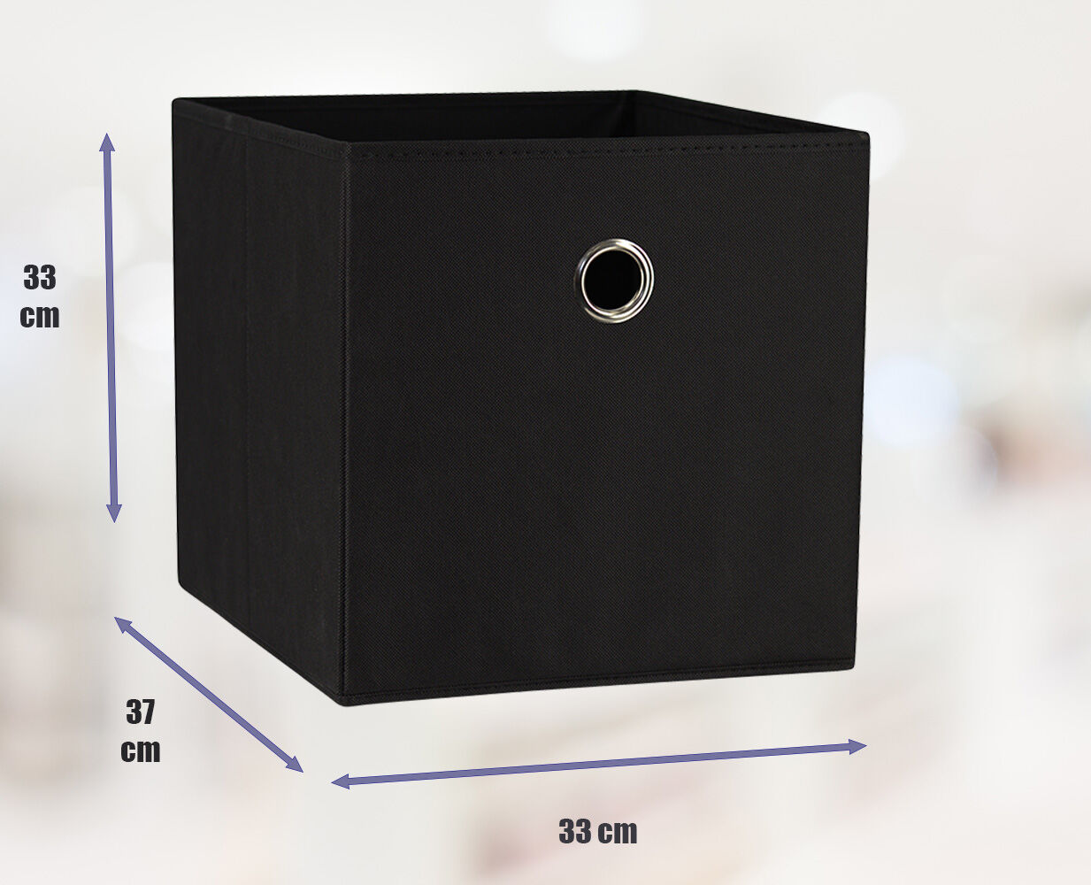 Specifications include dimensions of 33 x 33 x 27 cm, with a black fabric exterior. The cubes are lightweight and easy to handle, making them suitable for various storage needs.