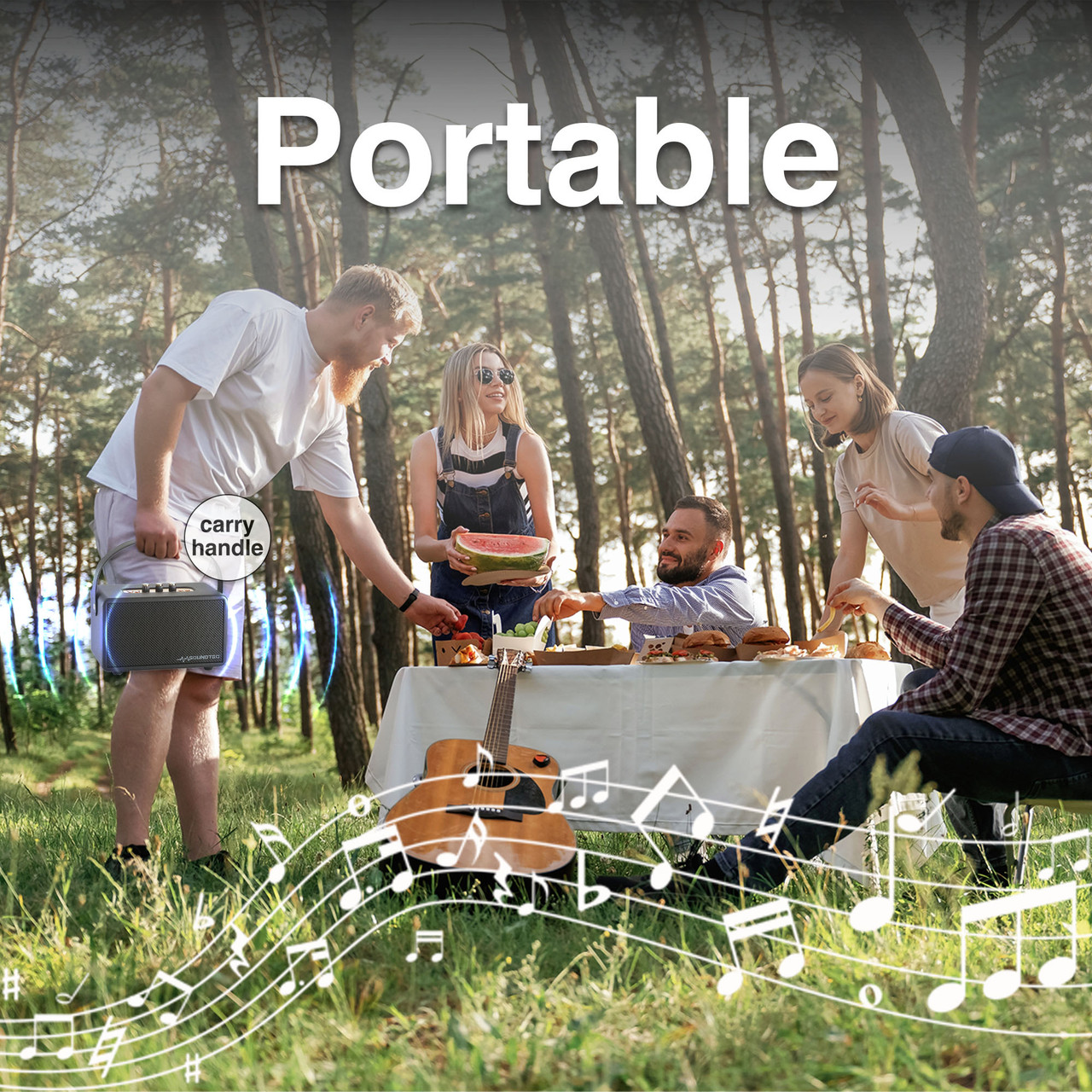 • Built-in handle and durable metal grille for portability and protection