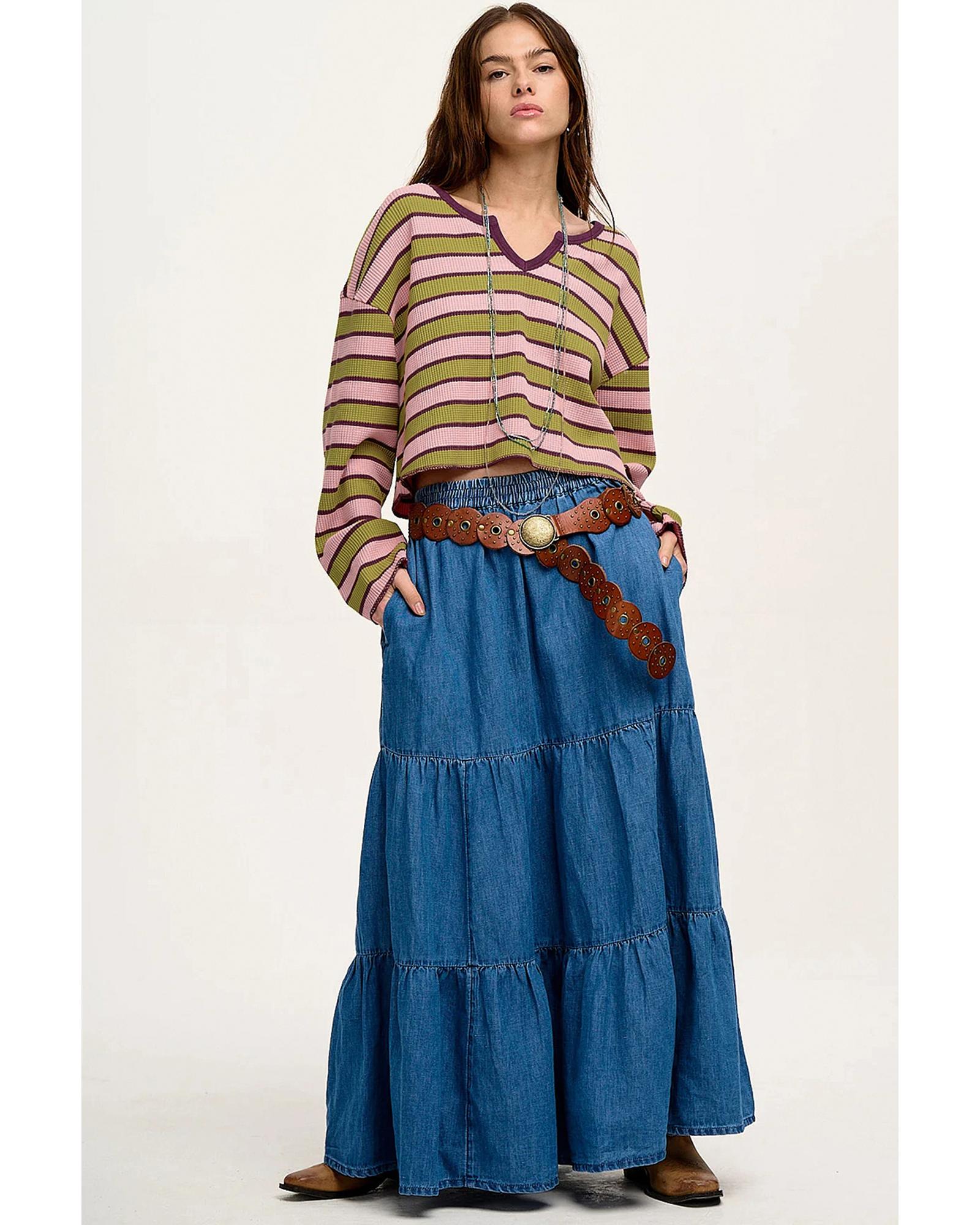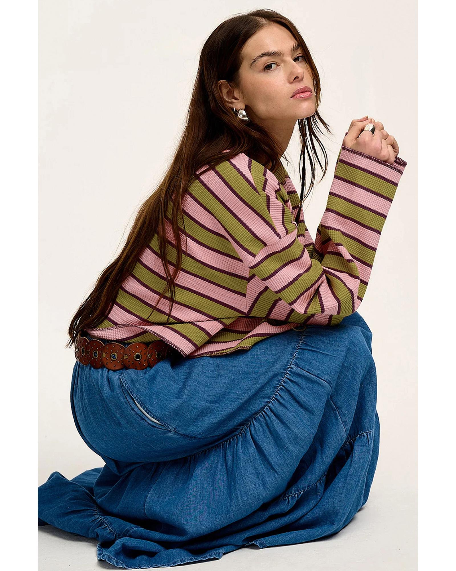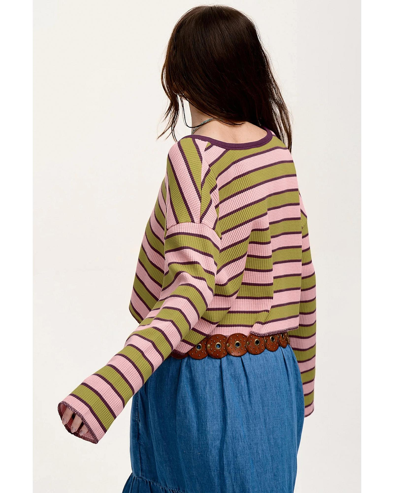 This long sleeve top features a stylish waffle texture combined with a trendy striped pattern, offering a fashionable and comfortable addition to your wardrobe. Designed with a relaxed fit and dropped shoulder details, it provides both style and ease of movement. The notched V neckline and raw cut hem add unique design elements to enhance its modern look.