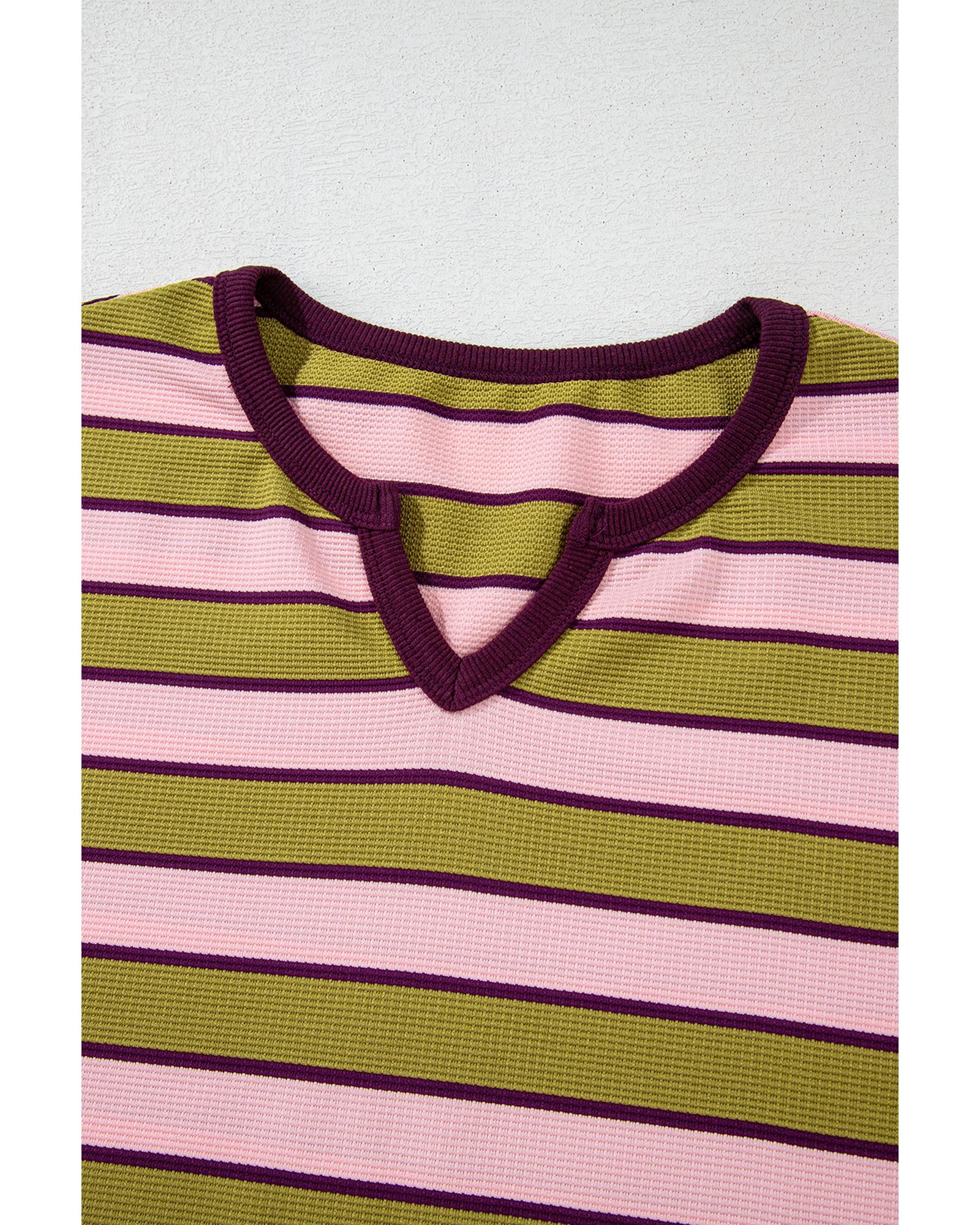 Spinach Green Clashing Stripes Waffle Texture Notched Neck Long Sleeve Top – L