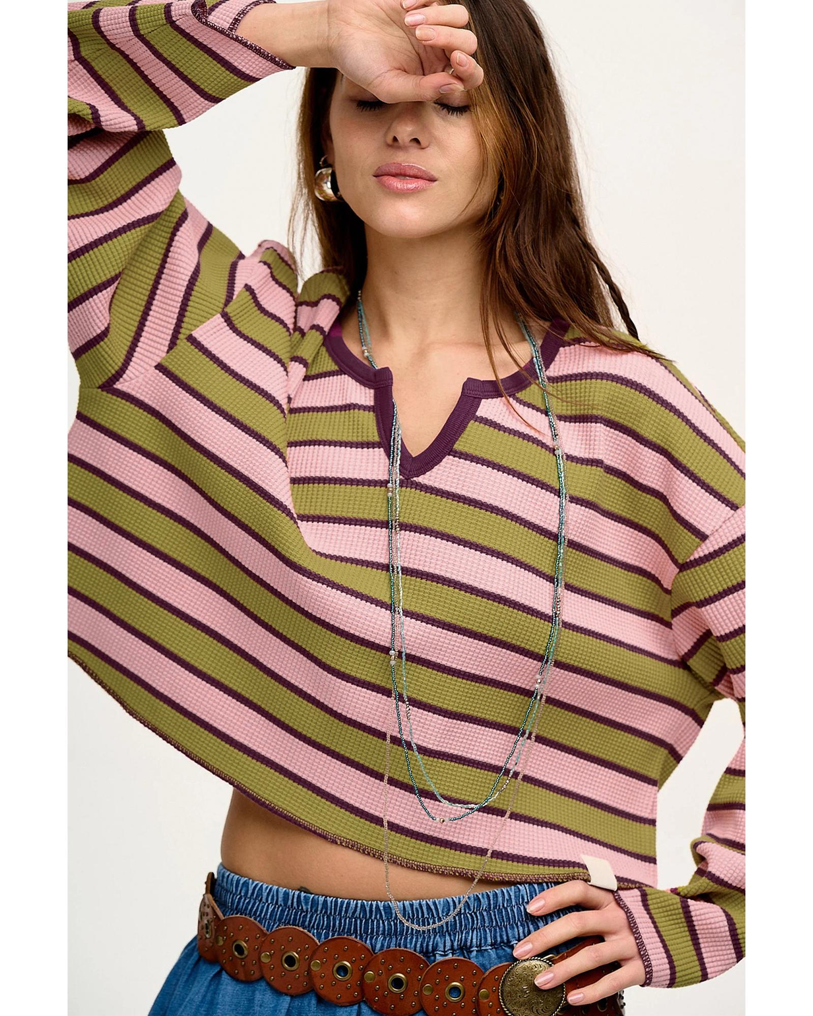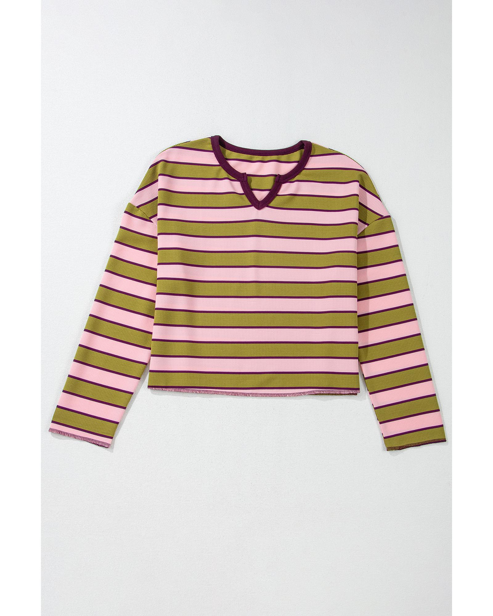 This long sleeve top features a stylish waffle texture combined with trendy clashing stripes, designed for a modern and fitted look. The notched V neckline and relaxed fit with dropped shoulders make it a comfortable yet fashionable choice for any occasion.