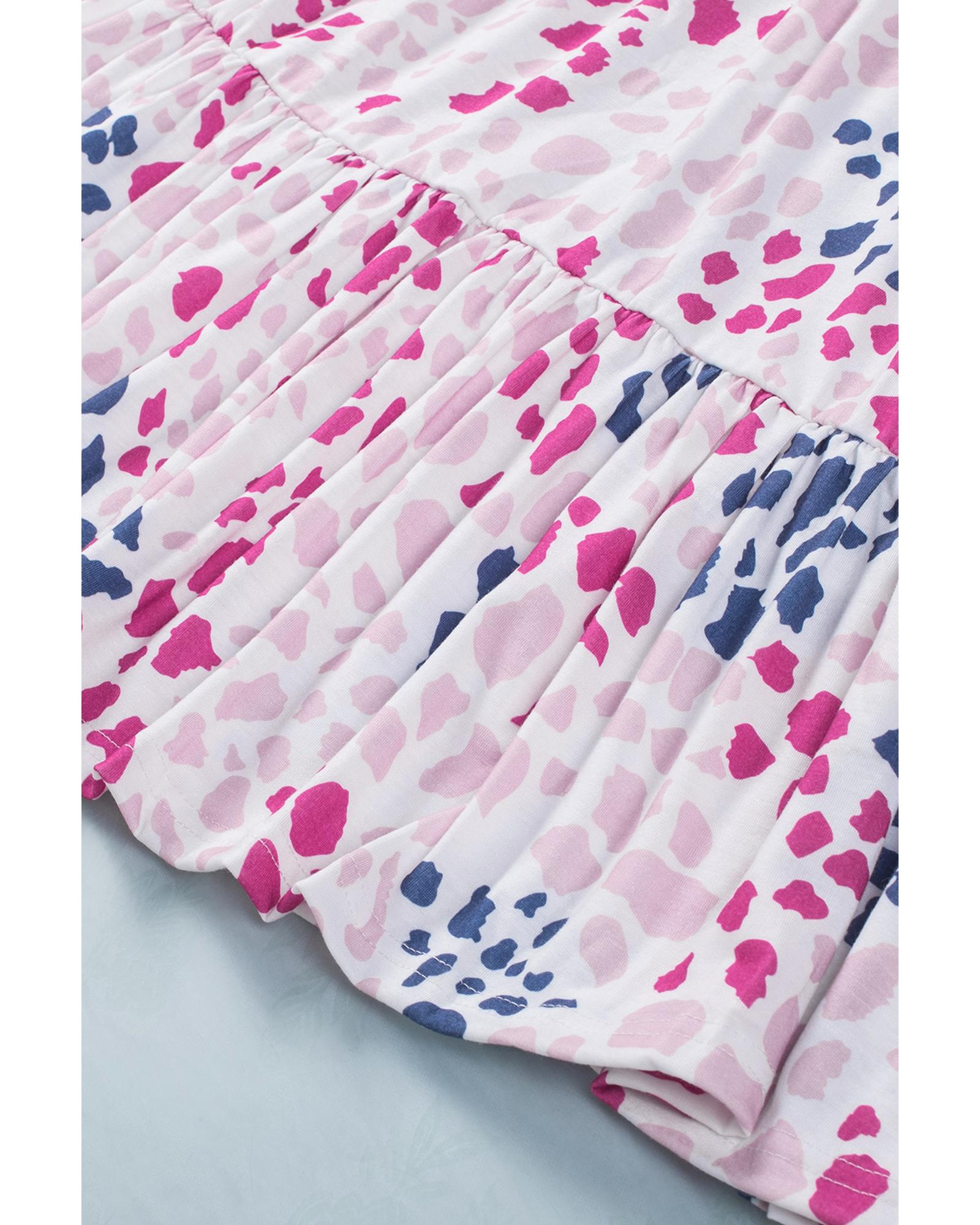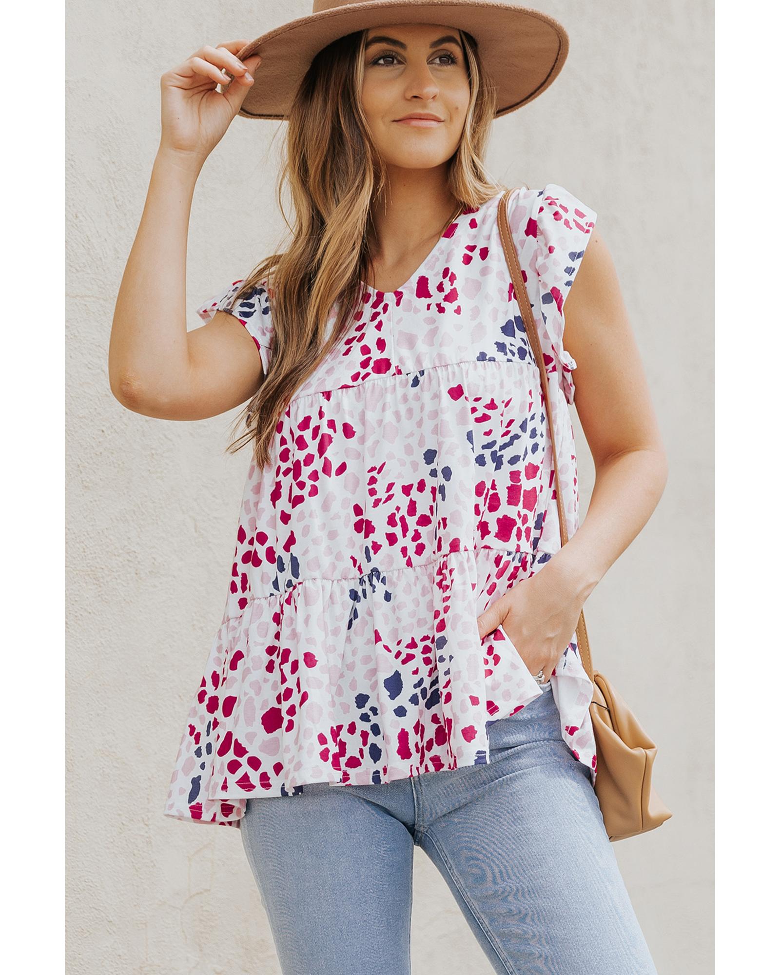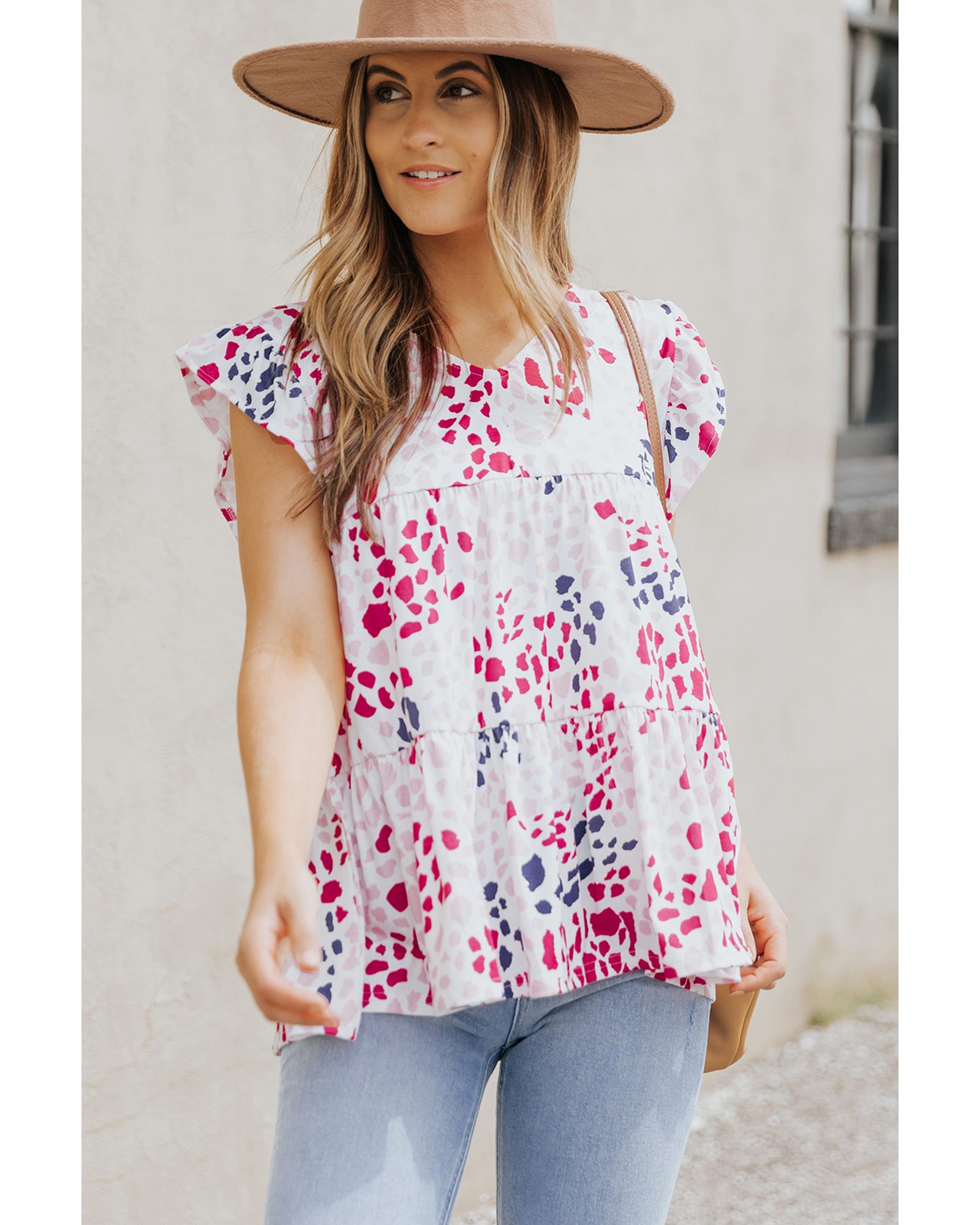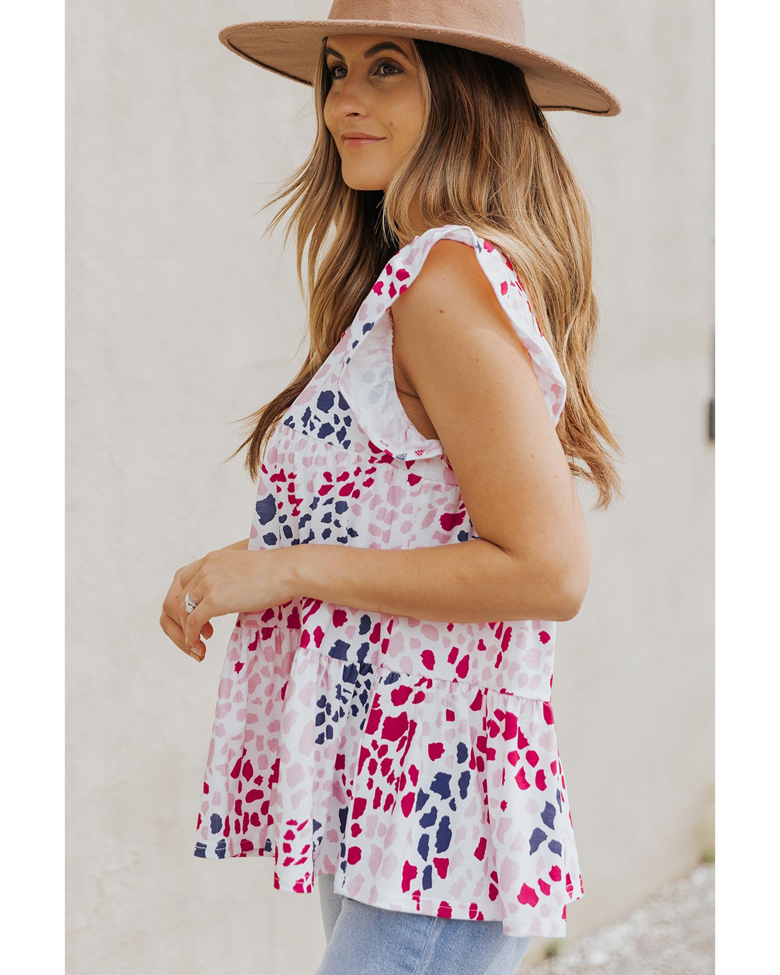 This spotted print ruffled V neck tank top combines trendy design with a comfortable fit, making it a versatile addition to any wardrobe. Its fashionable leopard print and ruffled sleeveless style highlight a chic and modern look, perfect for casual outings or stylish layering.