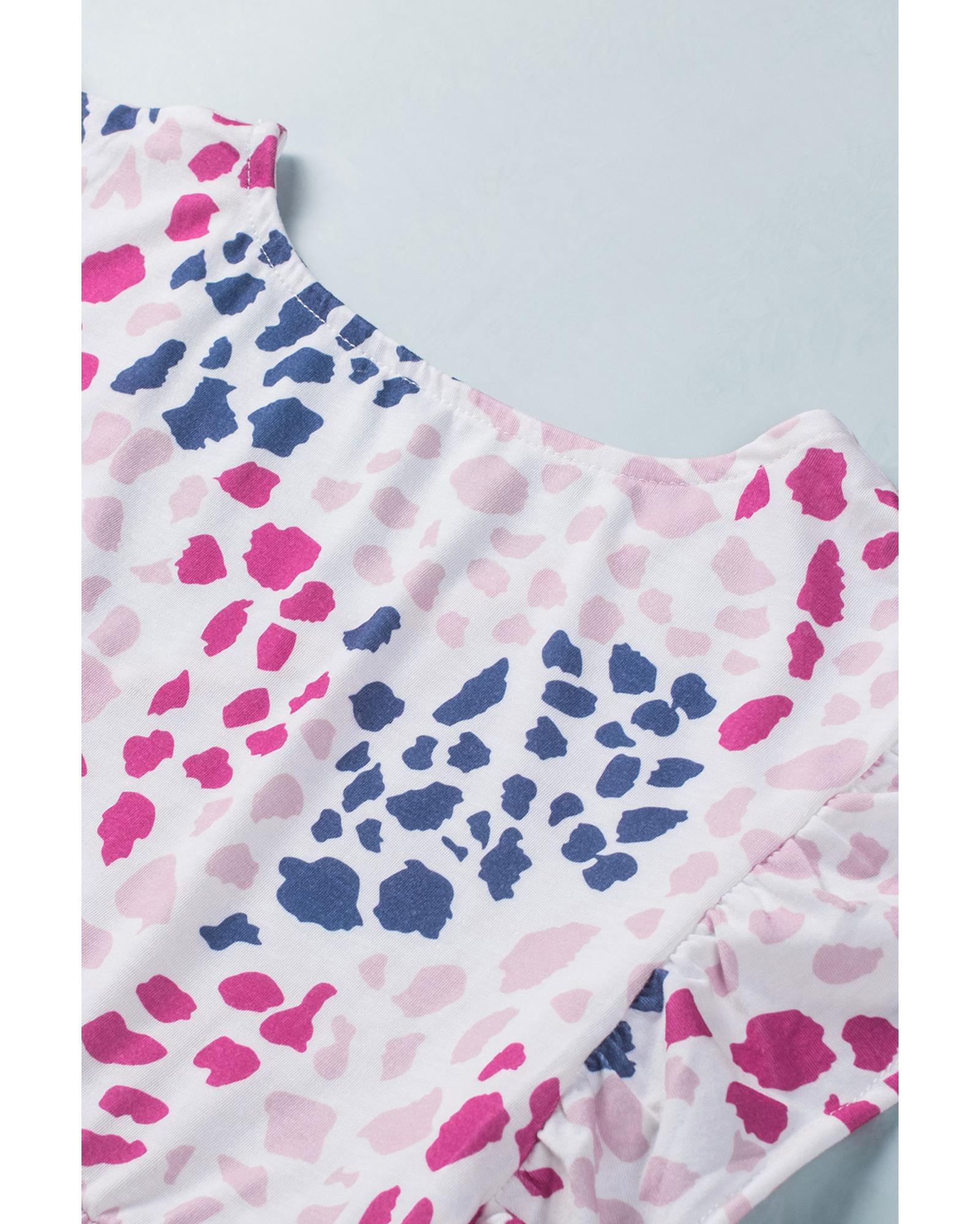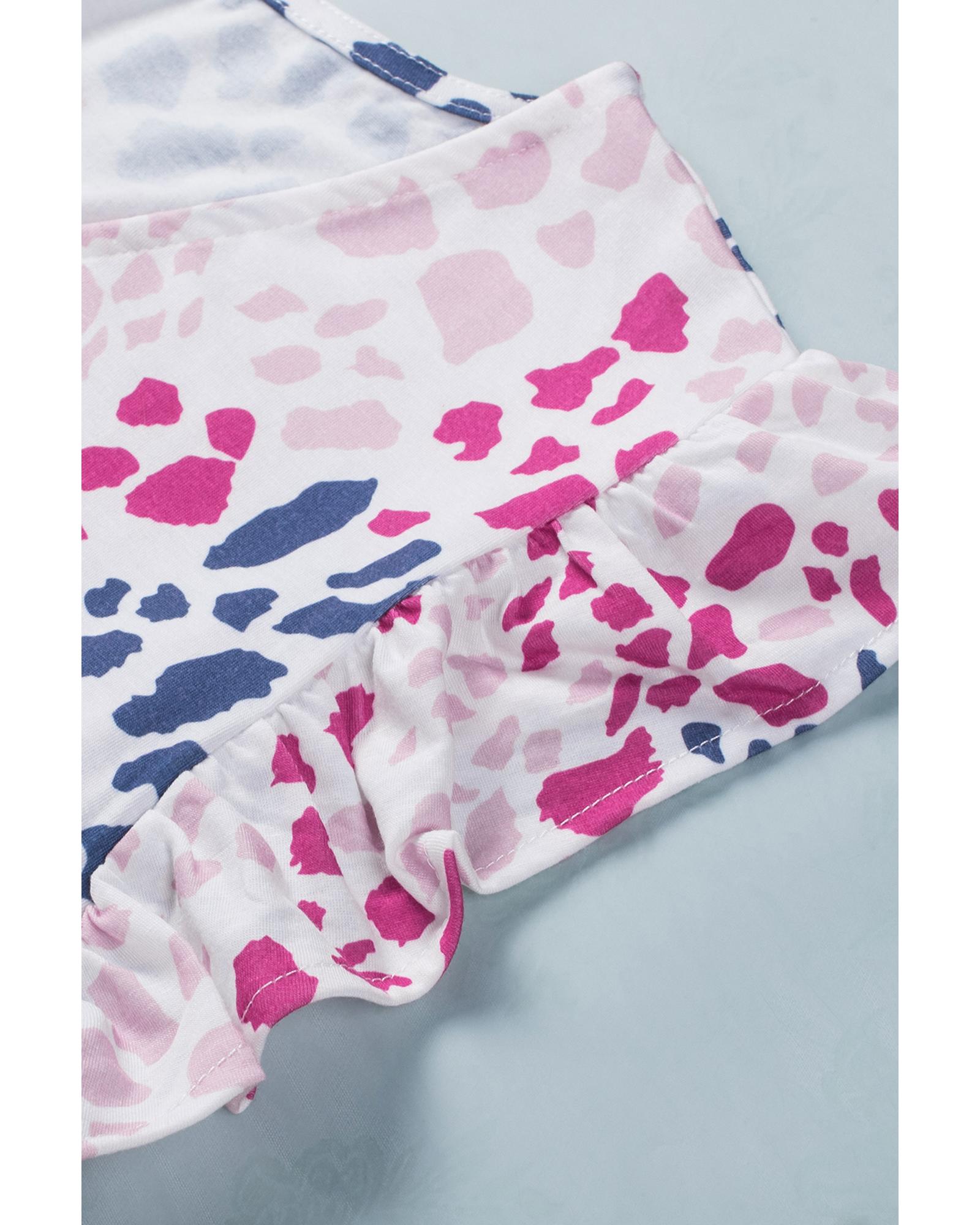 This spotted print ruffled v-neck tank top combines trendy fashion with a comfortable fit, making it a versatile addition to any wardrobe. Its stylish leopard pattern and ruffled design highlight a fashionable and feminine look, perfect for casual outings or layered styles.