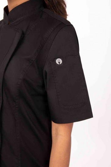 This chef jacket combines a modern urban style with functional features designed for comfort and efficiency in the kitchen. It offers a stylish appearance while incorporating cooling and practical elements to support busy culinary environments.