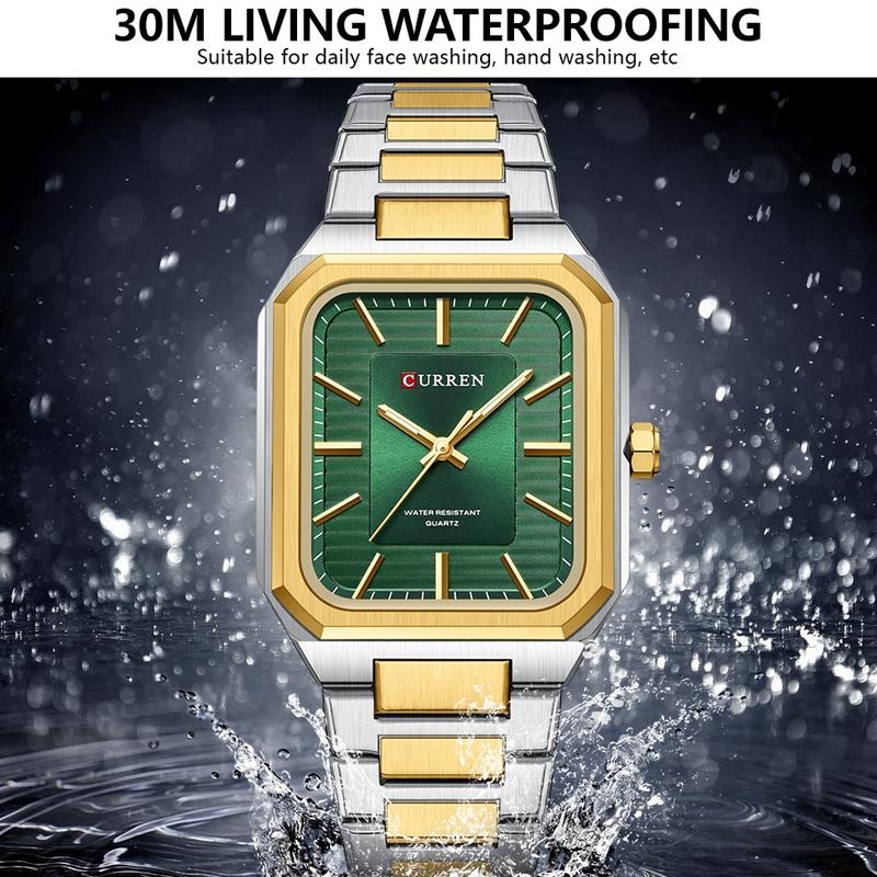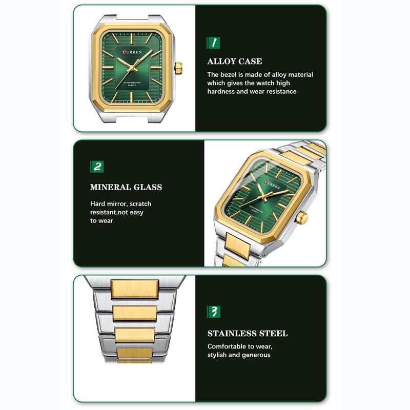 This is a square steel strap men’s quartz watch designed for business occasions. It features a unique square dial and is constructed from durable alloy and stainless steel materials. The watch is equipped with a wear-resistant glass surface, a screw crown for easy adjustment, and a quartz movement for precise timekeeping. Its lightweight design ensures comfortable wear throughout the day.