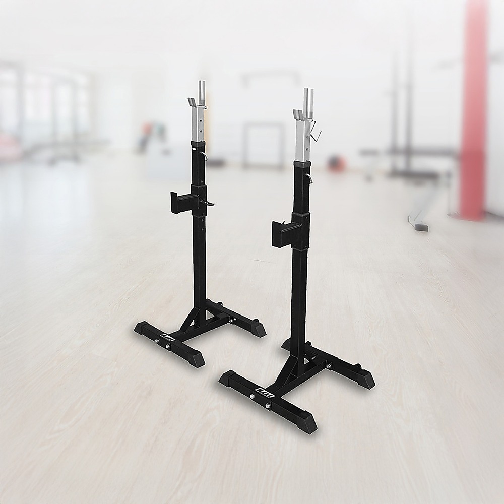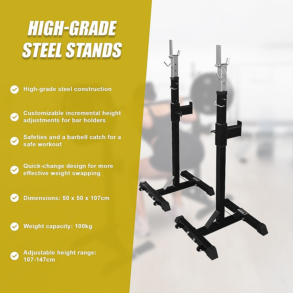 This set includes a pair of squat stands designed for home gym use, providing a sturdy and adjustable platform for weightlifting exercises. Constructed from high-quality steel, these stands offer stability and durability, making them suitable for various strength training routines without the need for machines.