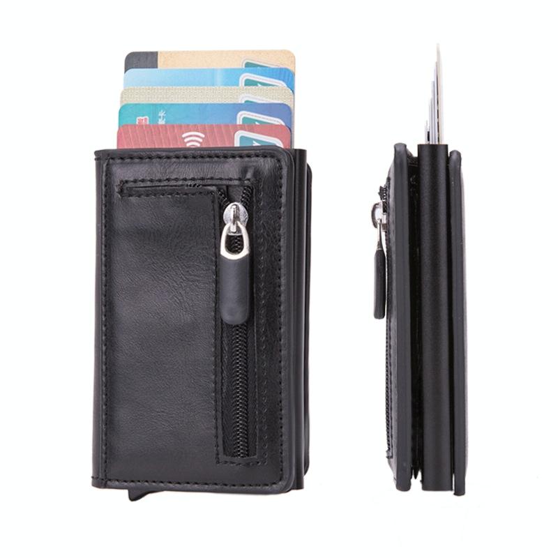 This stainless steel RFID credit card holder features a compact design with a wood grain apricot finish, combining style and functionality. It offers easy access to cards with a single dial side button and provides RFID protection to safeguard personal information. The holder is designed to be simple, elegant, and convenient for everyday use.