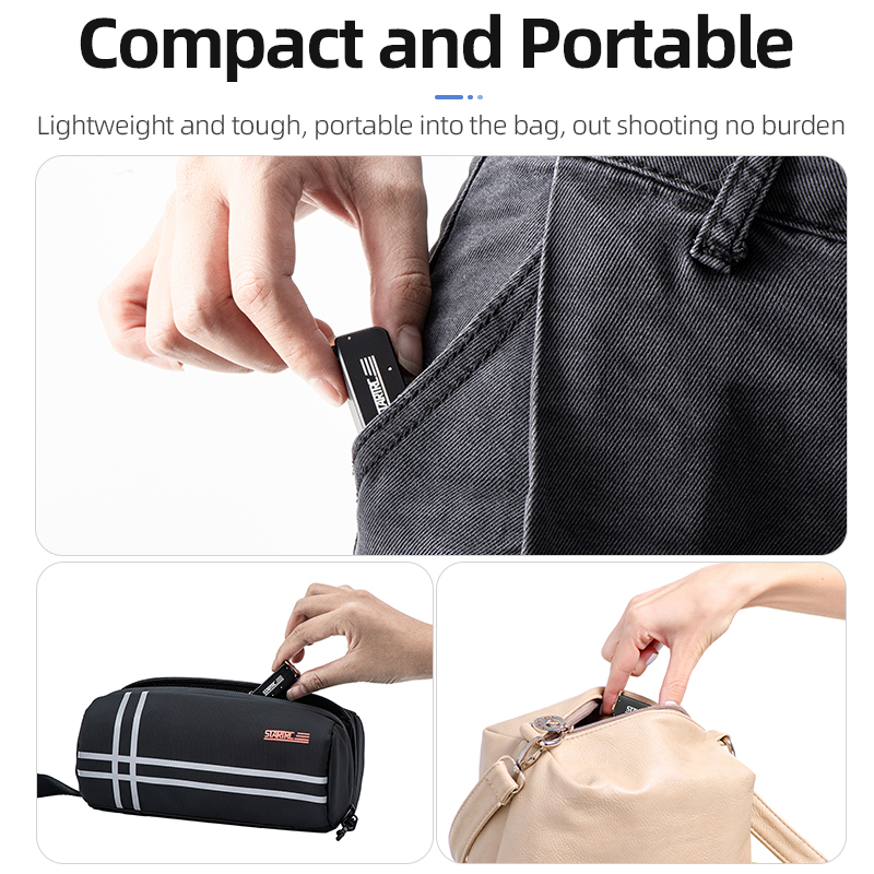 Product specifications include a compact size suitable for portable use, with materials chosen for strength and lightweight performance. The adapter ensures a secure fit and stable connection during filming activities.