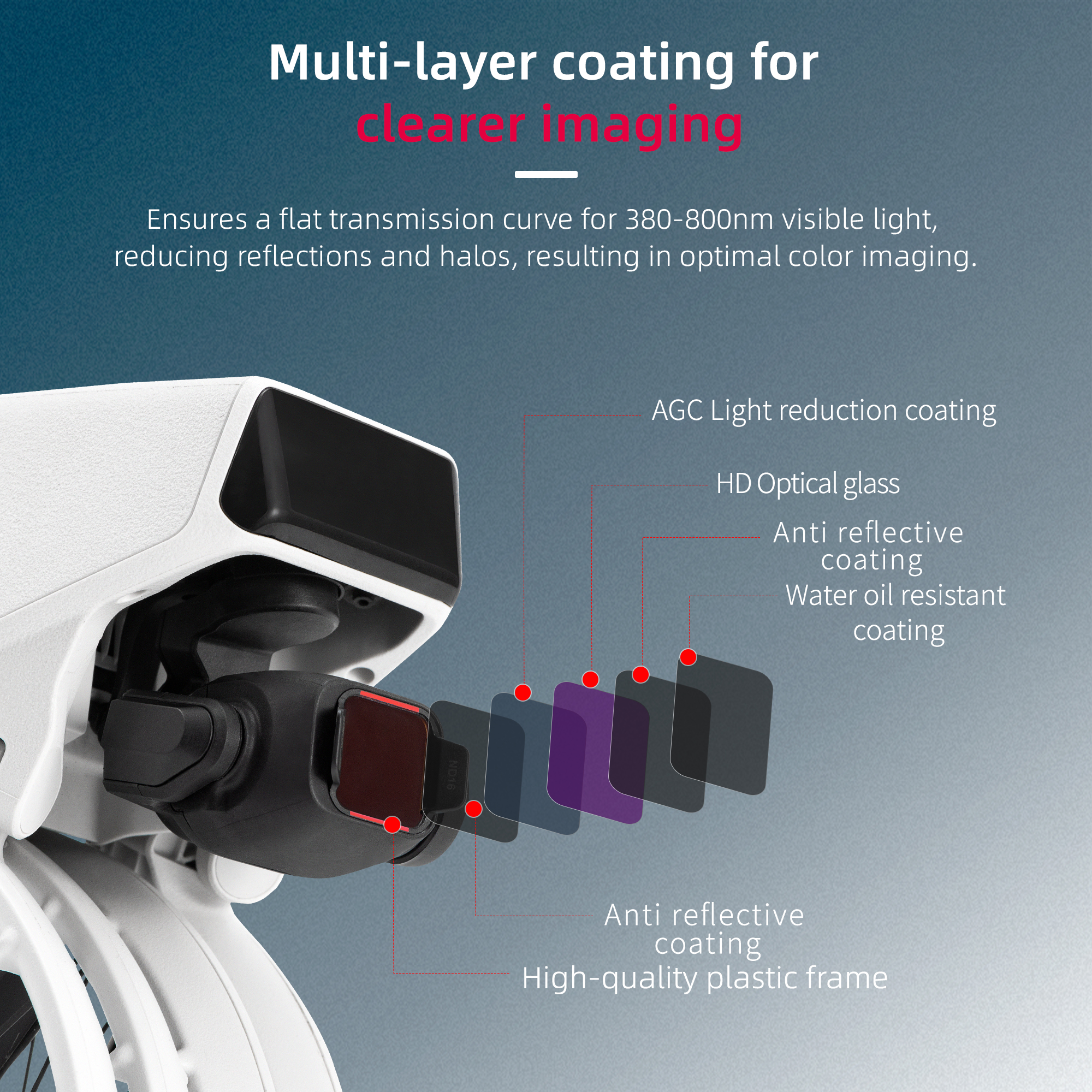 This filter set is designed specifically for drone cameras with flip lenses, providing protection and ensuring clear image capture during aerial photography. It includes multiple filters to help improve image quality in various lighting conditions and enhances color saturation and contrast for more vivid photos.