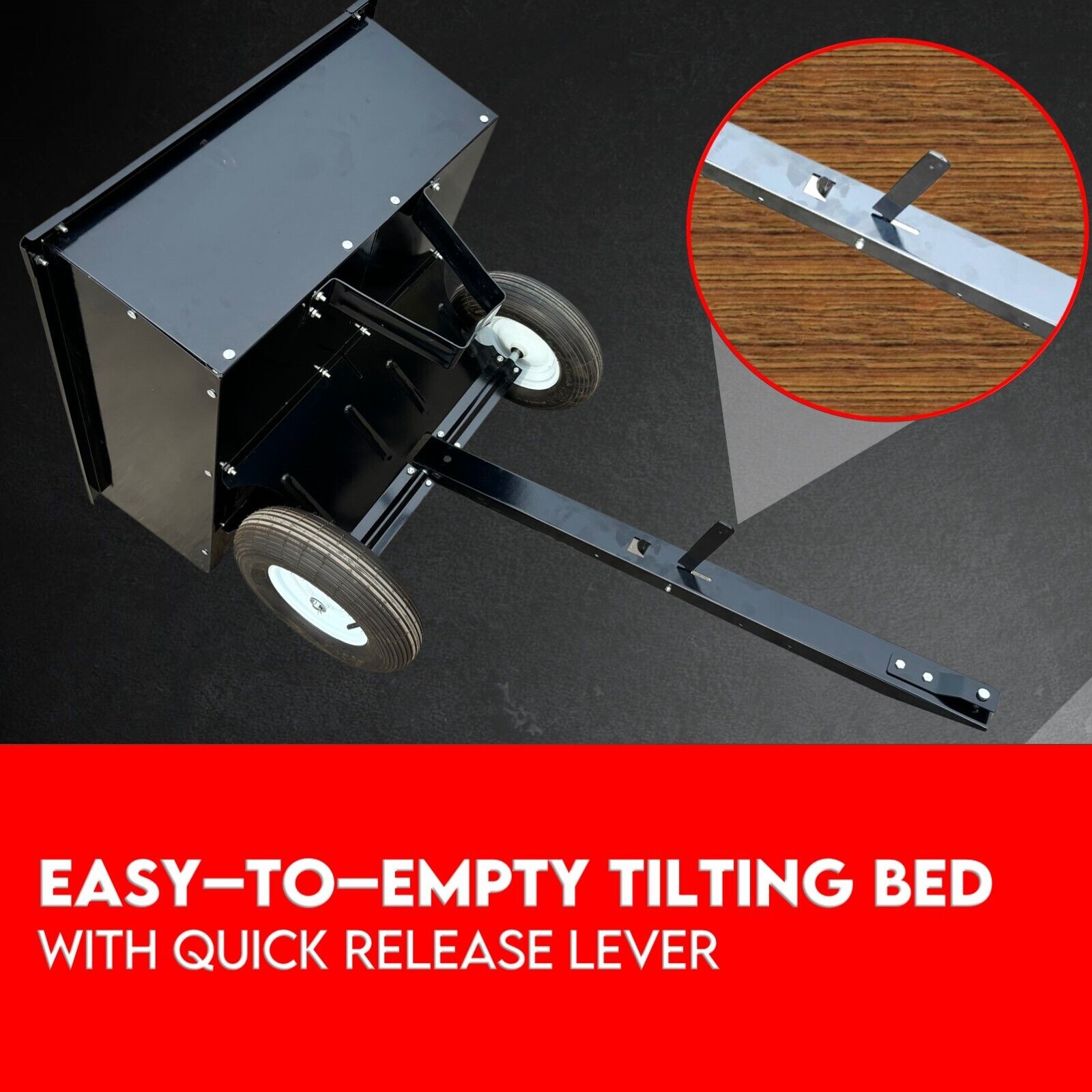 The cart is built with a sturdy steel frame and bed to handle tough jobs. It has a rust-resistant, powder-coat finish to ensure durability over time. The pneumatic tires provide a smooth ride across different terrains, including gravel, fields, and small creeks. The universal hitch allows for easy attachment to various lawn tractors, and the removable tailgate simplifies loading and unloading processes.