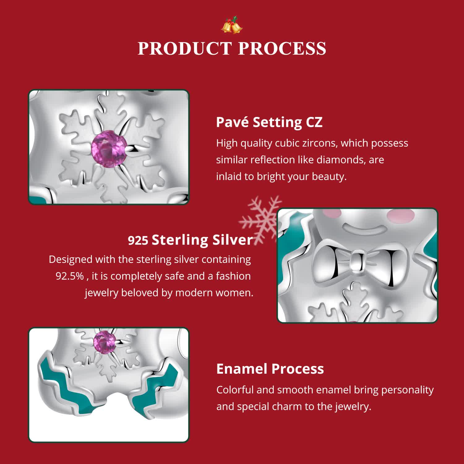 This festive charm is crafted from genuine sterling silver and features a detailed gingerbread man design with colorful accents and snowflake engravings. It is a charming accessory suitable for various jewelry pieces and makes a thoughtful gift for holiday celebrations or special occasions.