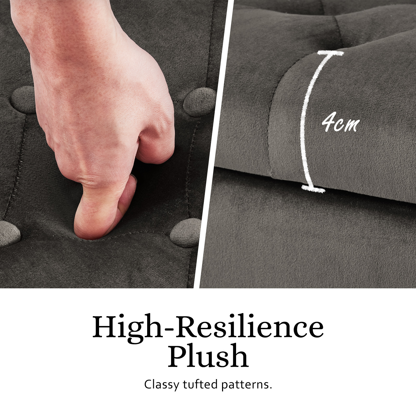 This storage ottoman combines style and functionality, making it a versatile addition to any living space. Upholstered in soft velvet and cushioned with foam, it offers a comfortable seat while providing ample storage inside. Supported by sturdy wooden legs, it features a classic design with modern touches, including tufted detailing on the top surface.