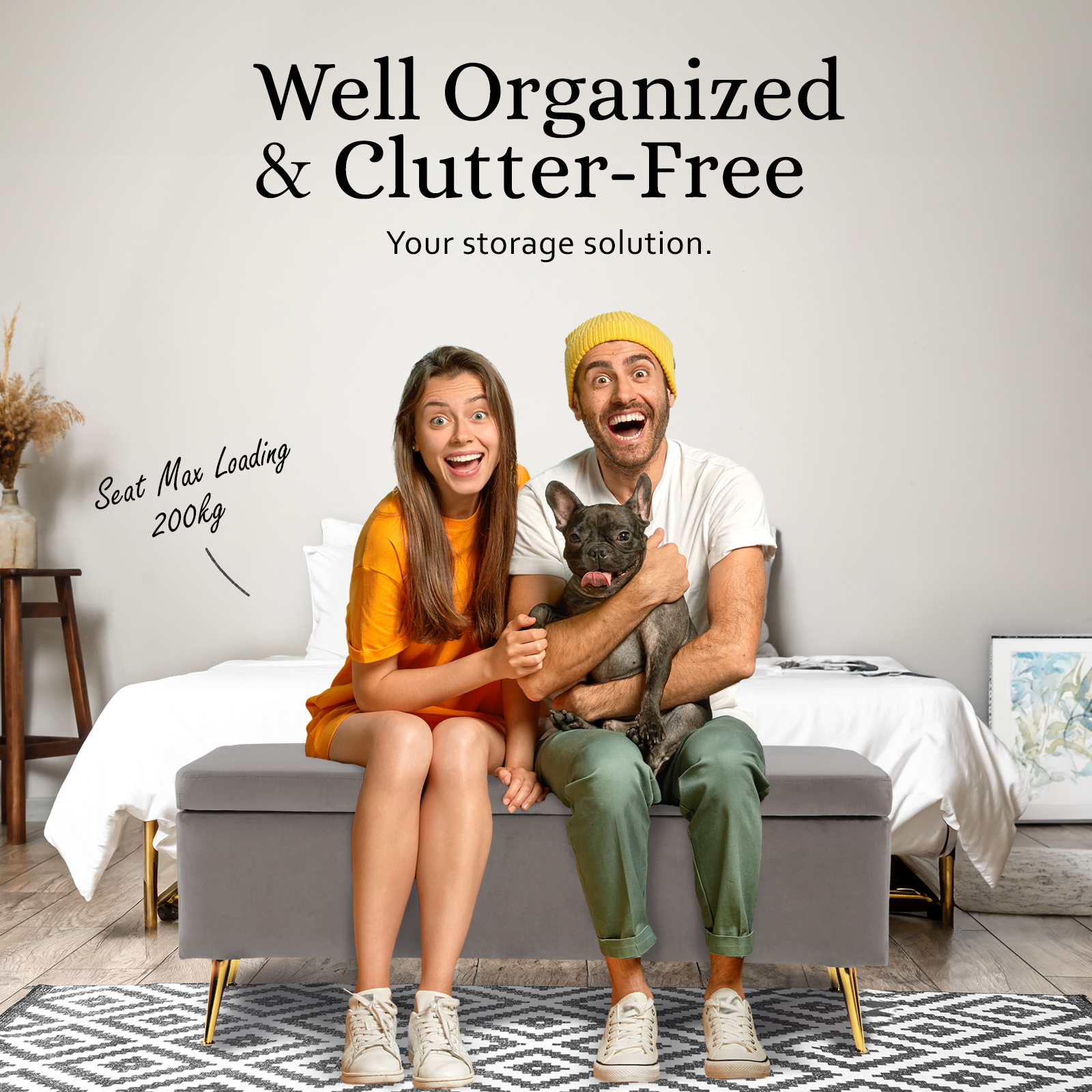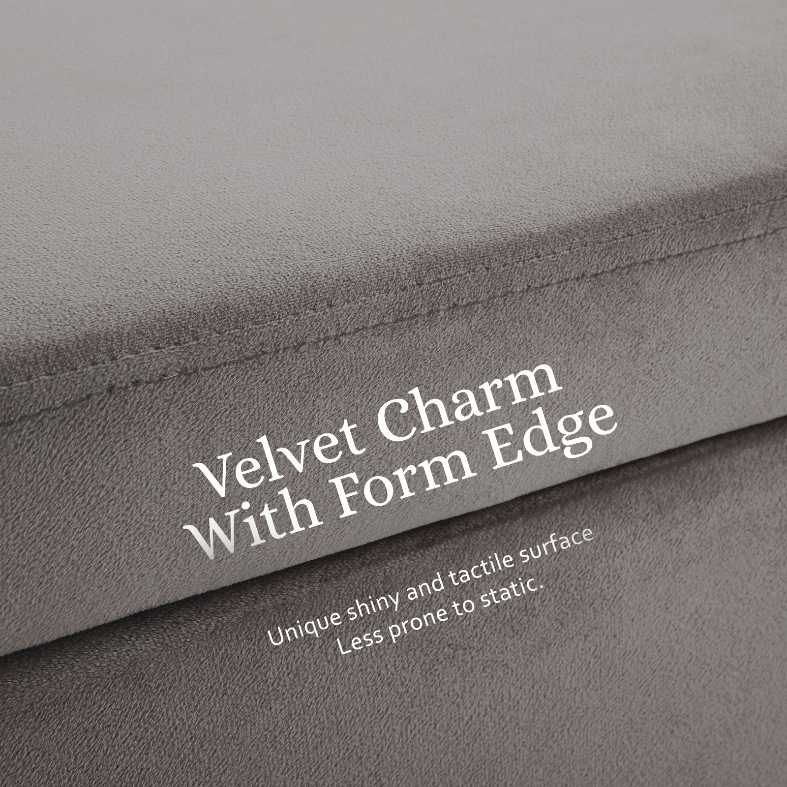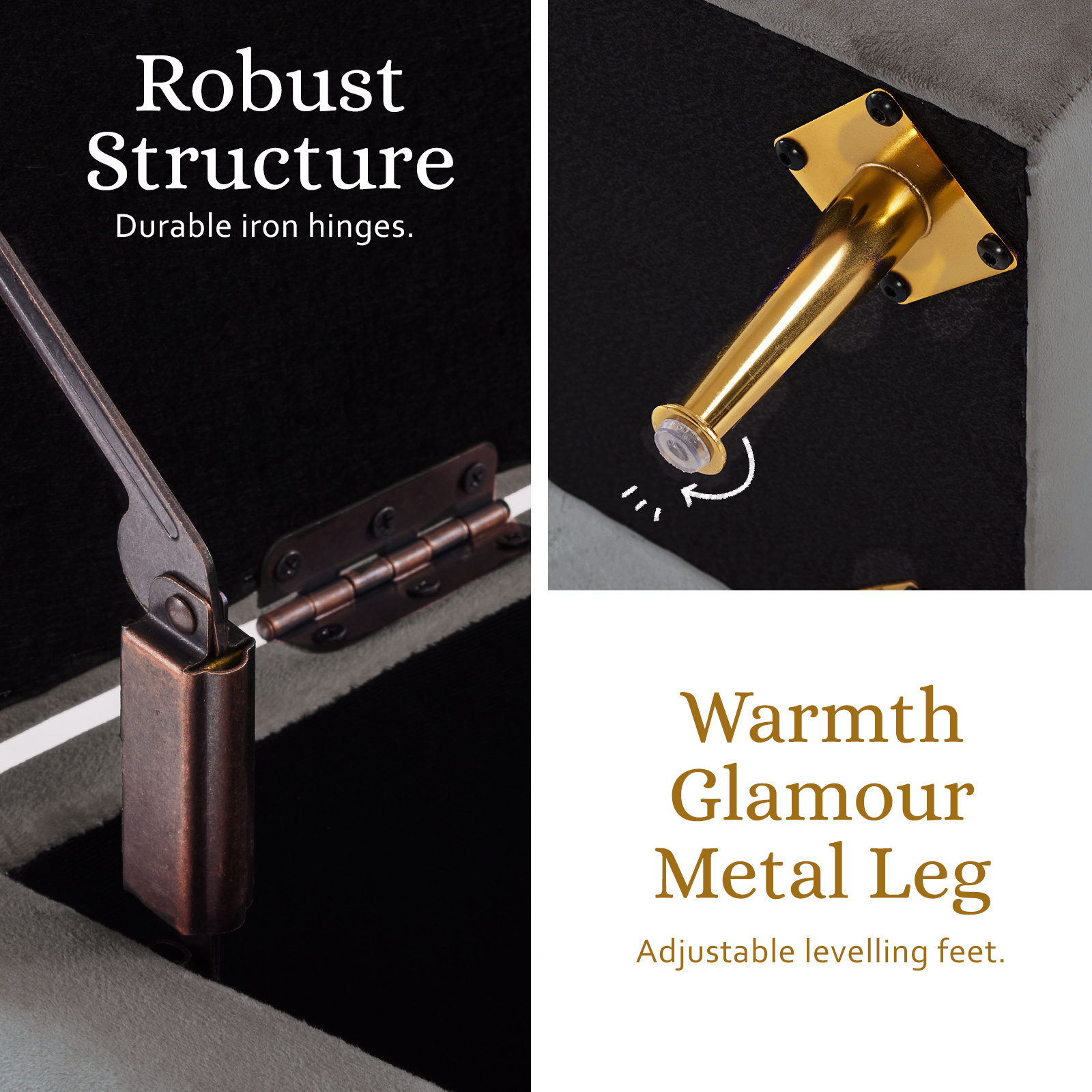 This storage ottoman stool bench seat combines luxury and practicality, making it a versatile addition to your living space. Upholstered in plush velvet, it offers a sophisticated appearance with a soft, inviting feel. The design includes a lift-up lid revealing a spacious interior, ideal for discreet storage of blankets, pillows, or other items. Its sturdy metal legs provide stability, and the detachable feature allows for easy customization. Suitable as a footrest or extra seating, this ottoman is both functional and stylish.