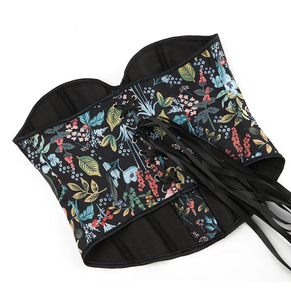 This strapless and backless corset top is designed for women, featuring a front 5 busk closure and lace-up boning for a secure fit. Made with knit weaving craft and a print pattern, it offers a simple yet stylish look suitable for various occasions. Crafted from a blend of polyester and spandex, it provides comfort and flexibility. Available in black and in sizes from small to 6XL, it is ideal for everyday wear, parties, dates, and work settings. The height of the top is approximately 30 centimeters or 11.81 inches.