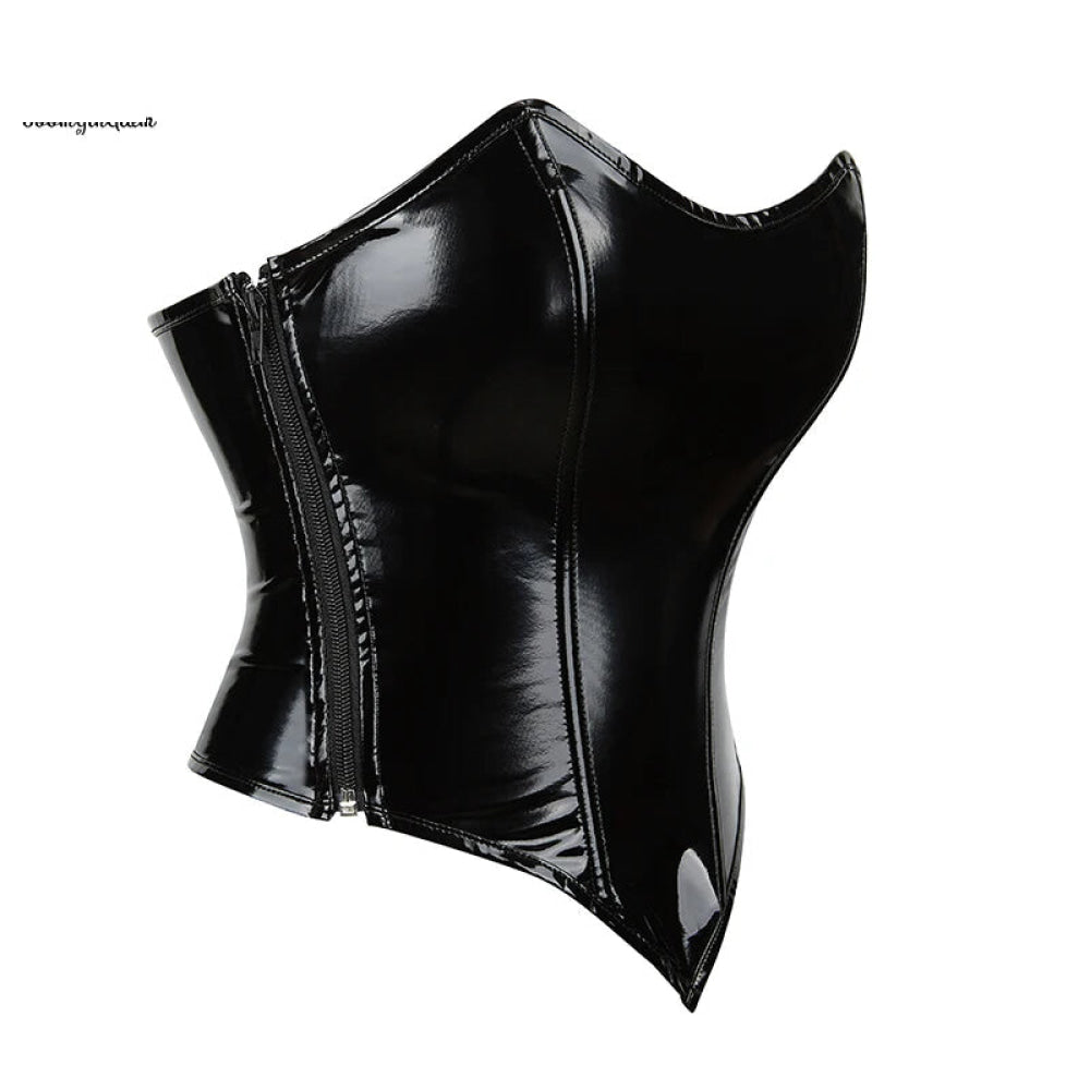 This strapless bustier corset crop top is designed for a stylish and comfortable fit, suitable for various occasions including parties, dancing, and everyday wear. It features a shiny synthetic leather material with a simple print pattern, offering a sleek and minimalistic look. The top is constructed with support in mind, incorporating plastic bones for added stability and shape.