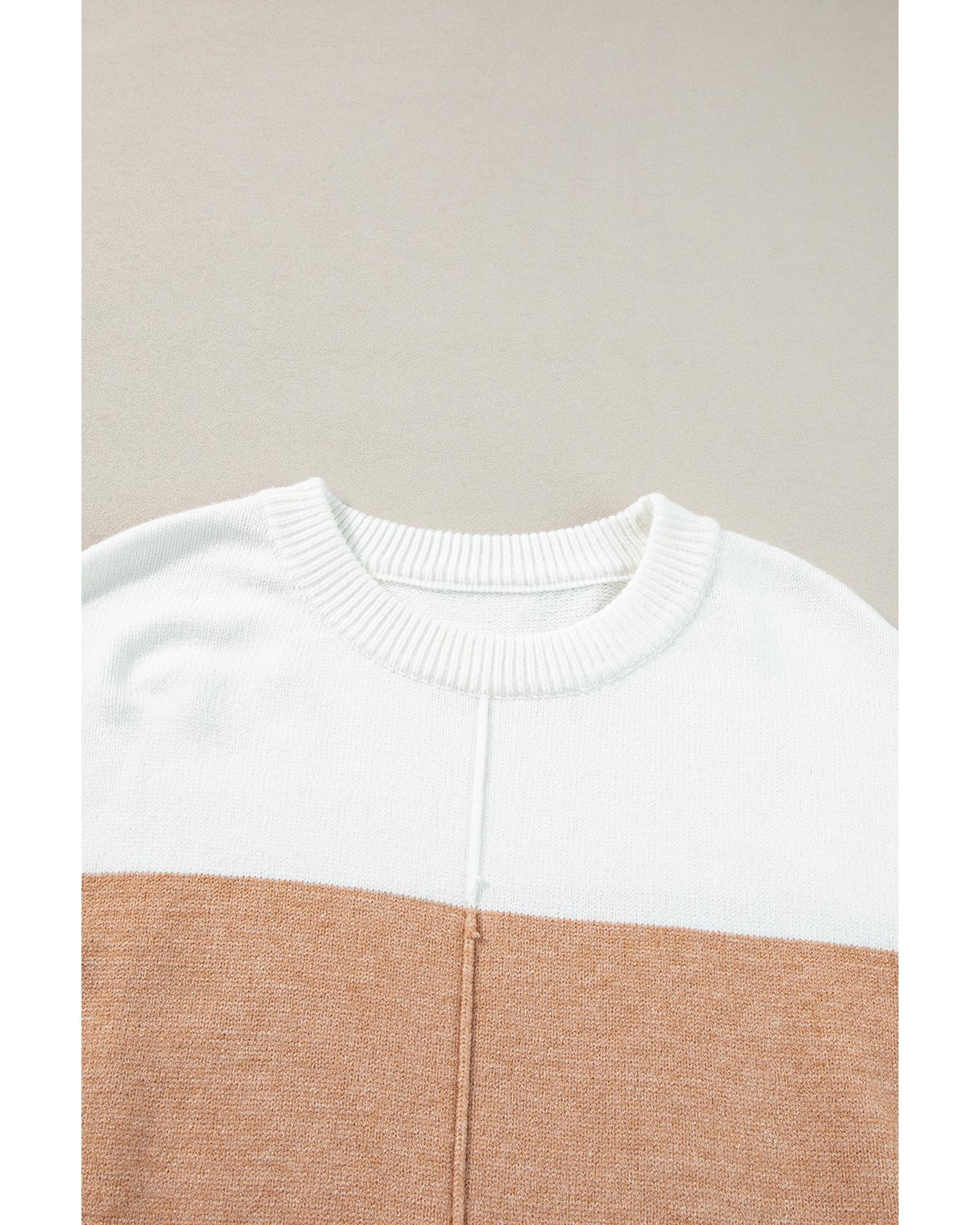 This Straw Yellow Colorblock Ribbed Trim Round Neck Sweater offers a stylish and comfortable option for cold seasons. Designed with a trendy fitted look, it features a colorblock pattern and ribbed trim for added structure. Made from soft, high-quality materials, it provides cozy warmth and a fashionable appearance.