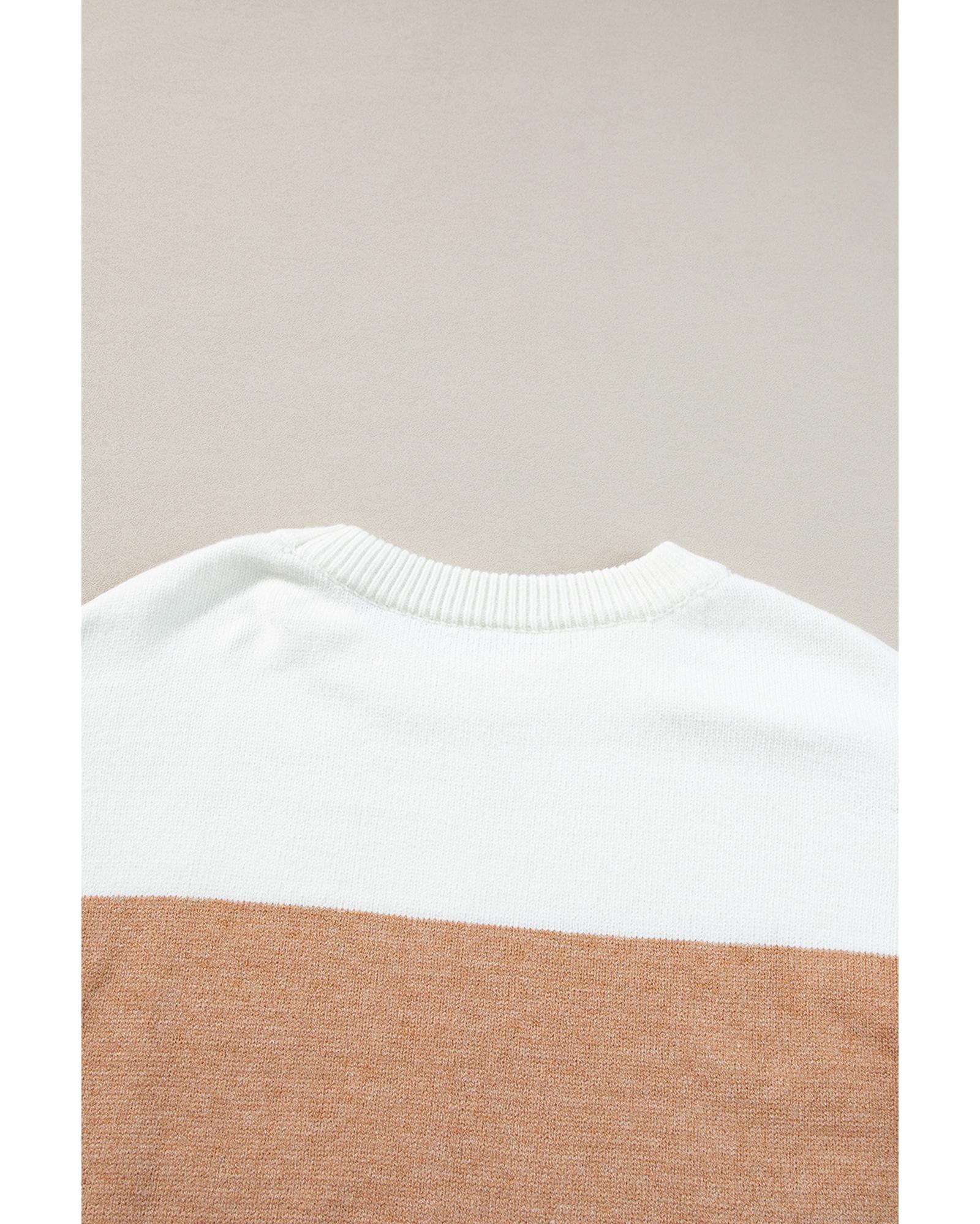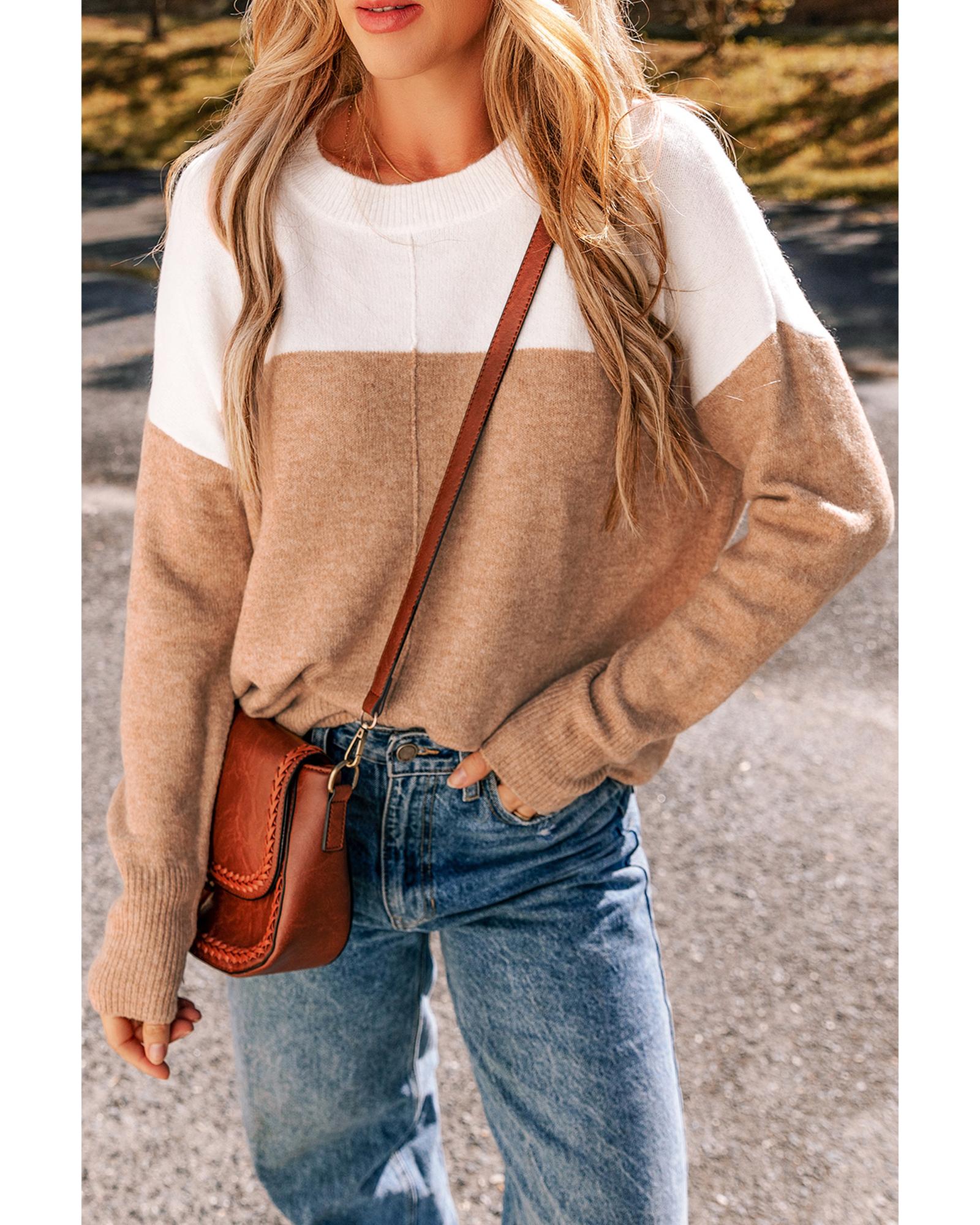 This sweater features a stylish colorblock design with a round neckline and ribbed trim, offering a cozy and high-quality feel. Its soft fabric makes it ideal for cold seasons, combining comfort with a trendy fitted look.