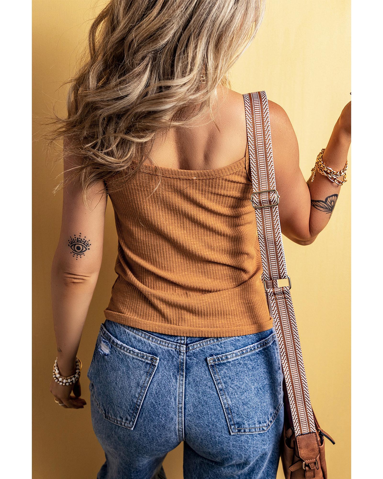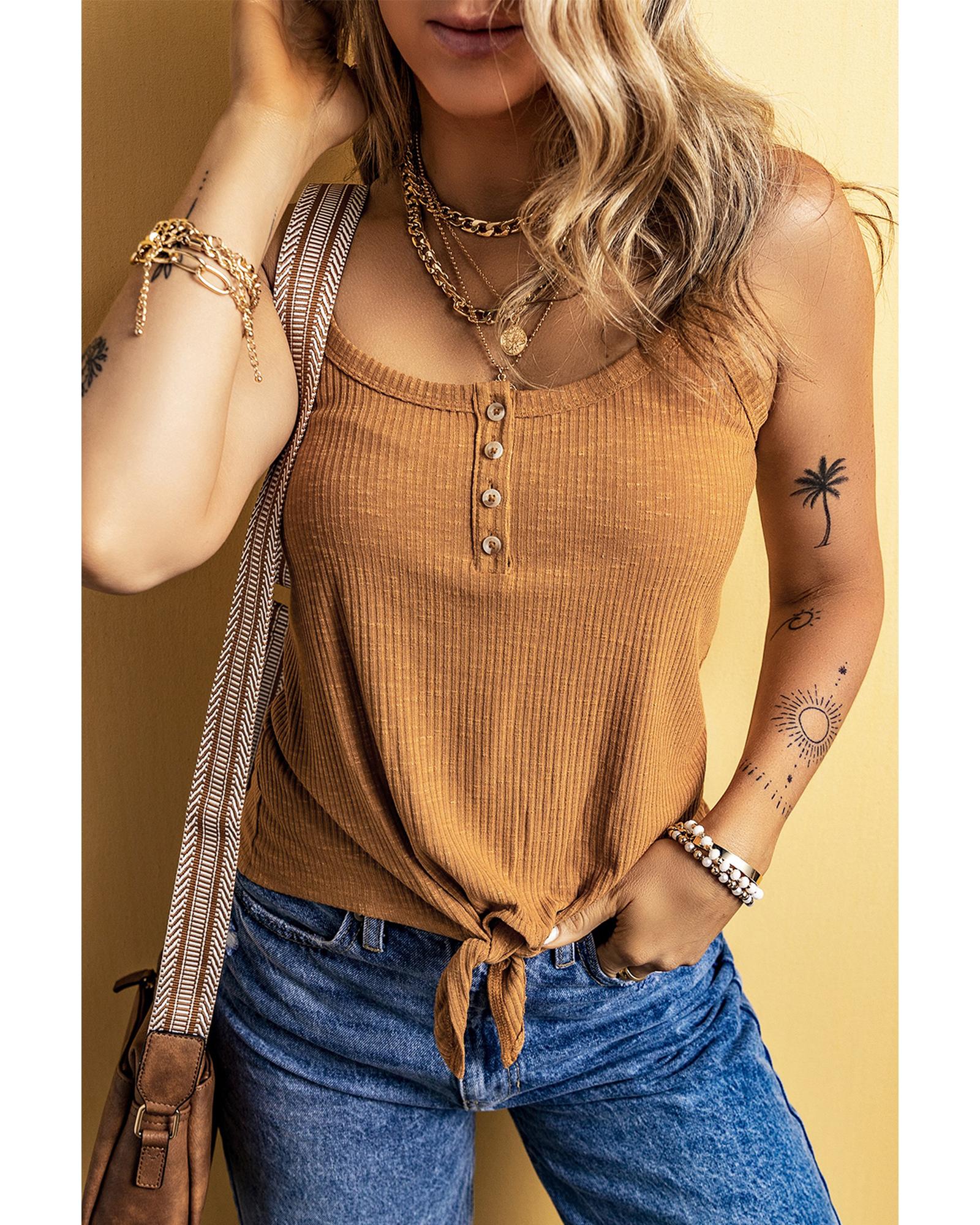 This tank top features a stylish ribbed texture and a front knot detail that adds visual interest. The spaghetti straps and buttoned neckline contribute to a sophisticated and trendy look, making it suitable for casual or semi-formal occasions.