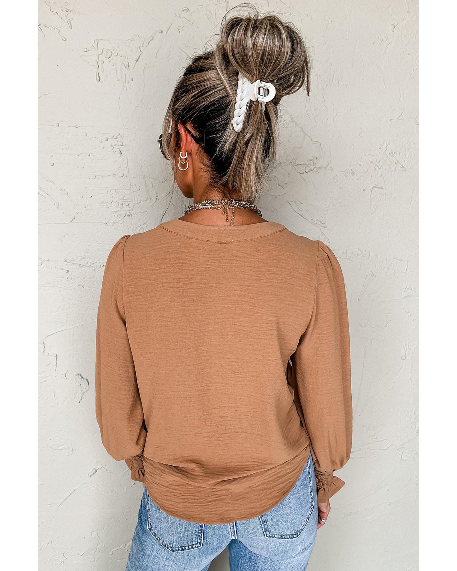 Straw Yellow Solid Color Shirred Cuff Notch V Neck Blouse – S