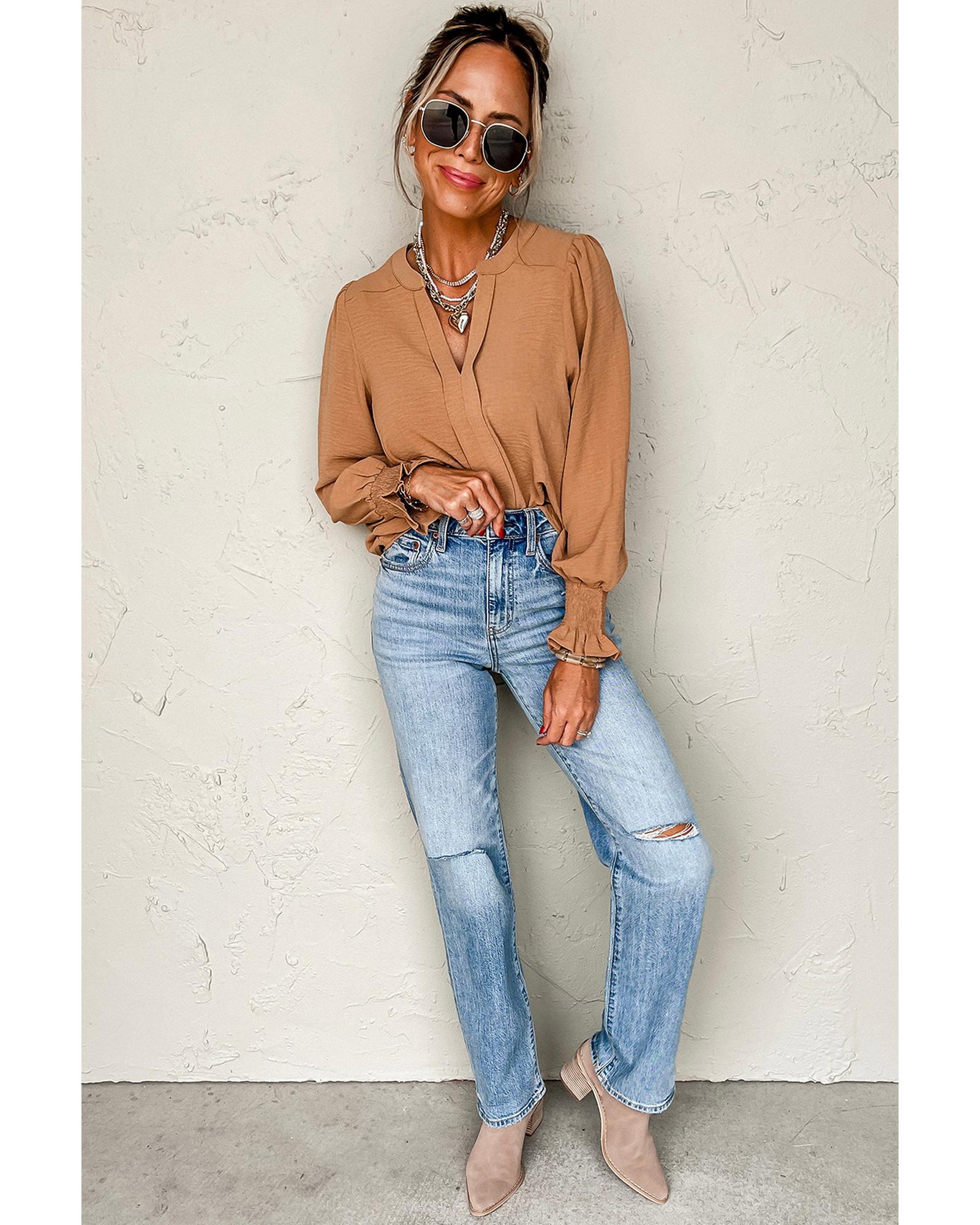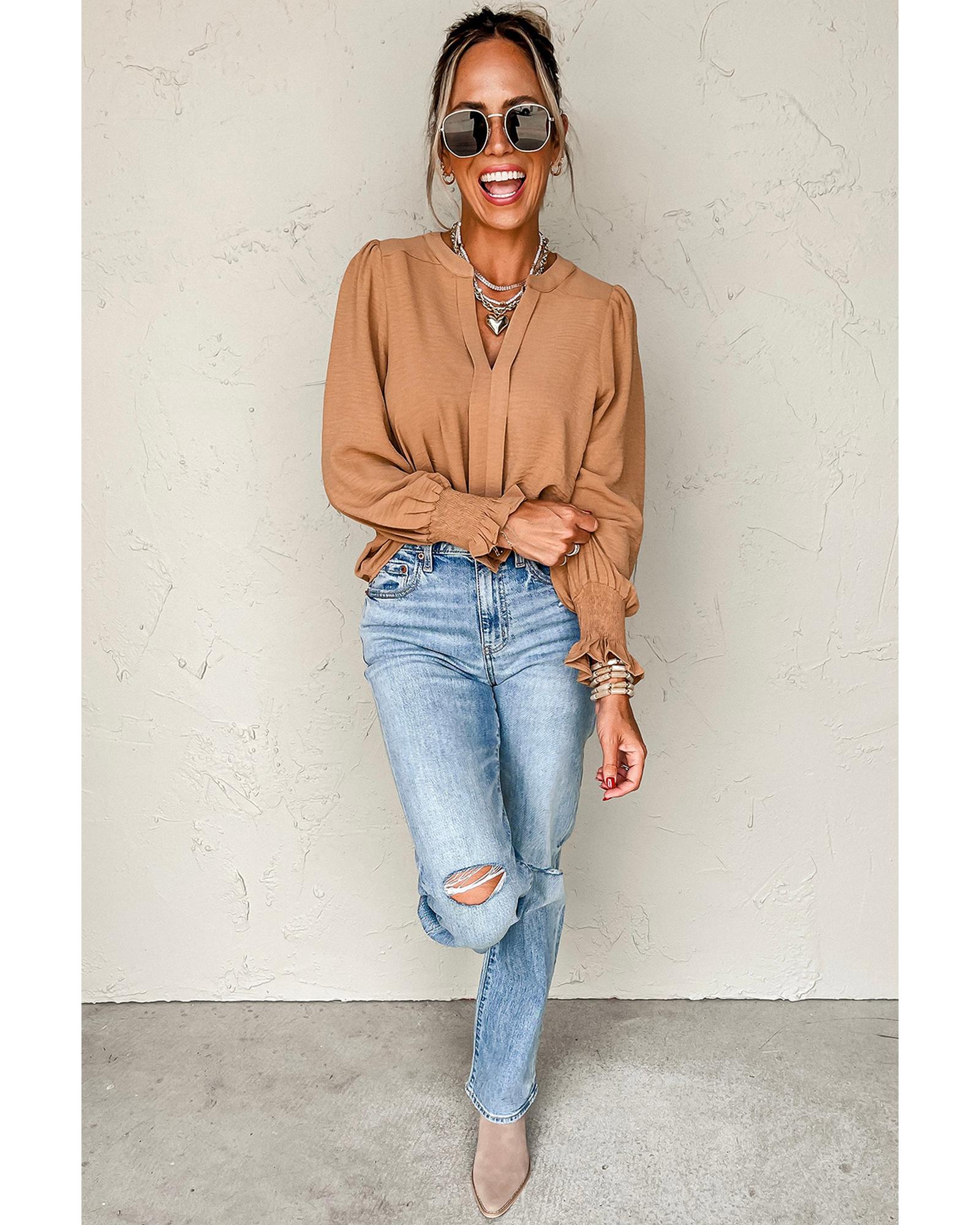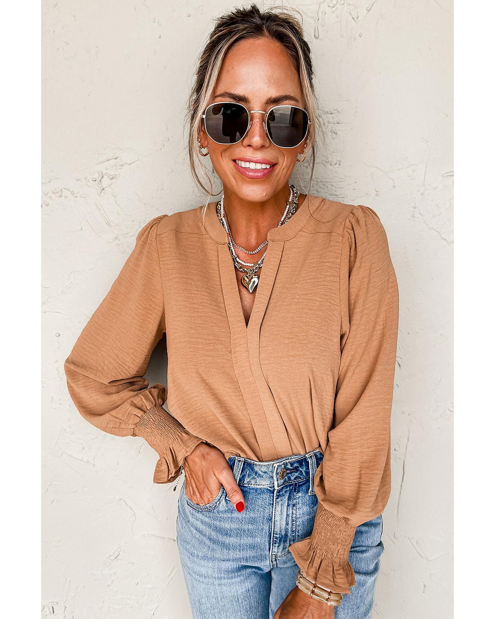 Straw Yellow Solid Color Shirred Cuff Notch V Neck Blouse – XL