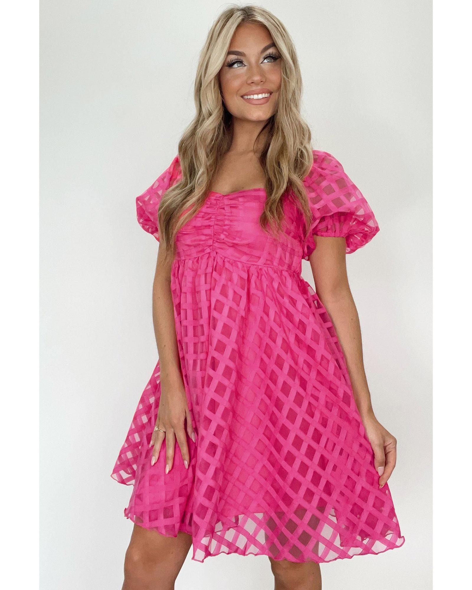 This charming pink checkered babydoll dress features a flattering flare silhouette with a graceful and timeless design. It is crafted with attention to detail, including front ruched accents and short puff sleeves, making it a stylish choice for various occasions. The dress offers a classic checkered pattern that adds a fashionable touch to your wardrobe.