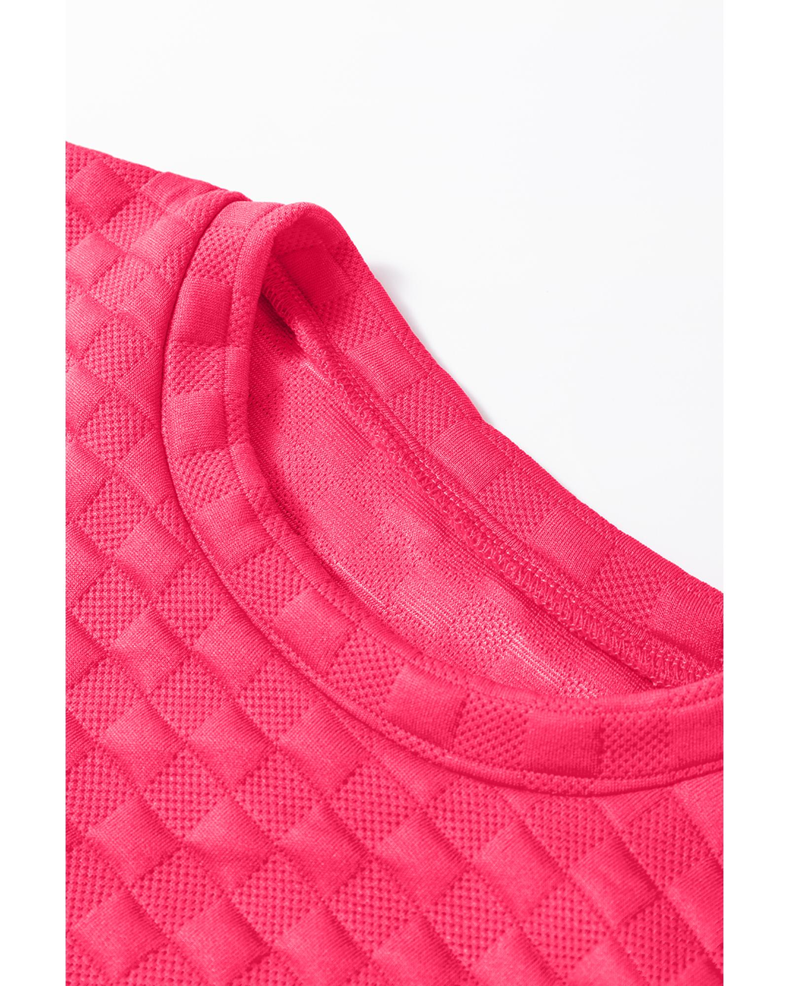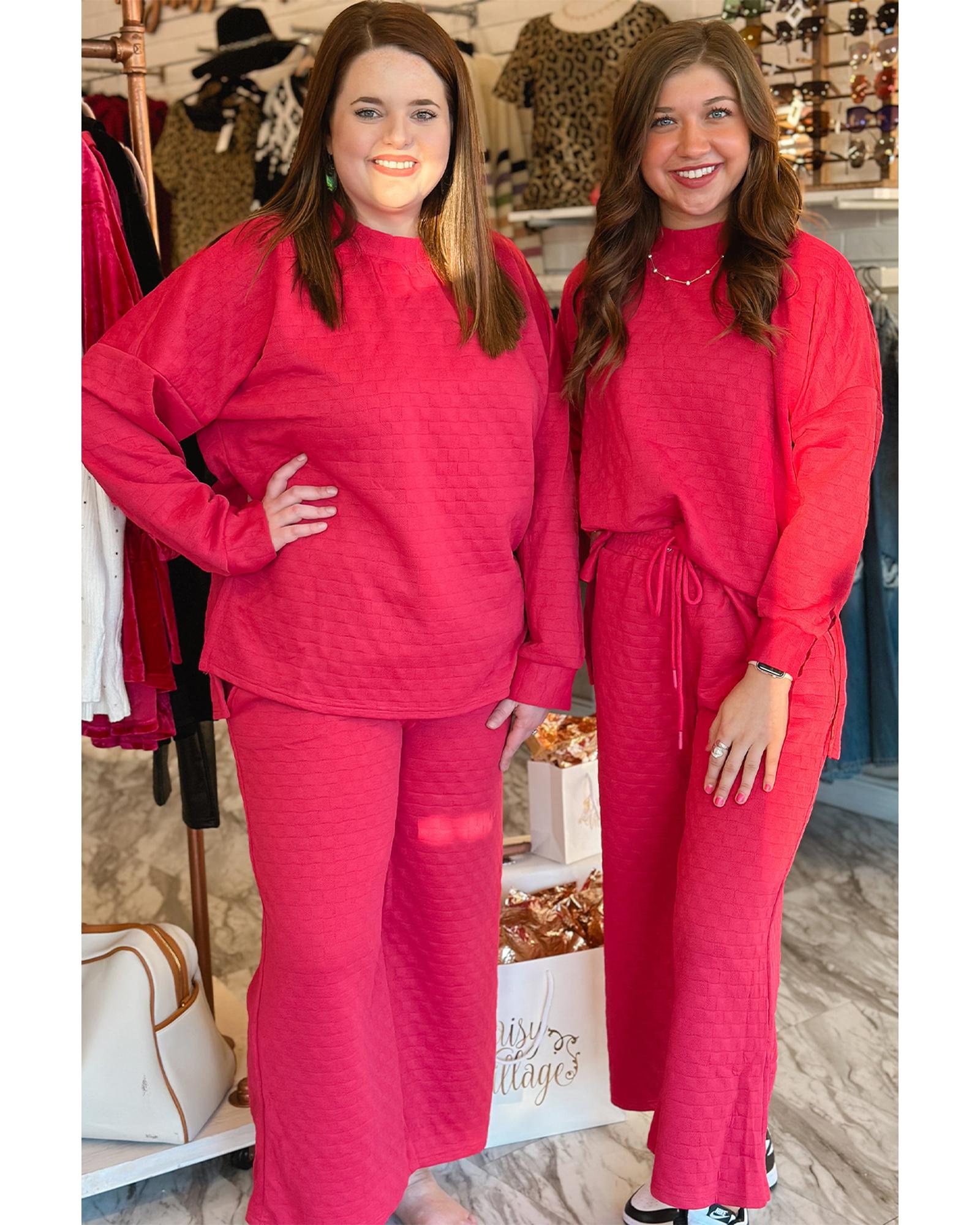 Strawberry Pink Checkered Textured Split Pullover Top and Pants Set – S