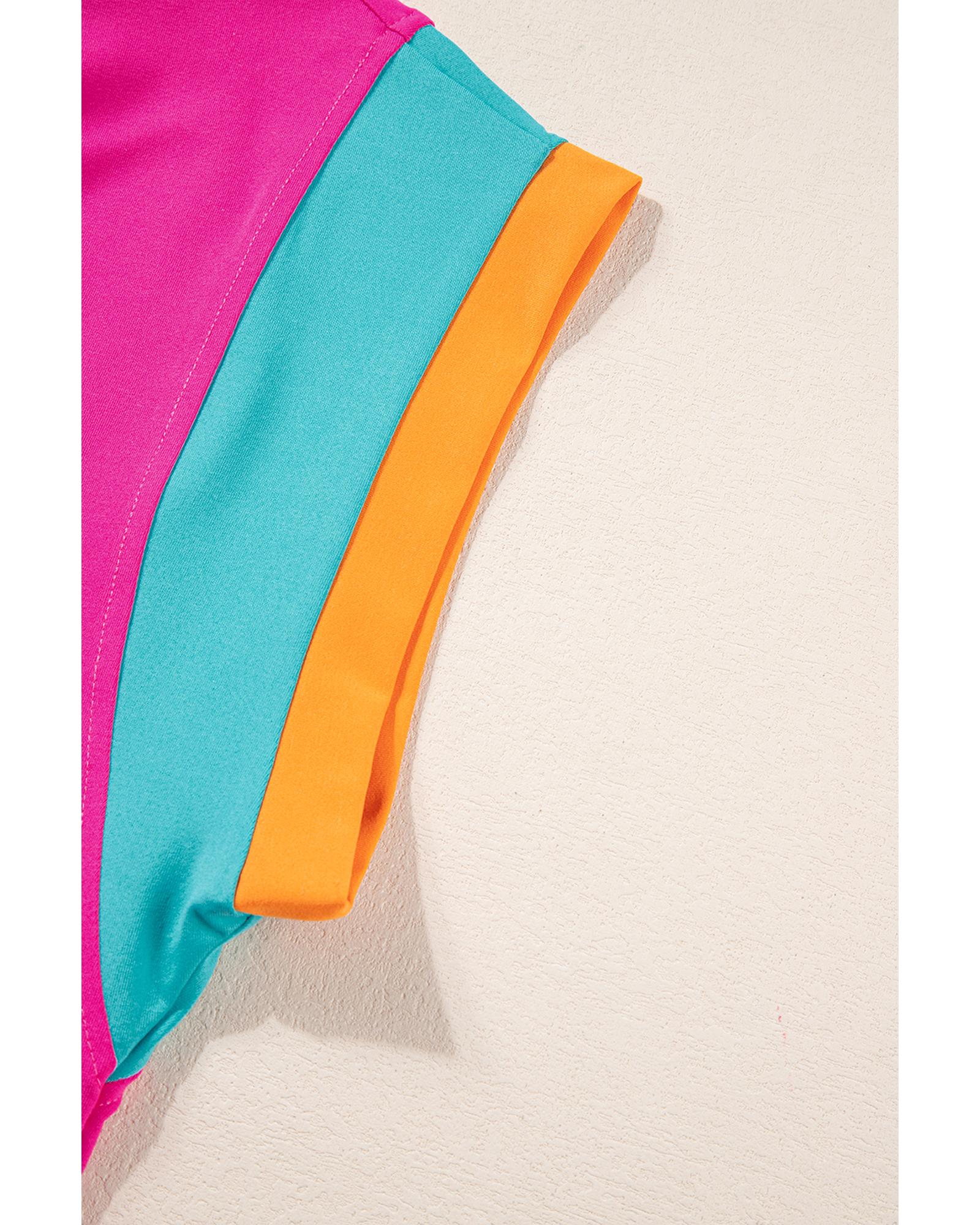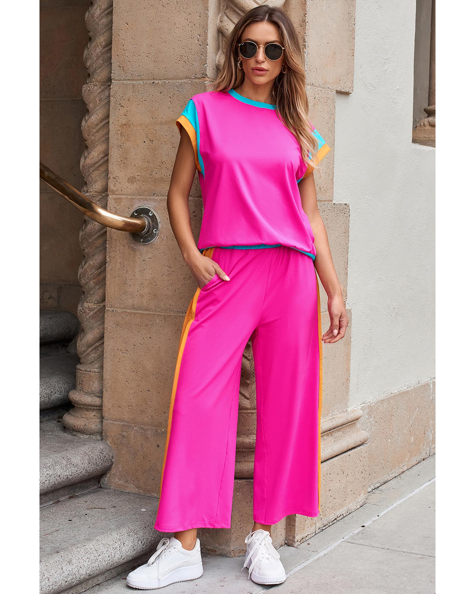 This casual two-piece set features a vibrant strawberry pink color with a stylish block detail, creating an eye-catching and trendy look. Designed for comfort and a fashionable fit, it is suitable for warm weather and various body shapes.