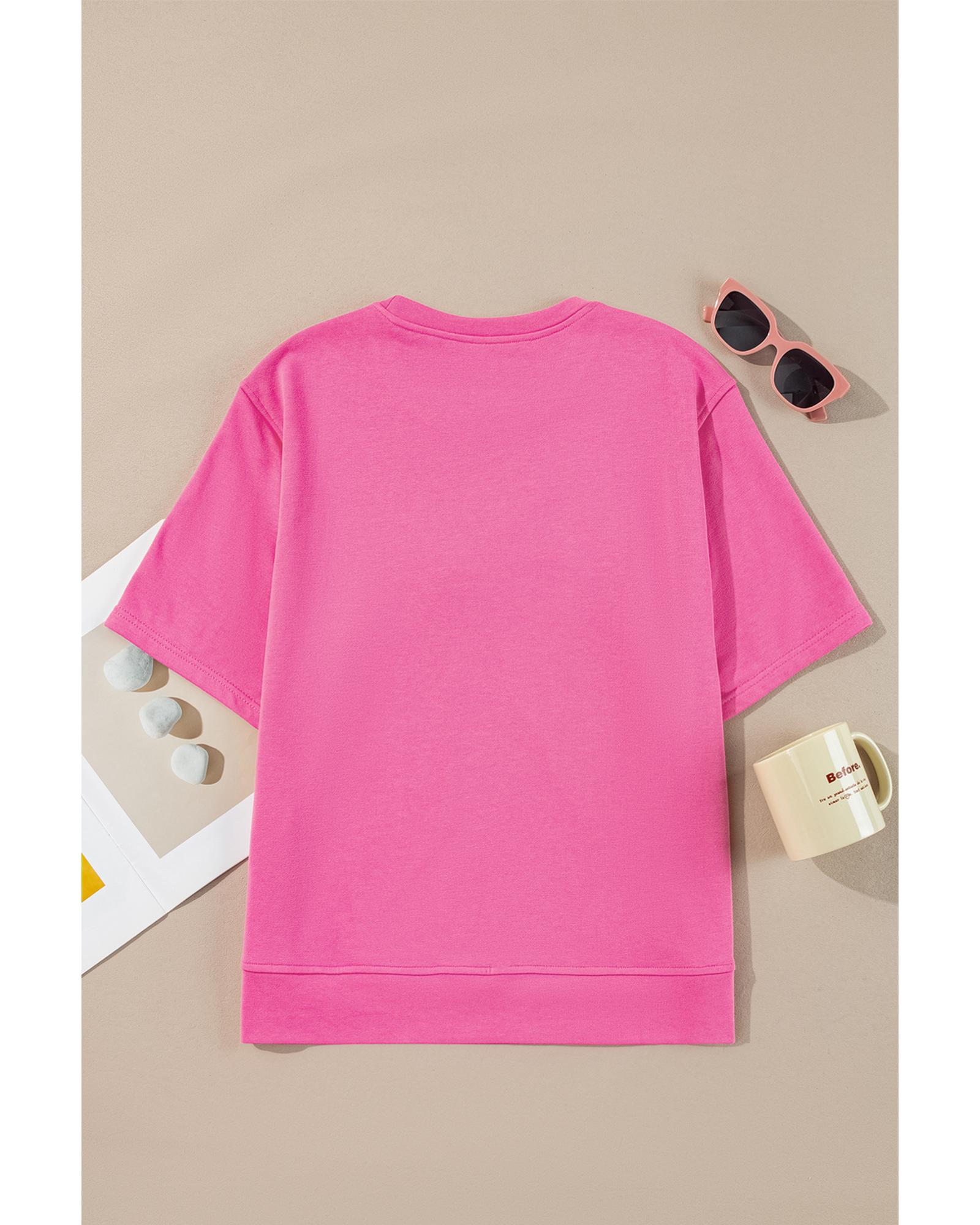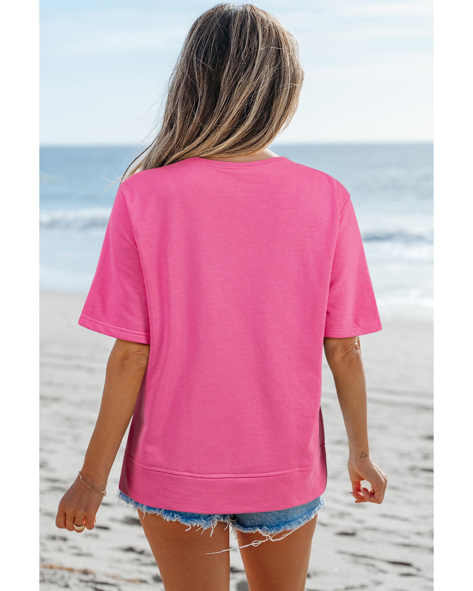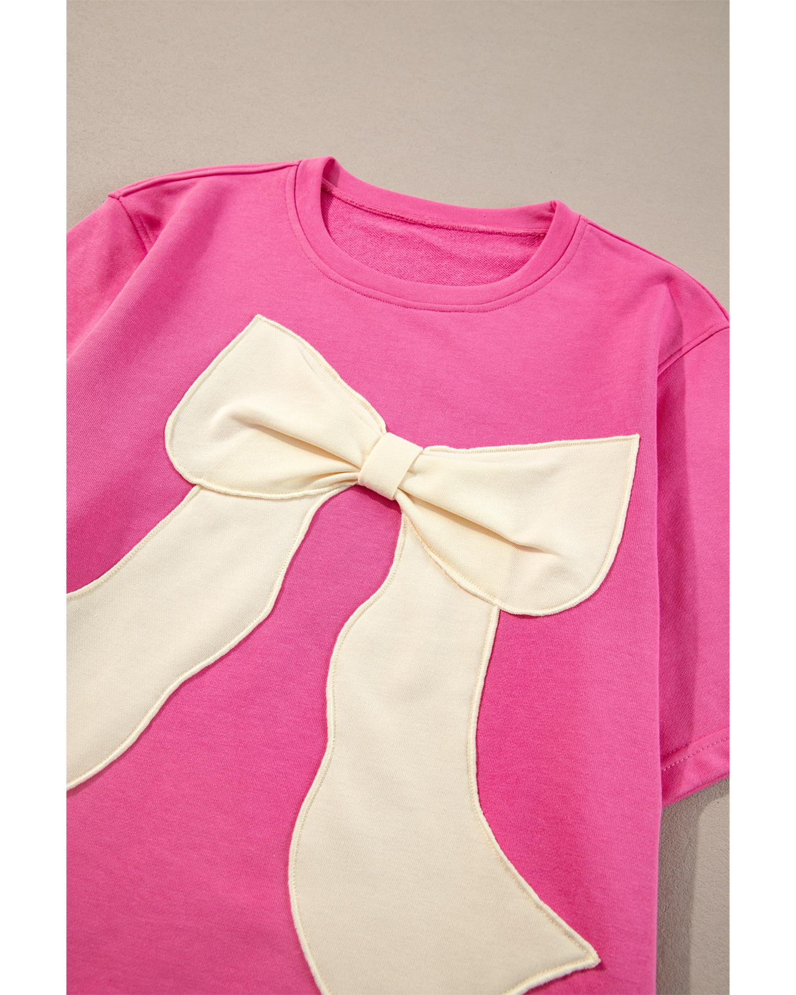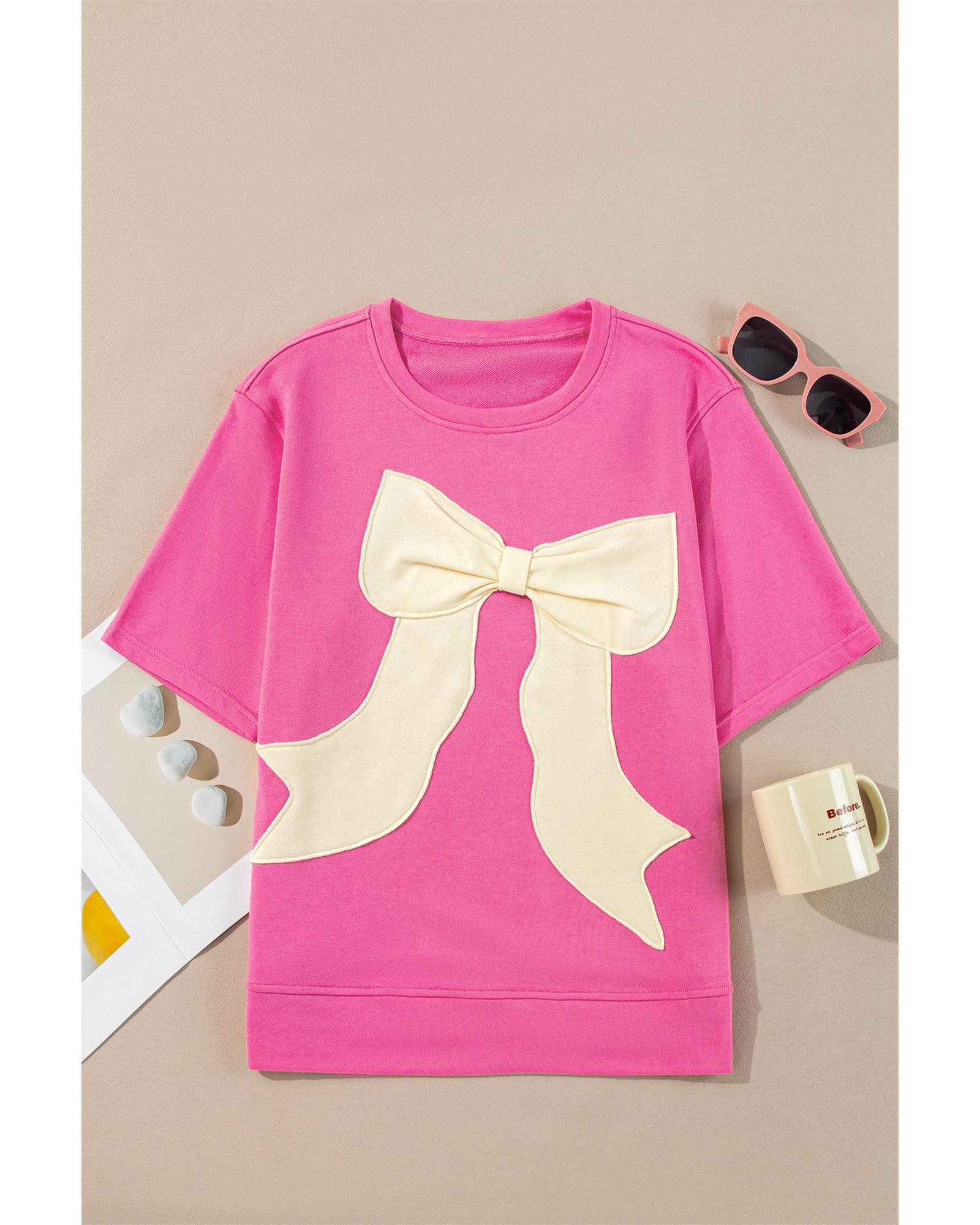 Strawberry Pink Contrasting Color Ribbon Bow Front Patch Loose Tee with Slits – M