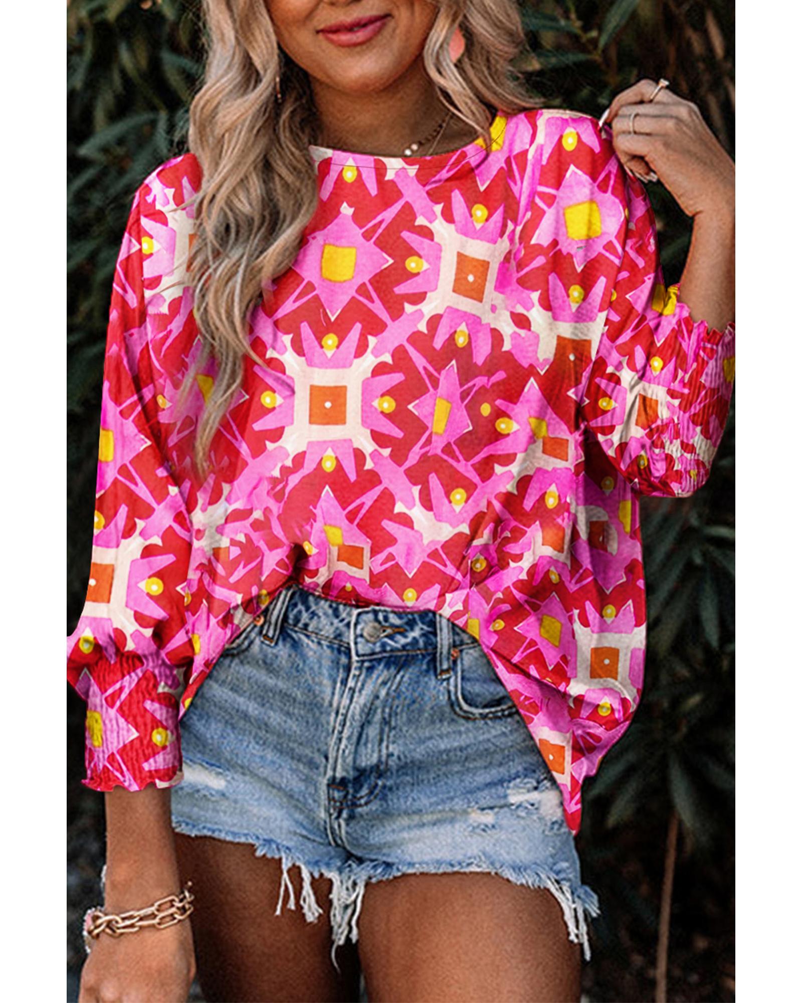 Strawberry Pink Geometric Print Shirred Cuff 3/4 Sleeve Loose Blouse – L