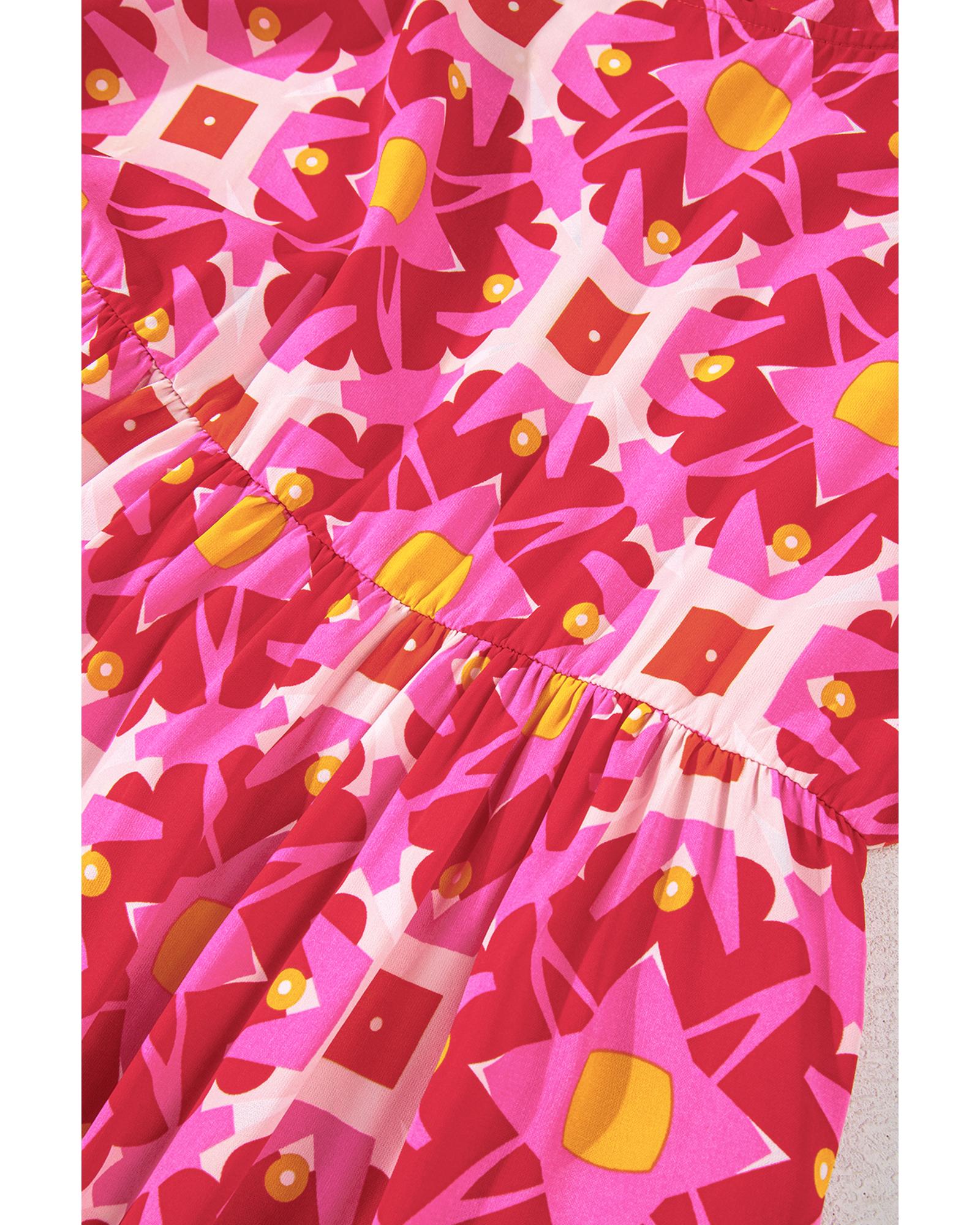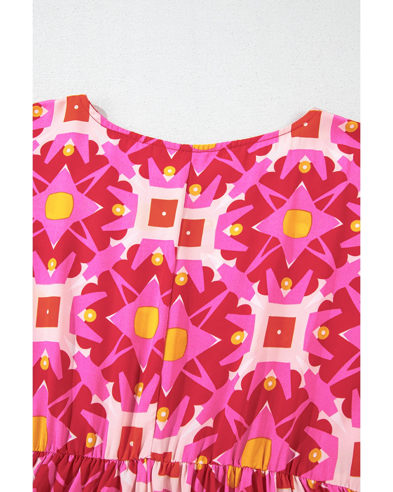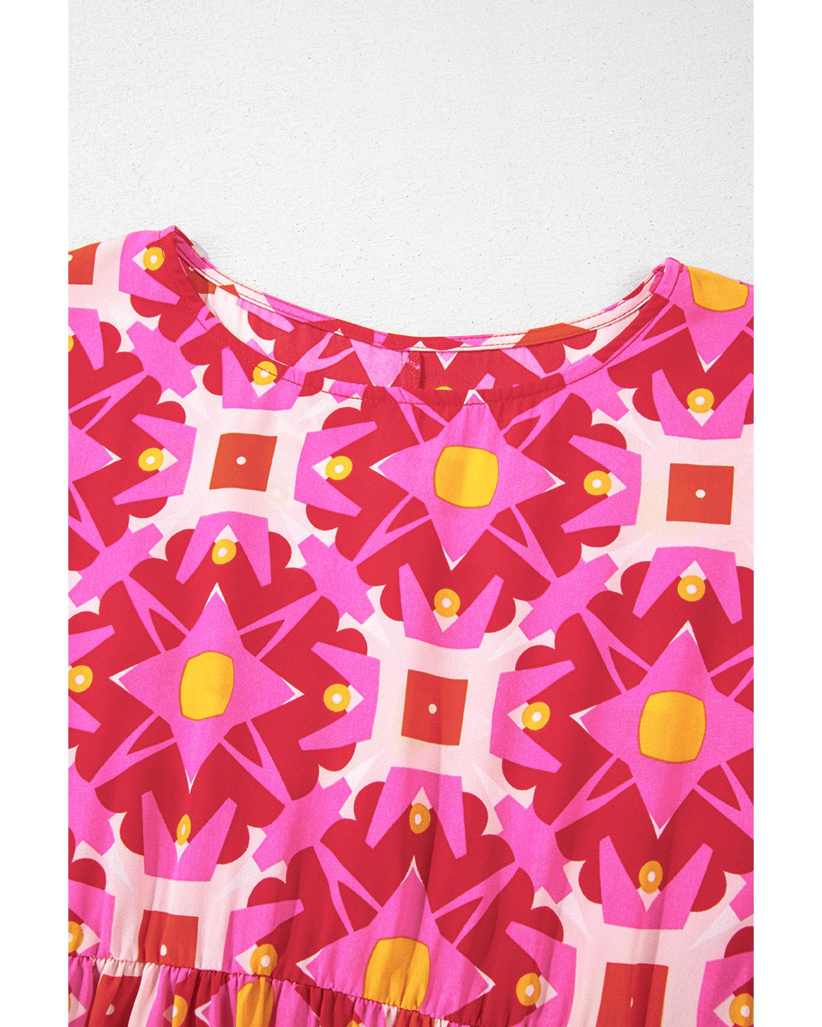 - Bohemian-inspired strawberry pink mini dress with a geometric pattern