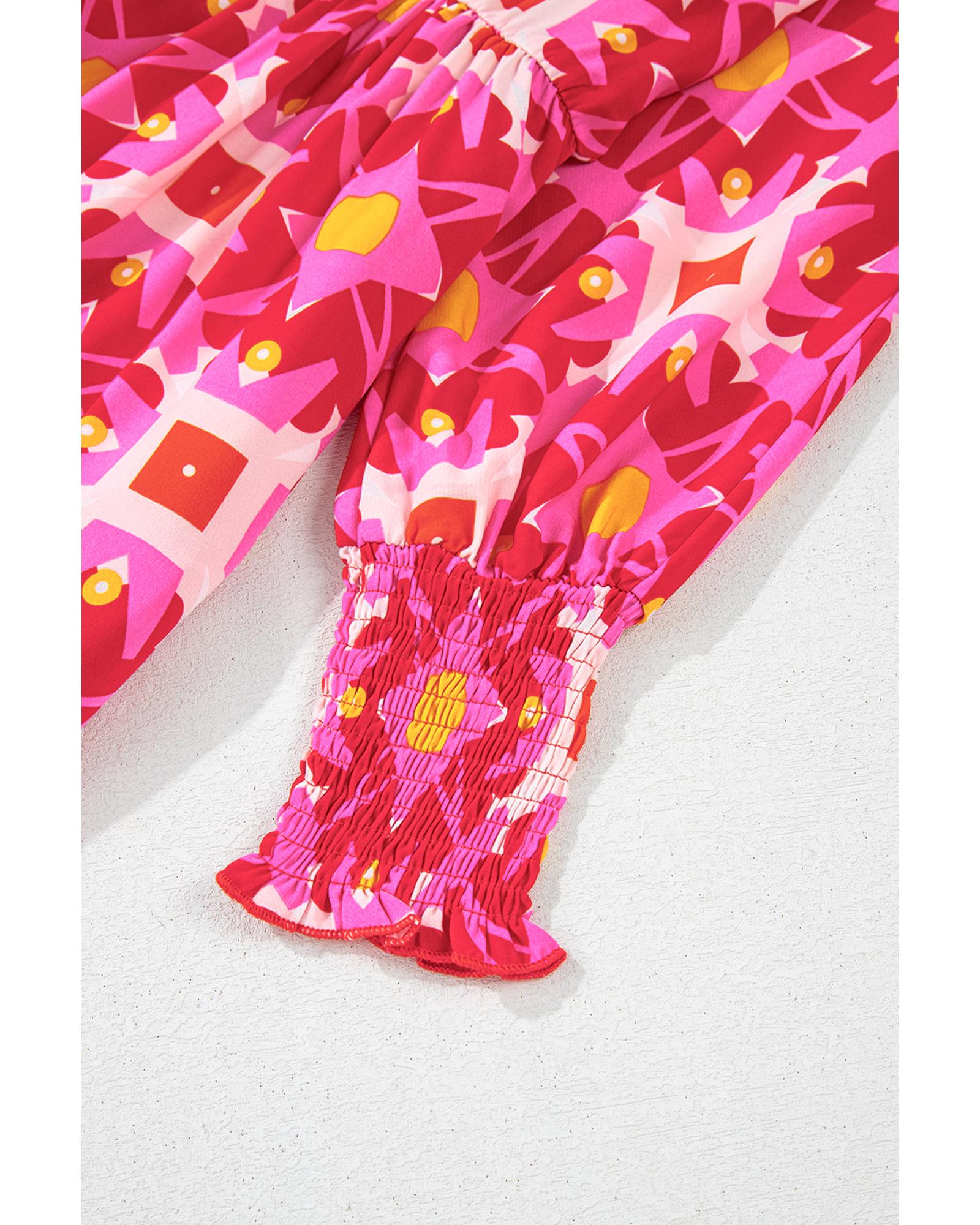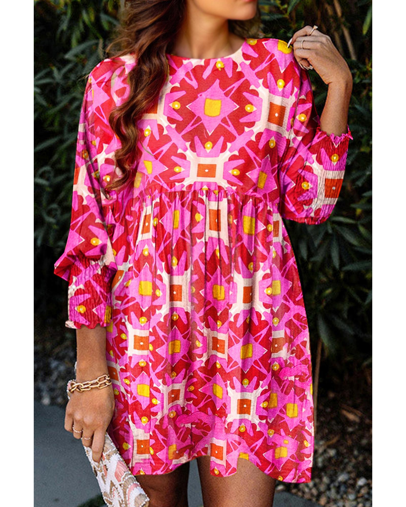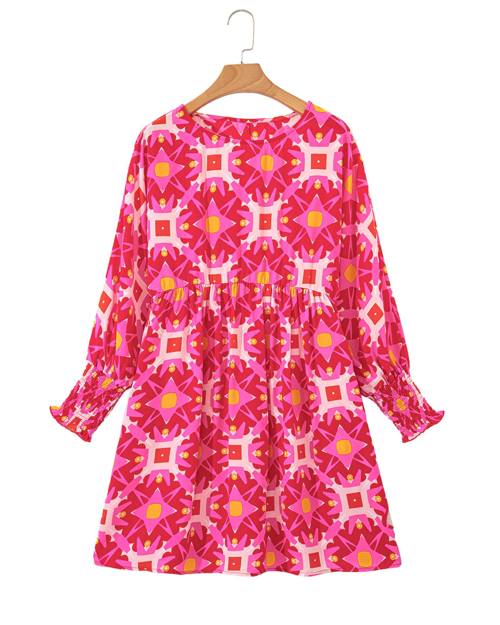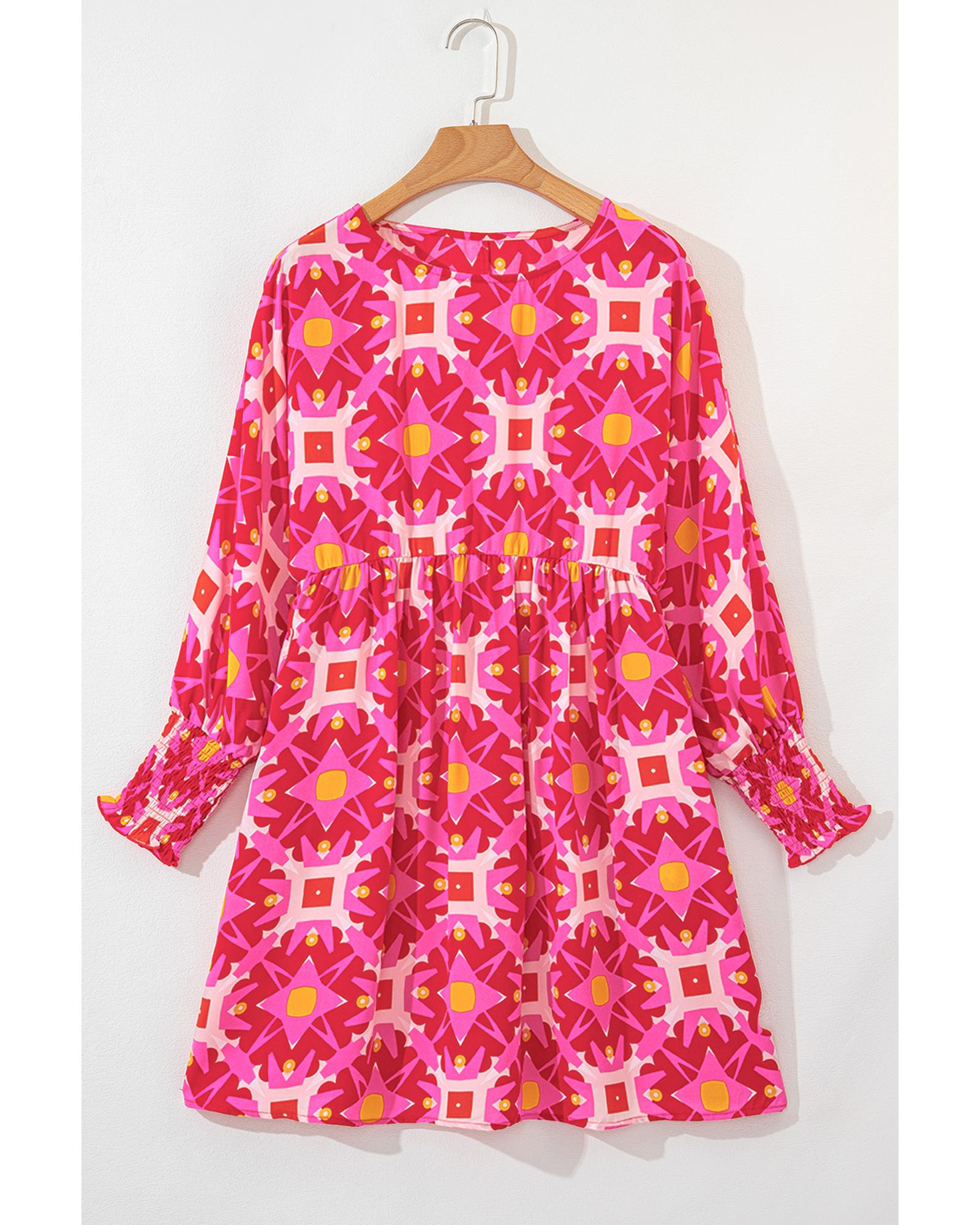 This strawberry pink mini dress features a trendy geometric print and a smocked design, combining bohemian charm with playful style. It is ideal for spring and autumn wear, offering a comfortable fit with its soft fabric and detailed long sleeves.