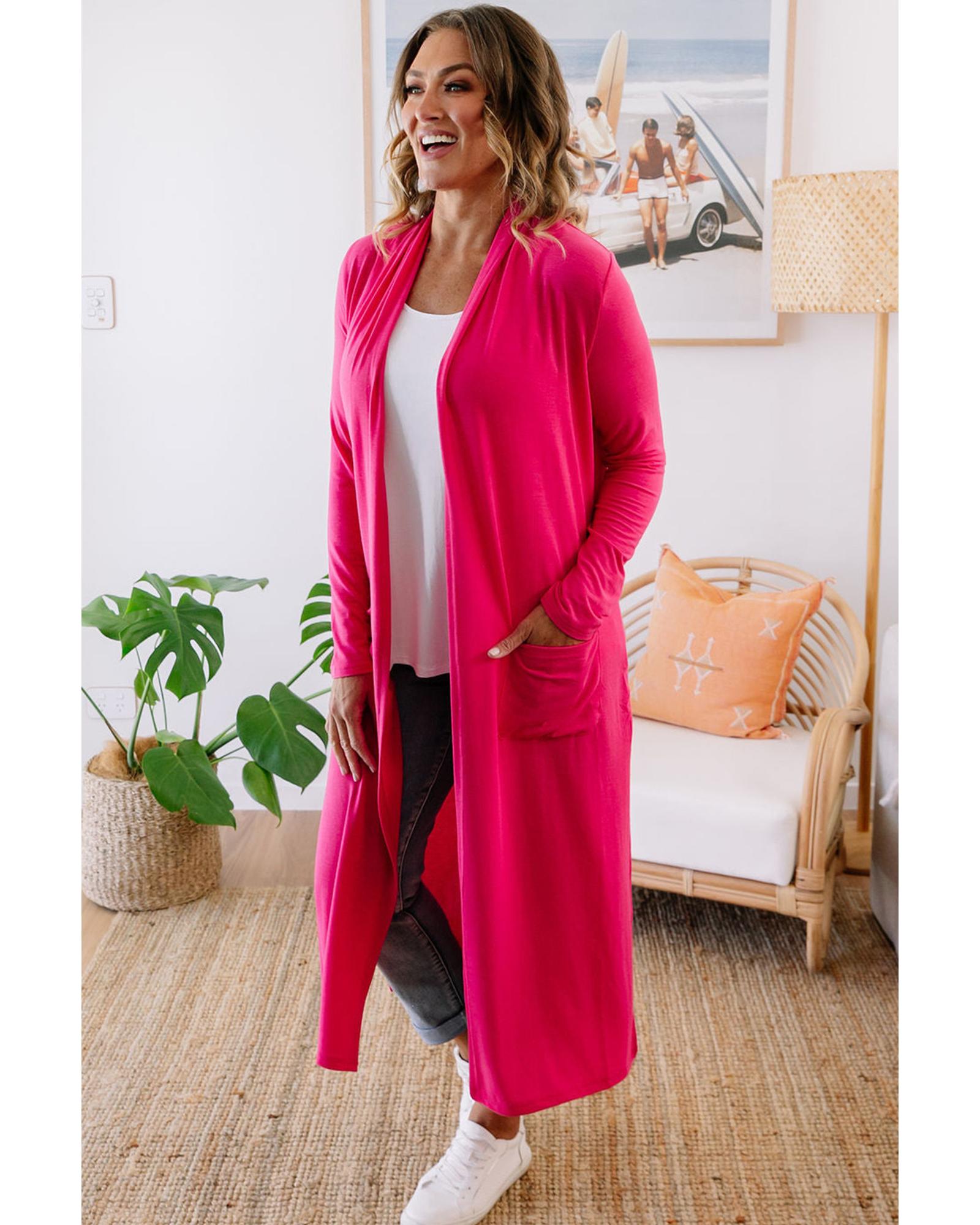 This Strawberry Pink Plus Size Side Split Pockets Duster Cardigan offers a stylish and versatile addition to your wardrobe. Designed with a trendy fitted look, it combines comfort and fashion, making it suitable for various occasions.