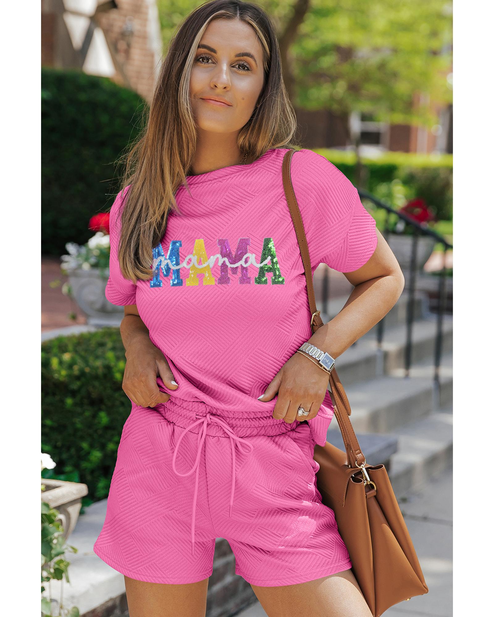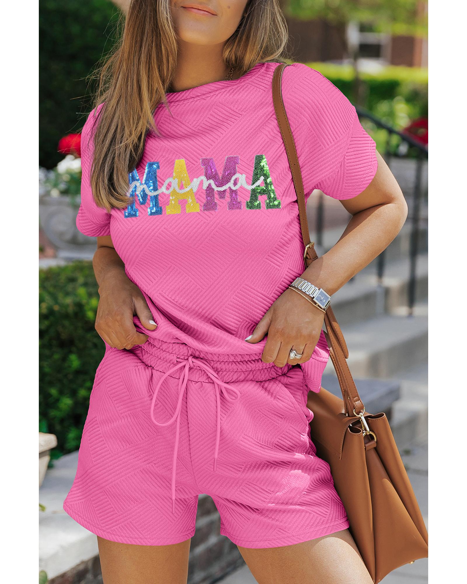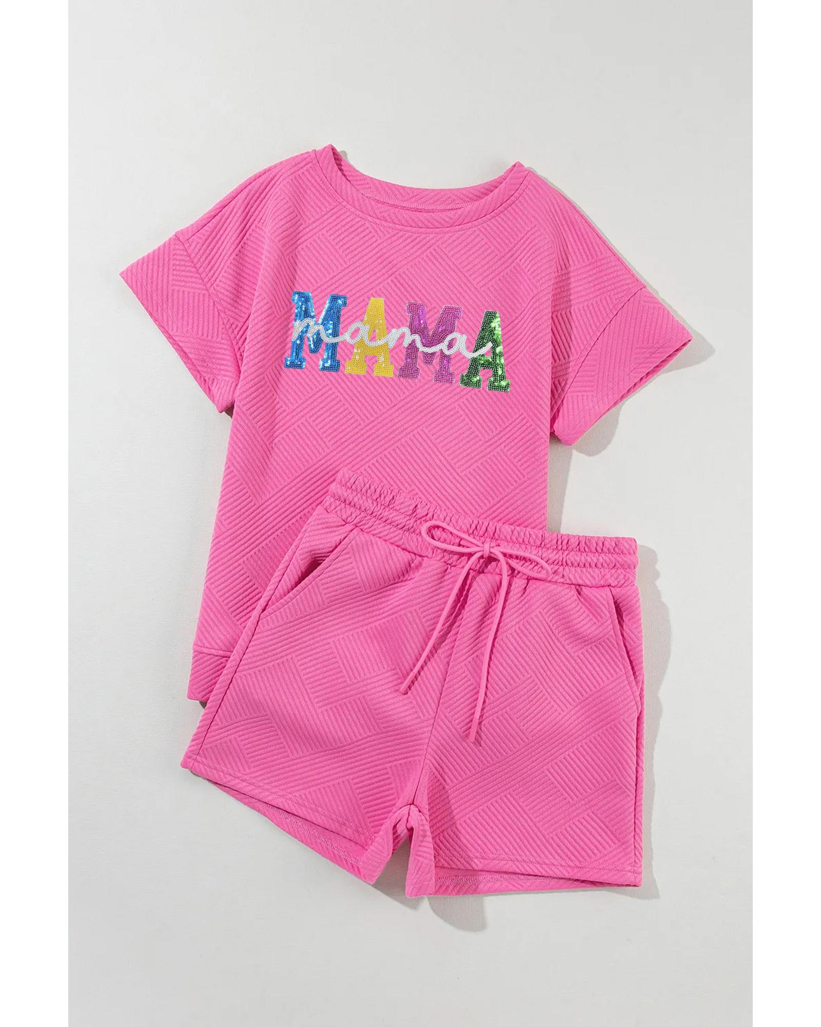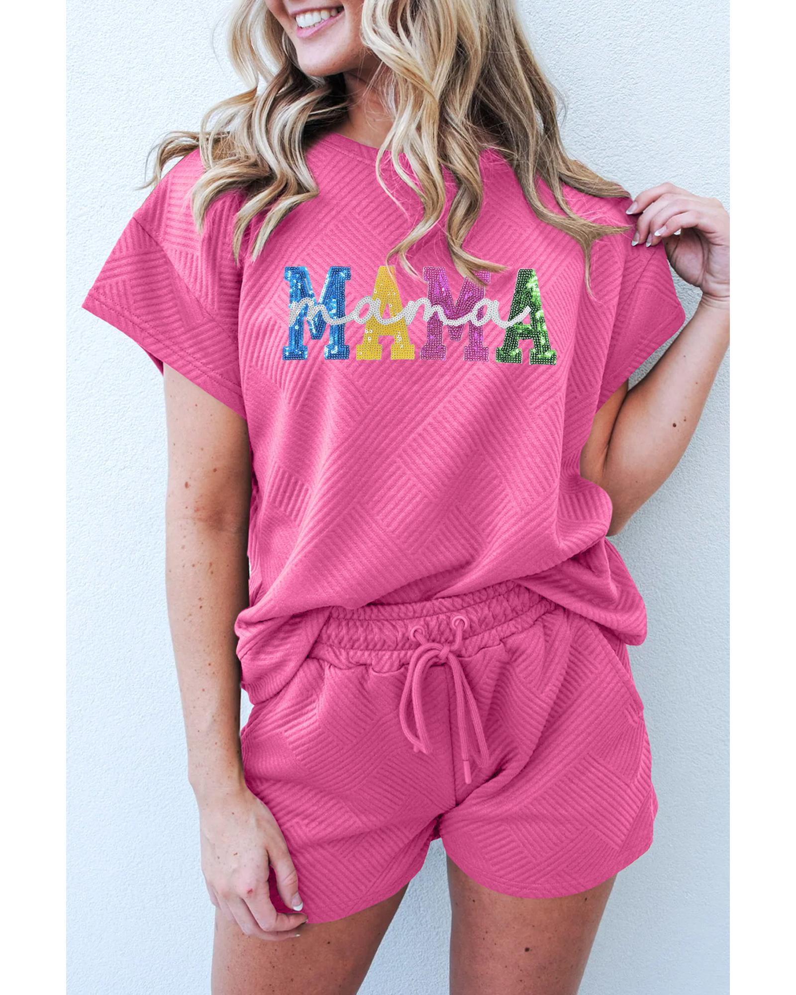 Strawberry Pink Sequined MAMA Letter Graphic Textured Short 2pcs Set – M