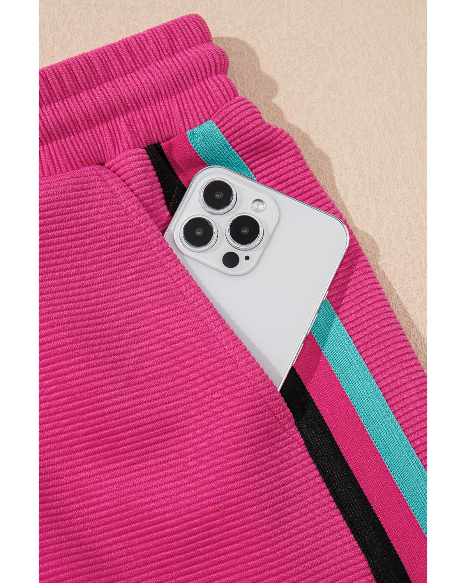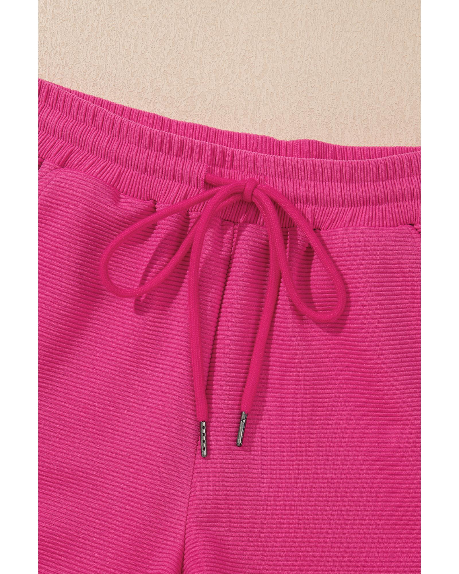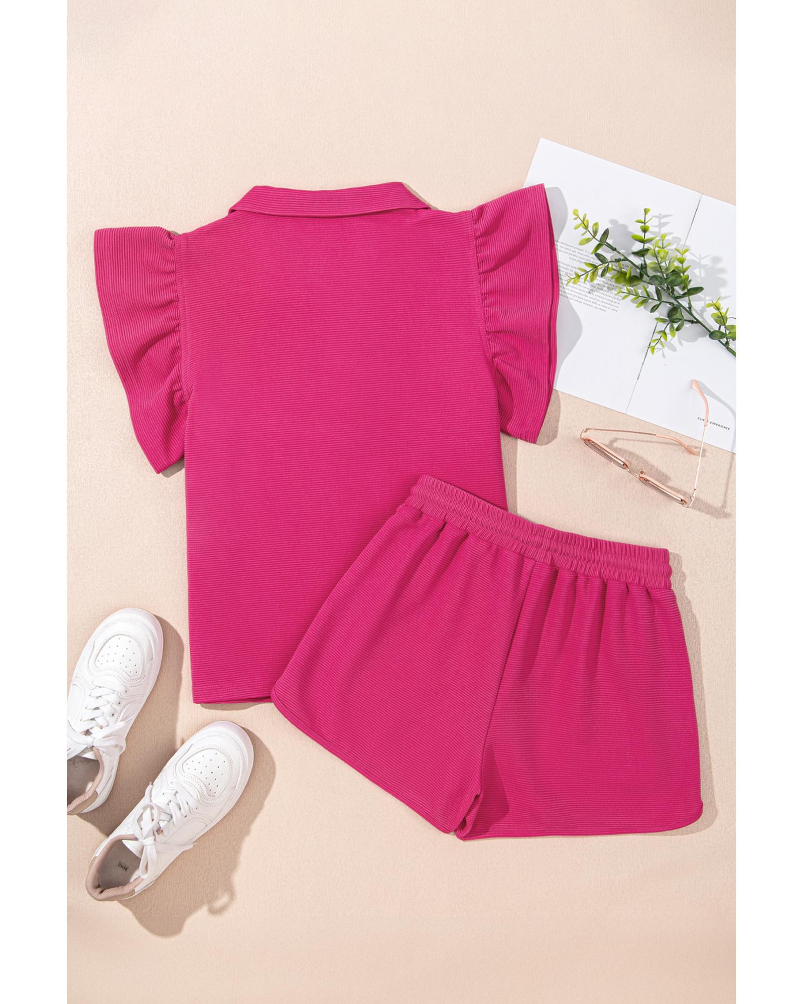 This casual short set features a stylish design with a striped detail on the collar and flutter sleeves on the top. The shorts are equipped with a drawstring waist, contrast striped sides, and pockets, making it both fashionable and functional. Available in multiple colors and sizes, it offers a comfortable fit for everyday wear.