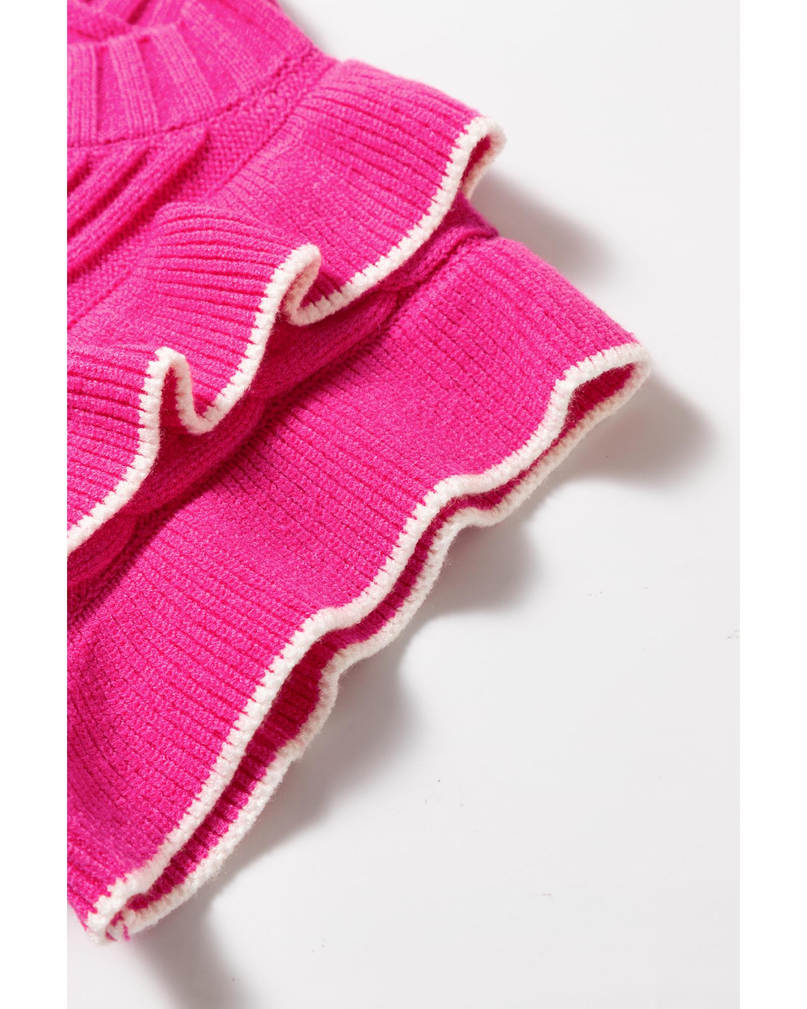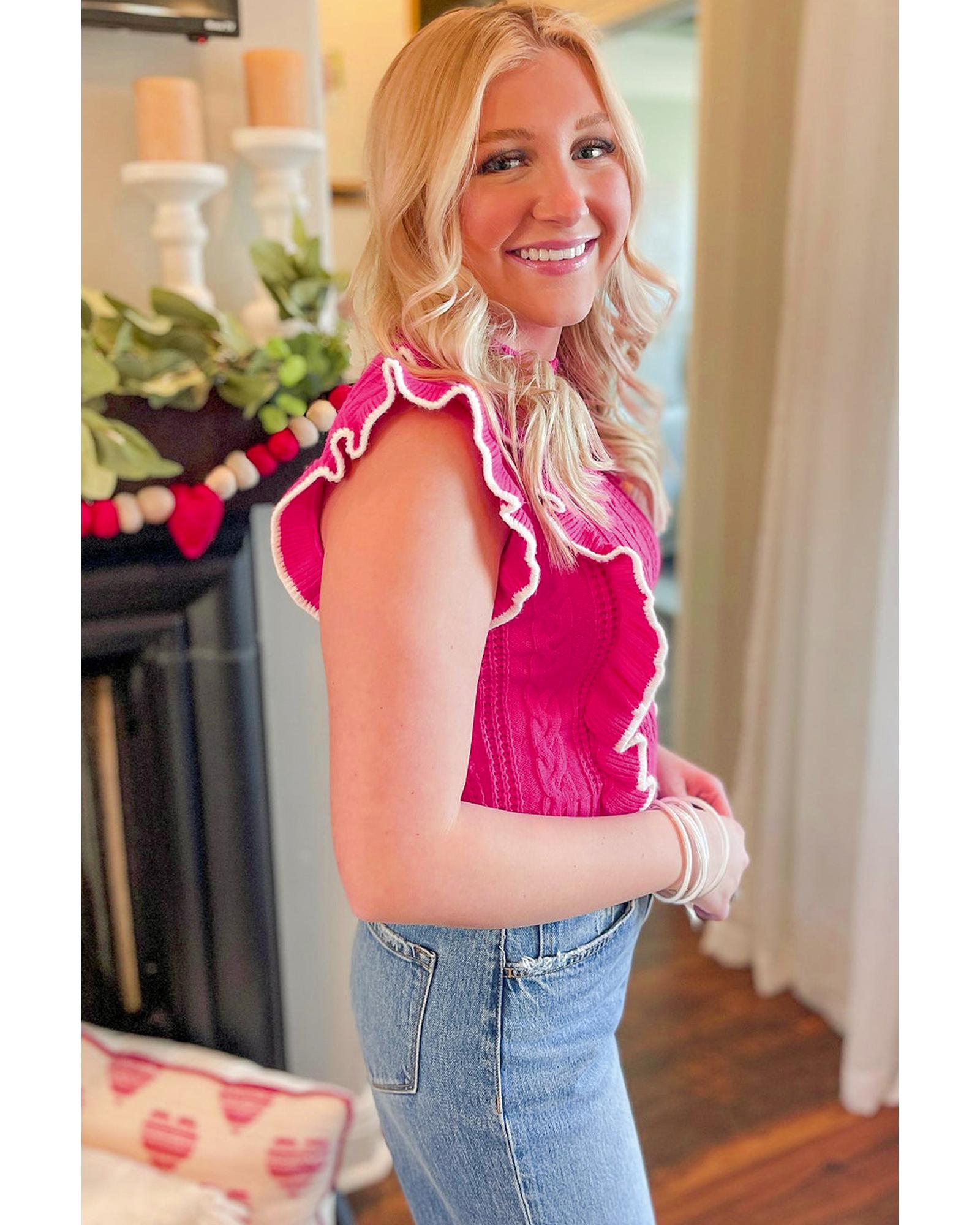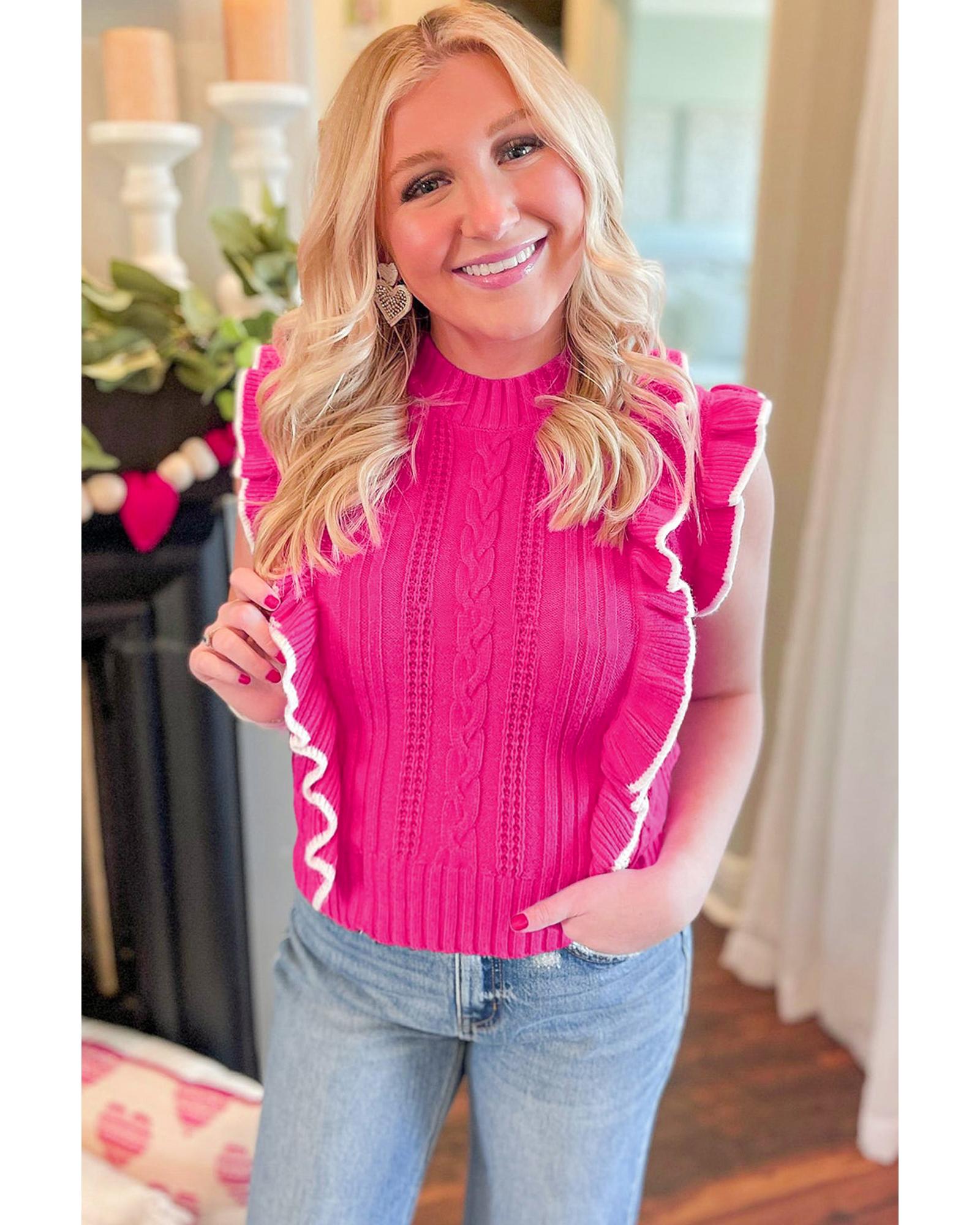 This textured knit ruffled mock neck sweater tank in a charming strawberry pink color offers a stylish and comfortable option for various occasions. Its feminine design and textured fabric provide a unique visual and tactile experience, making it suitable for transitioning seasons or layering with other garments.