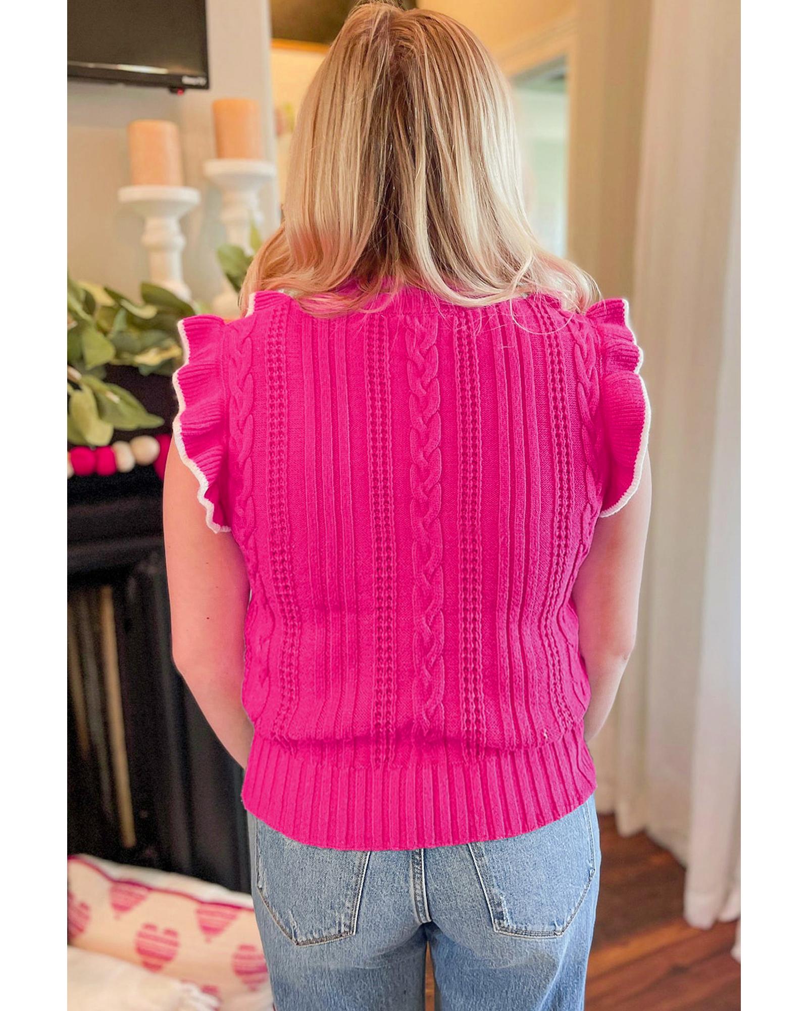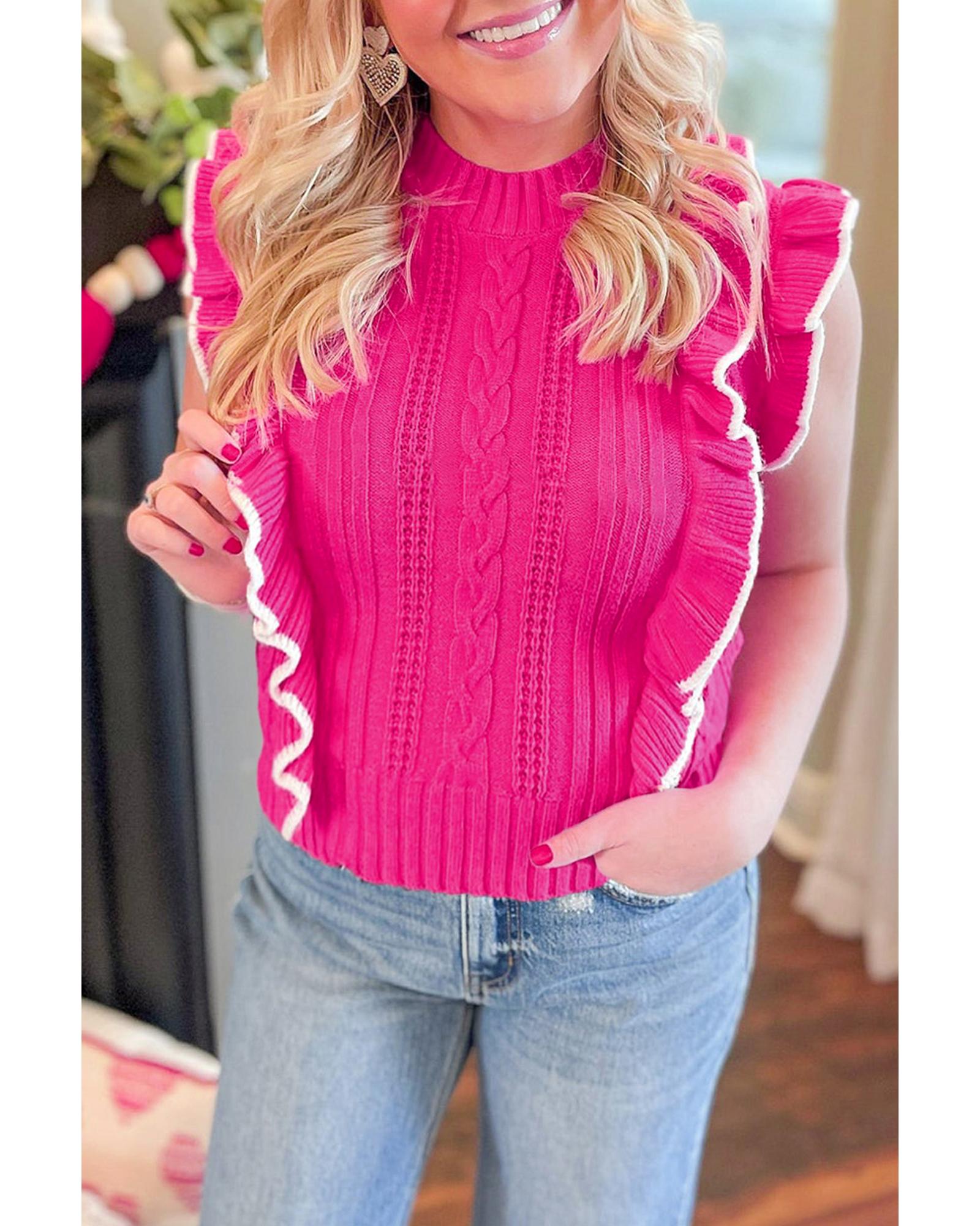 This textured knit ruffled mock neck sweater tank in a charming strawberry pink color offers a stylish and comfortable option for various occasions. Its feminine design features playful ruffles and a textured fabric that provides a unique visual and tactile experience. Ideal for transitional seasons or layering, it combines fashion with coziness for a versatile wardrobe addition.