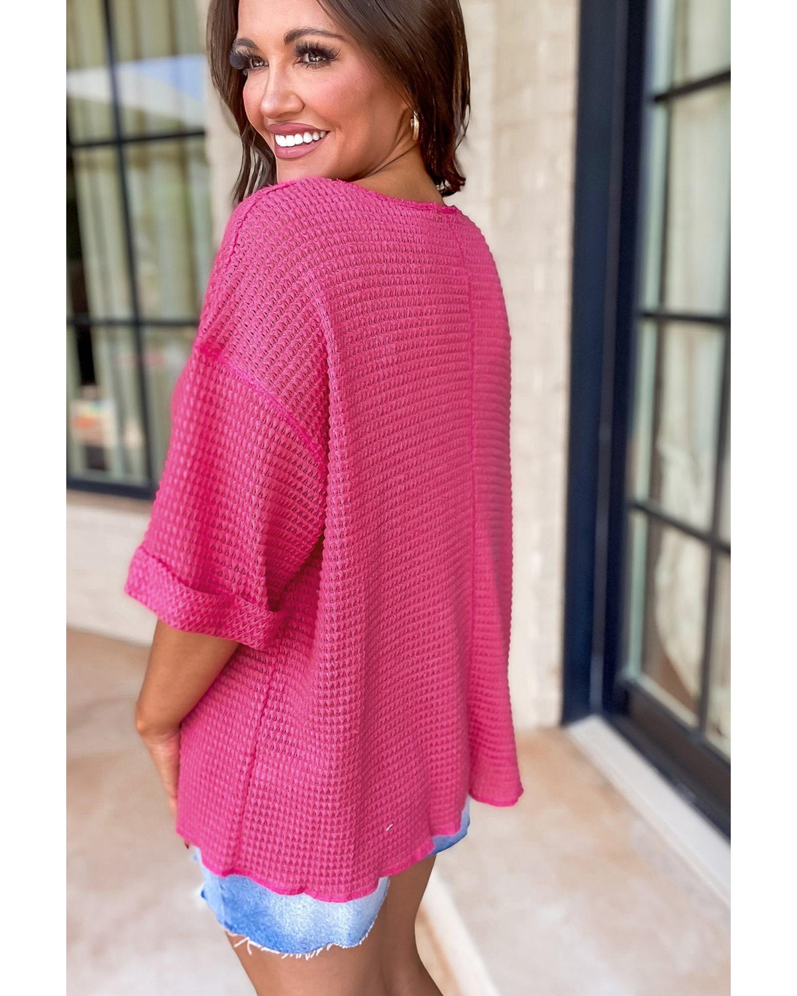 This short sleeve top features a textured knit fabric in a vibrant strawberry pink color. Designed with a split neckline and drop shoulder details, it offers a relaxed and comfortable fit suitable for casual wear. The straight hemline and half sleeves add to its stylish and versatile look, making it a great addition to any wardrobe.