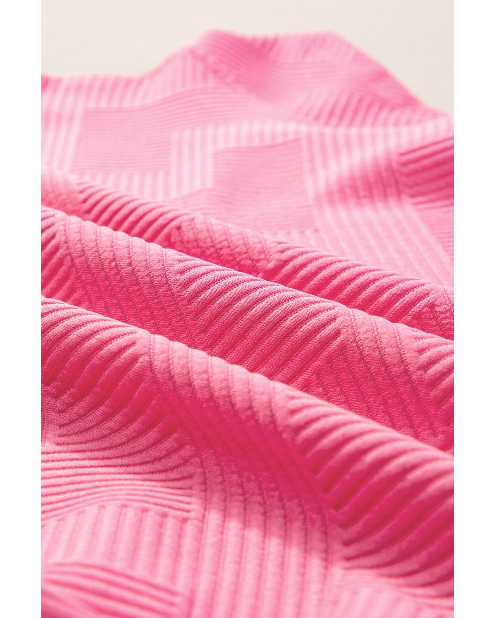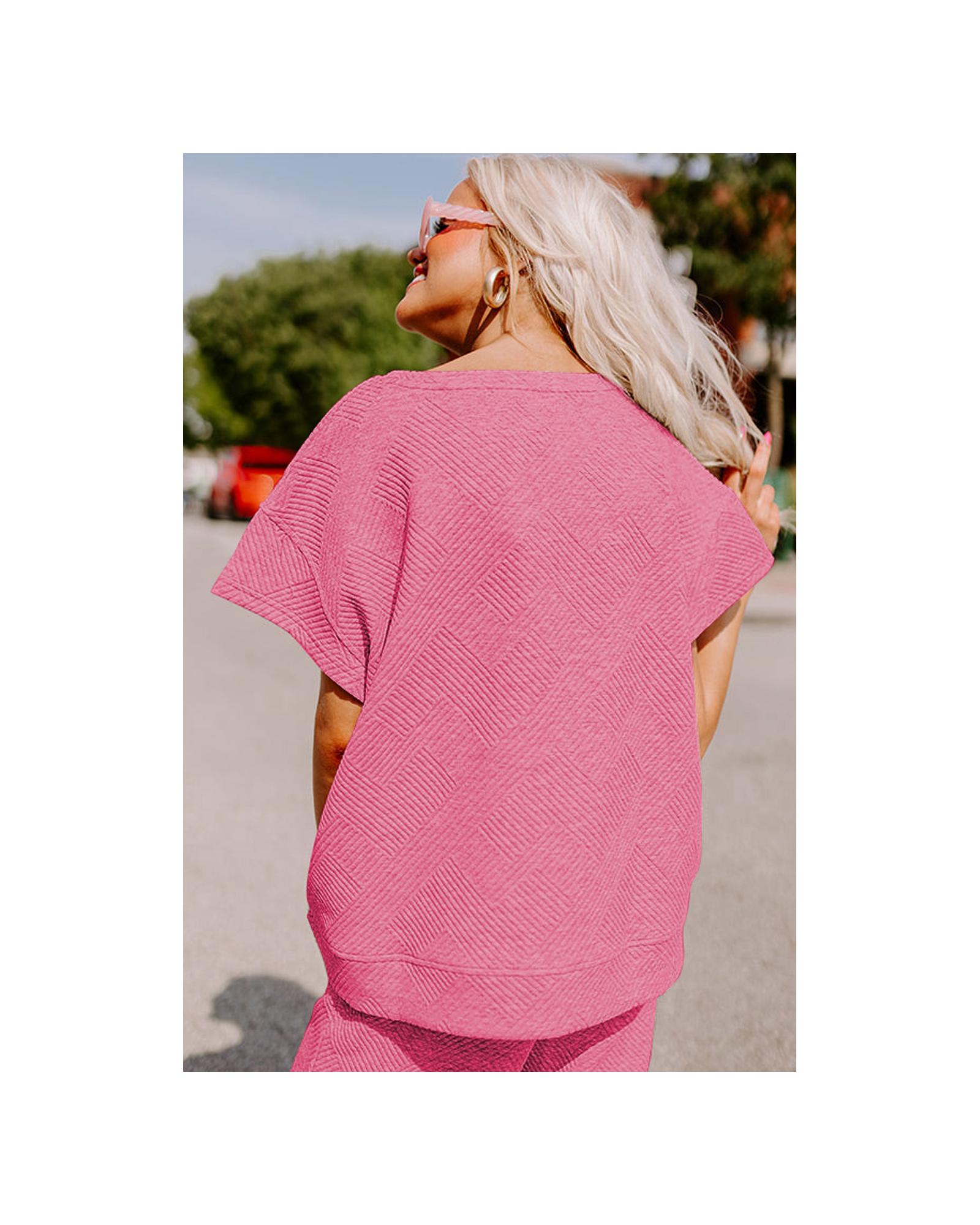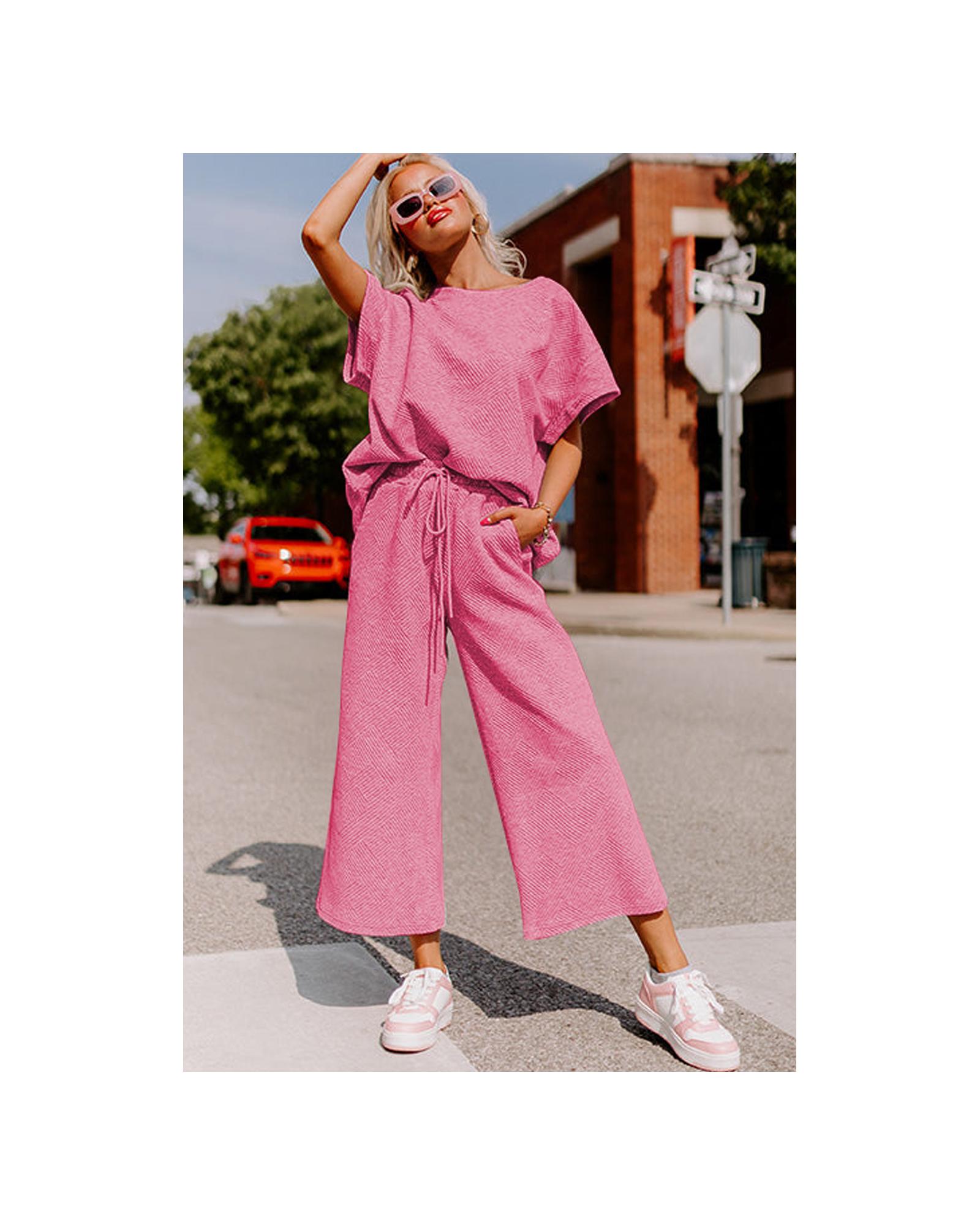 Strawberry Pink Textured Loose Fit T Shirt and Drawstring Pants Set – L