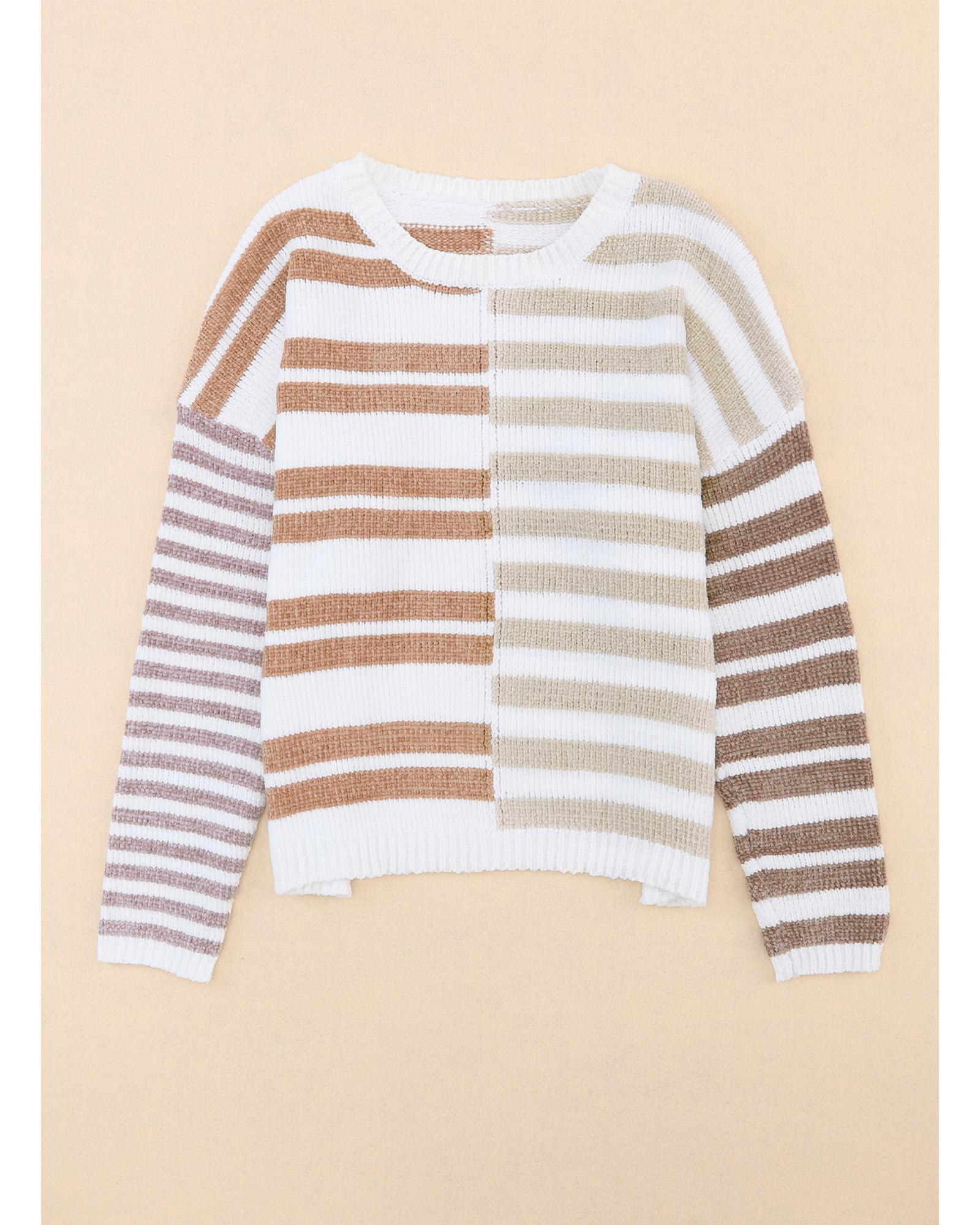 This drop shoulder slouchy sweater features a trendy, oversized fit designed for comfort and style. Its colorful stripe pattern and neutral tones make it suitable for any season, offering a versatile addition to your wardrobe.