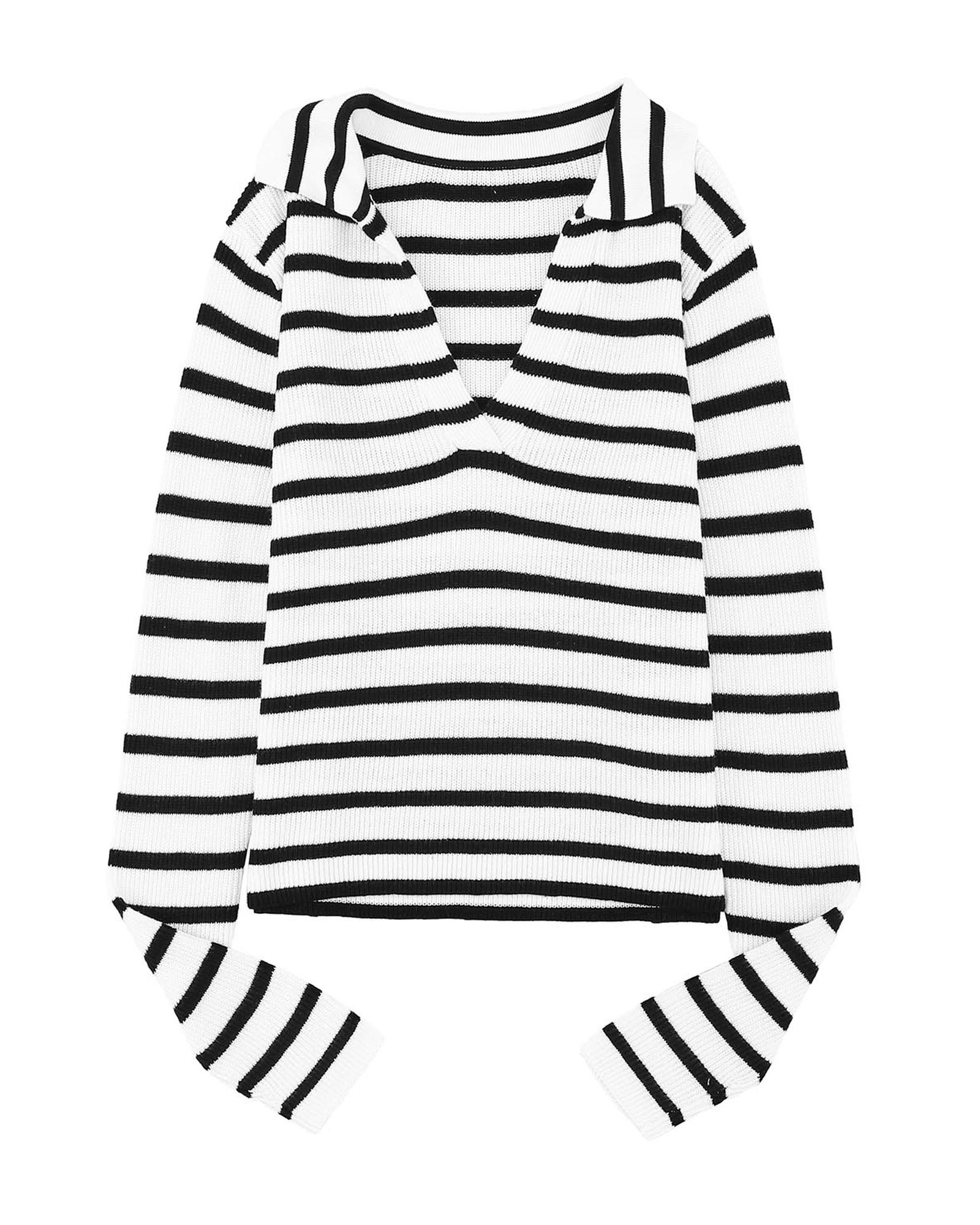 This lightweight knit sweater features a stylish stripe pattern with a collared V-neck design, offering a trendy and sophisticated look. Its lightweight material makes it ideal for layering, providing both comfort and versatility for casual or semi-formal outfits.