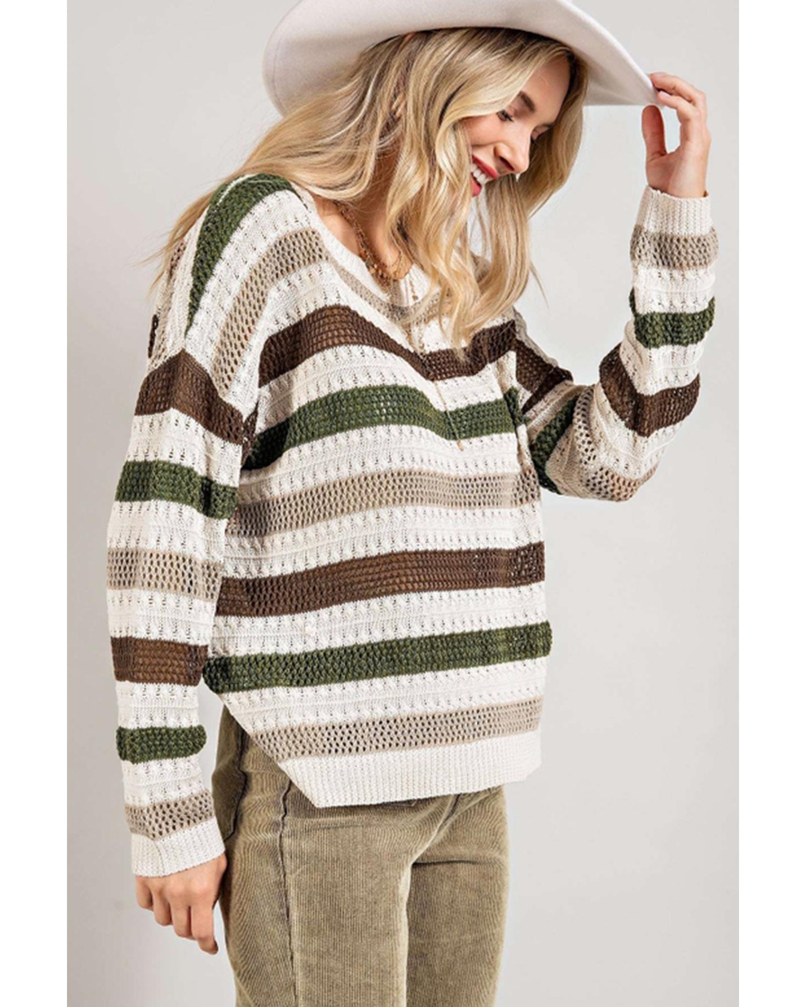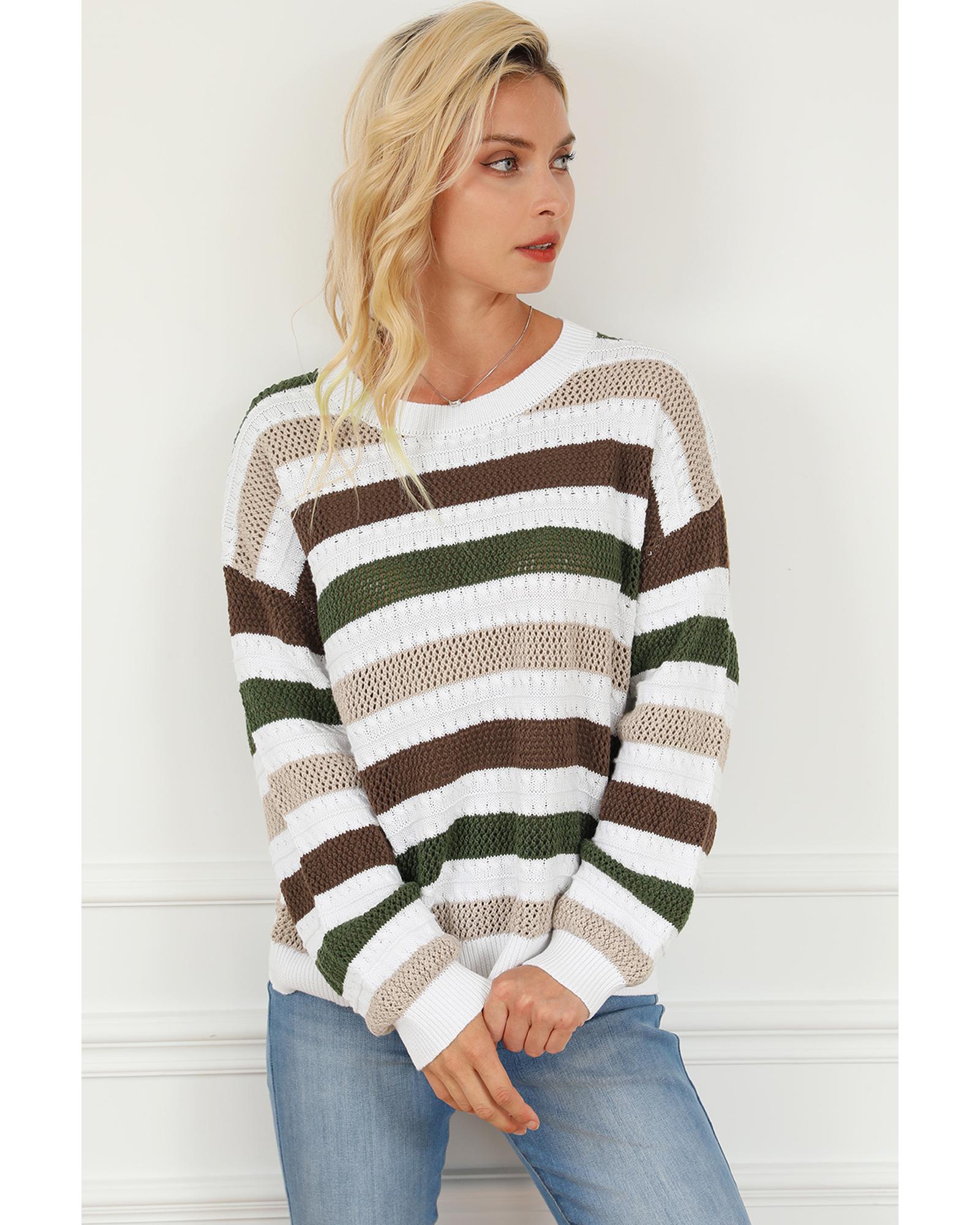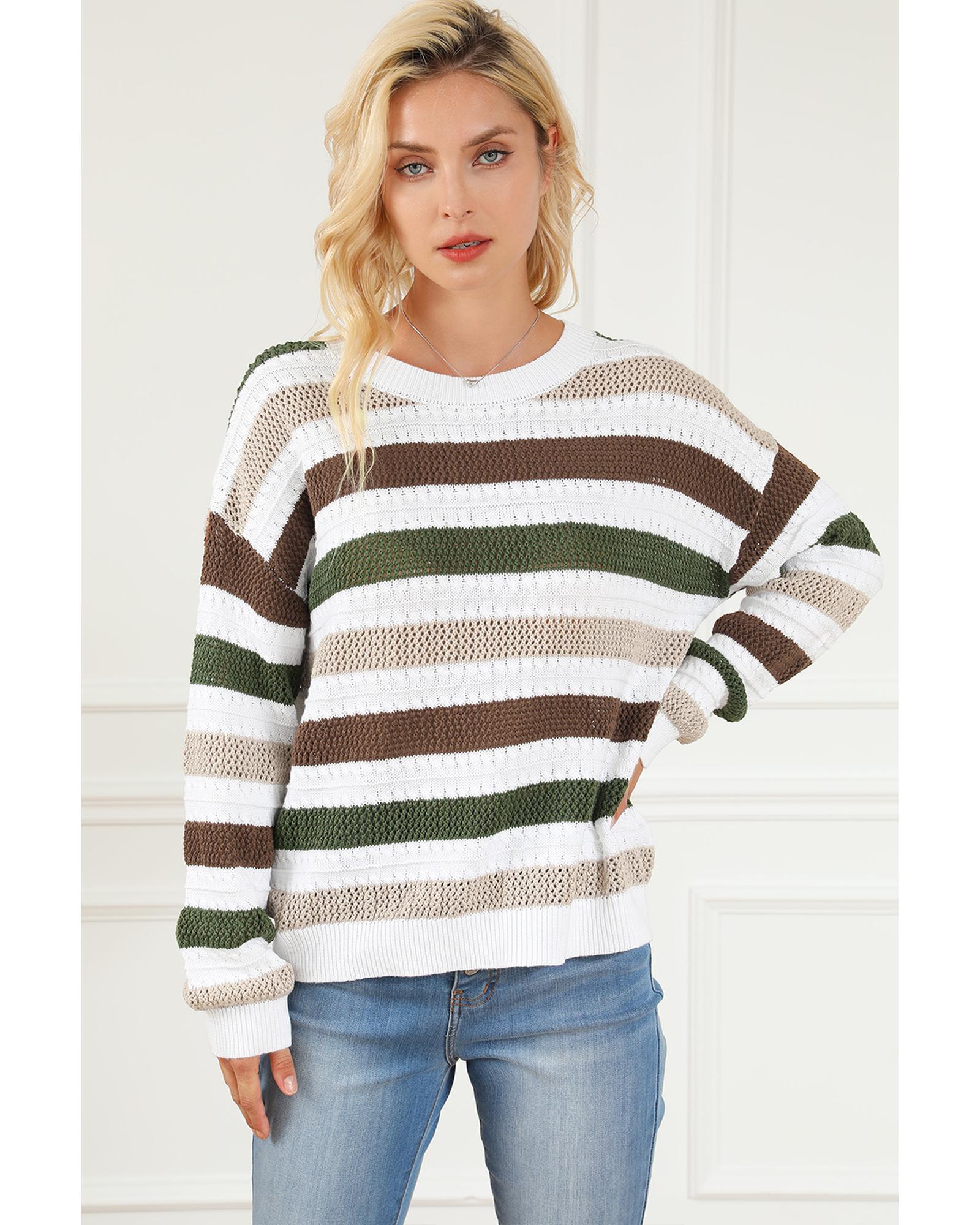 This stripe crochet hollow-out knit sweater combines a trendy fitted design with a comfortable and luxurious feel. Its stylish stripe pattern and crochet hollow details make it suitable for various occasions, from casual outings to evening events. The relaxed fit allows for easy layering and versatile styling.