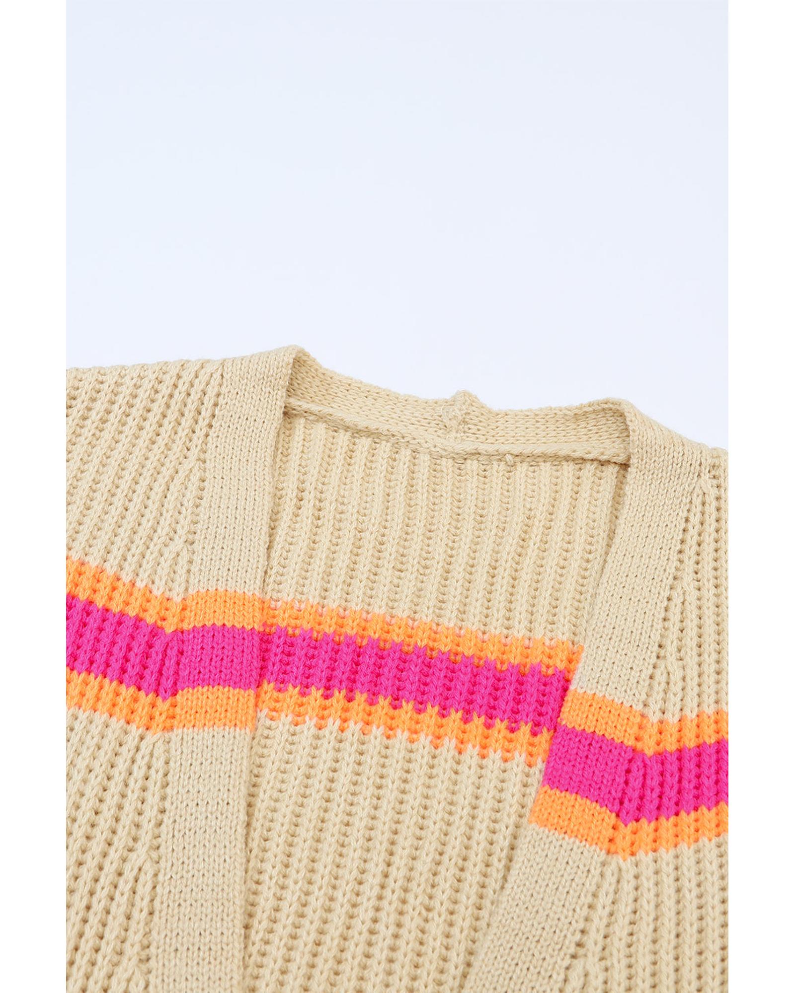 White Stripe Colorful Pattern Button Front Sweater Cardigan - M