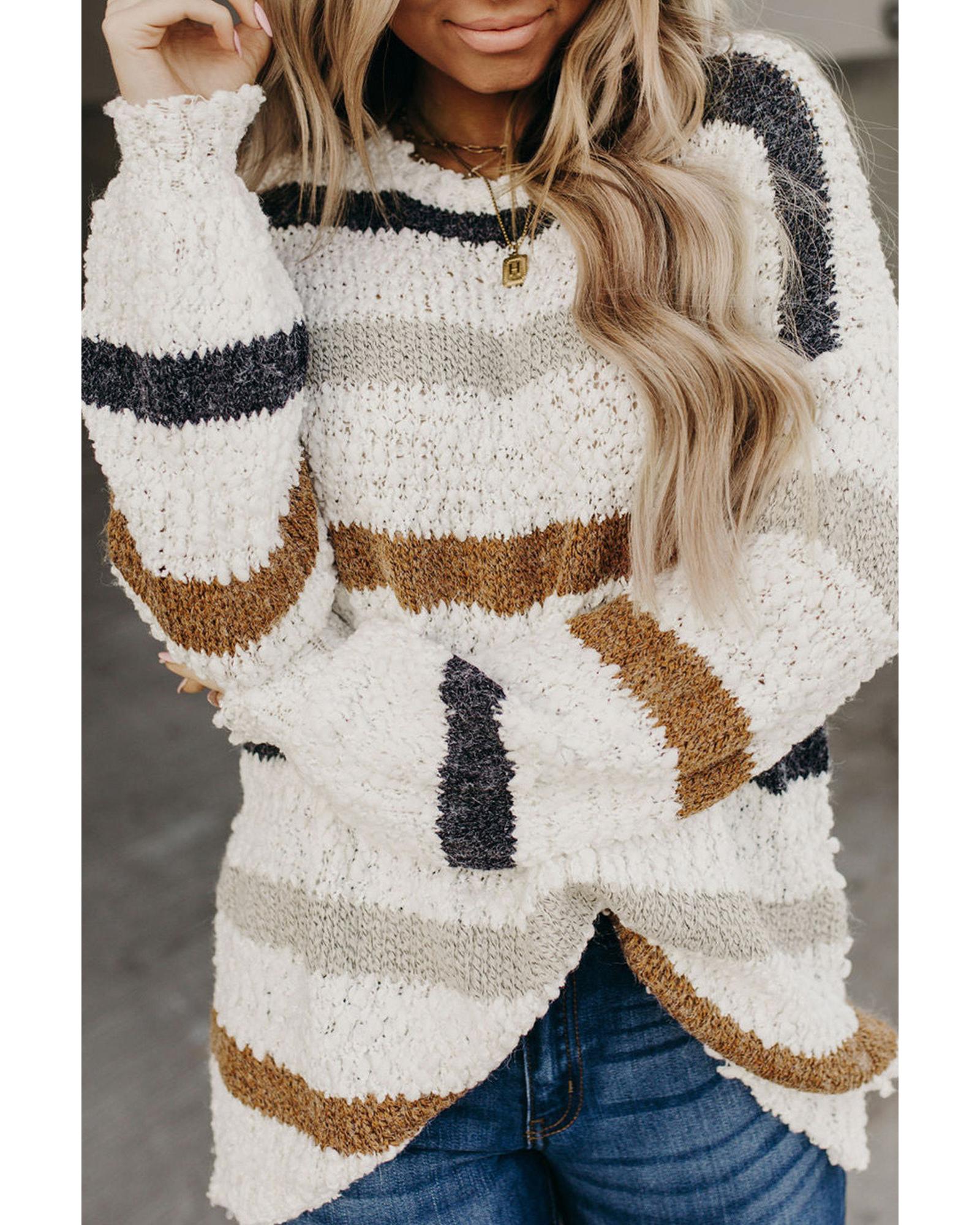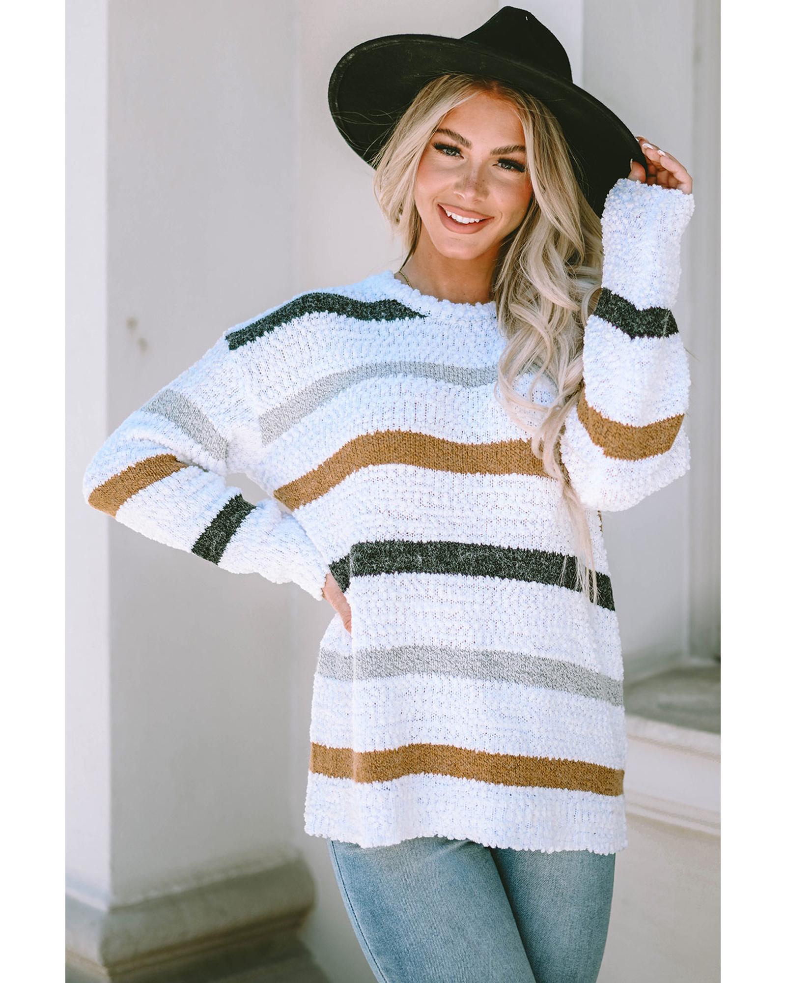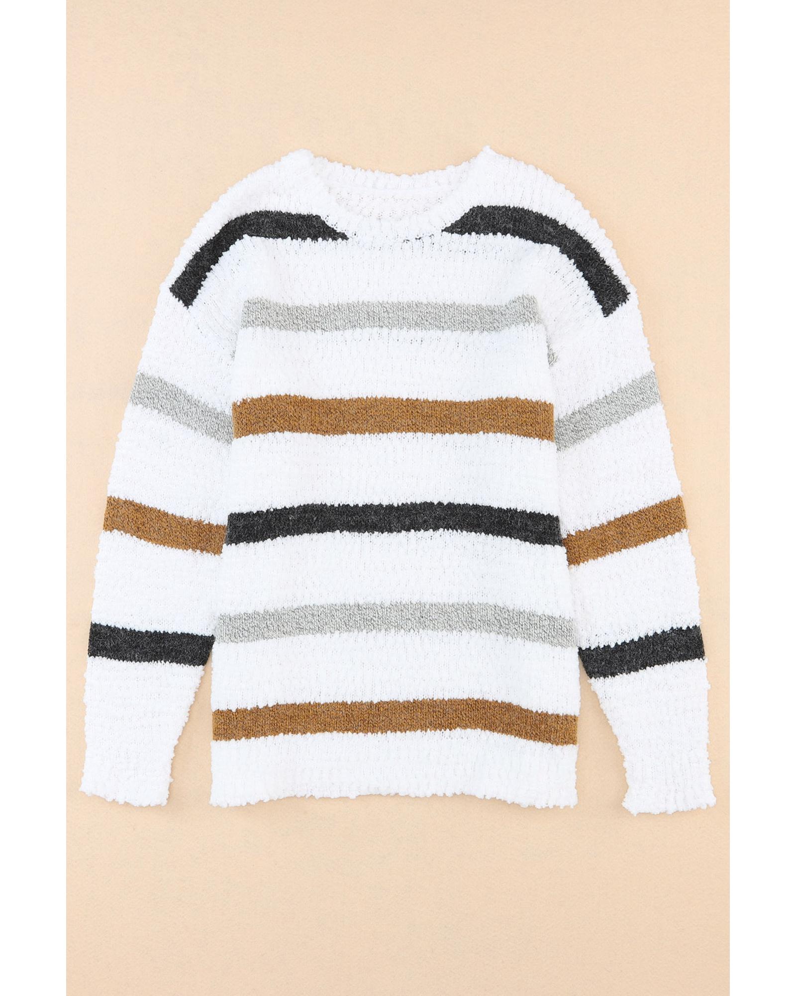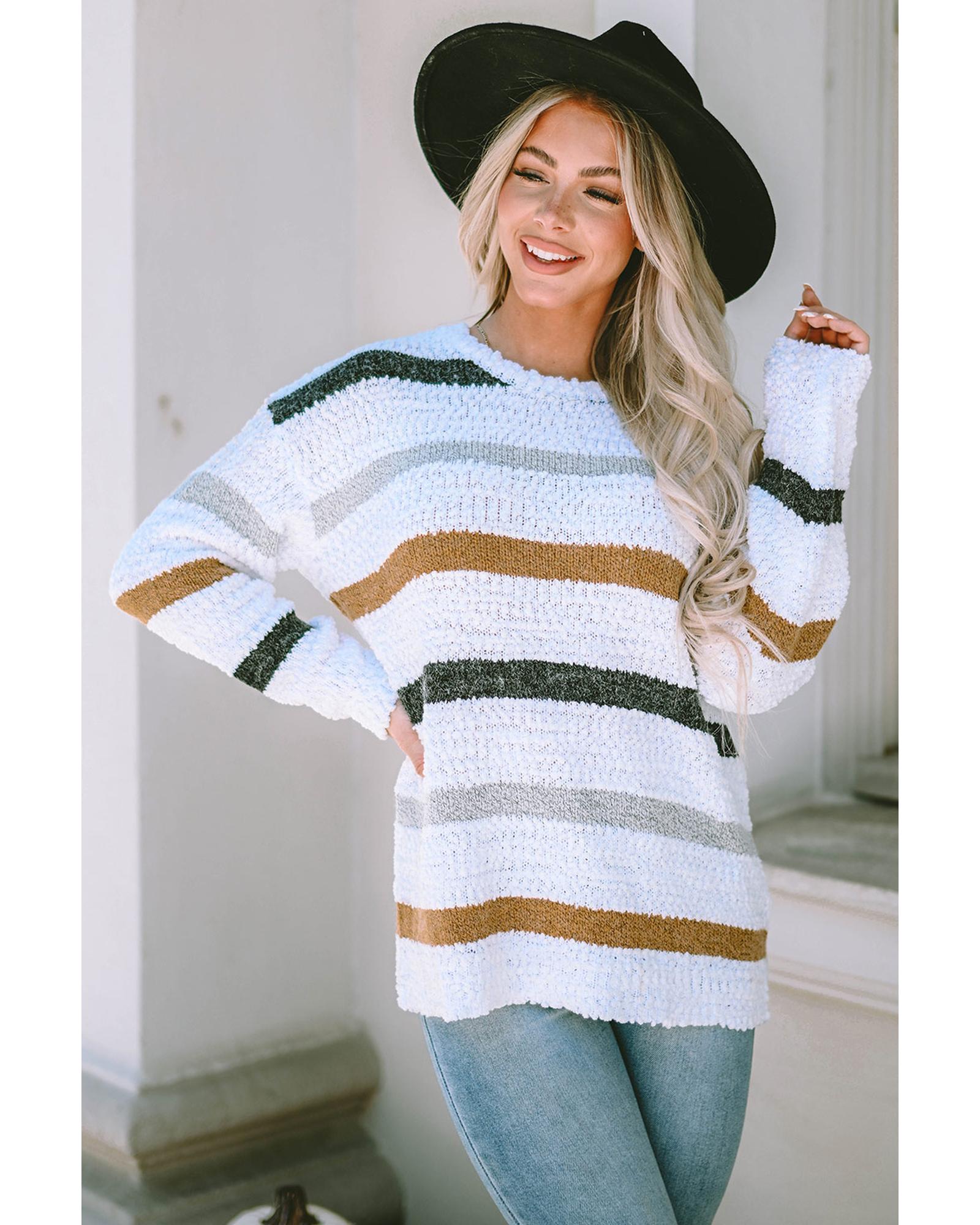 This striped popcorn knit sweater features a trendy fitted design with a timeless striped pattern. The popcorn texture adds a stylish touch, making it suitable for various age groups. Its relaxed fit and versatile style make it an ideal choice for winter wardrobe essentials.