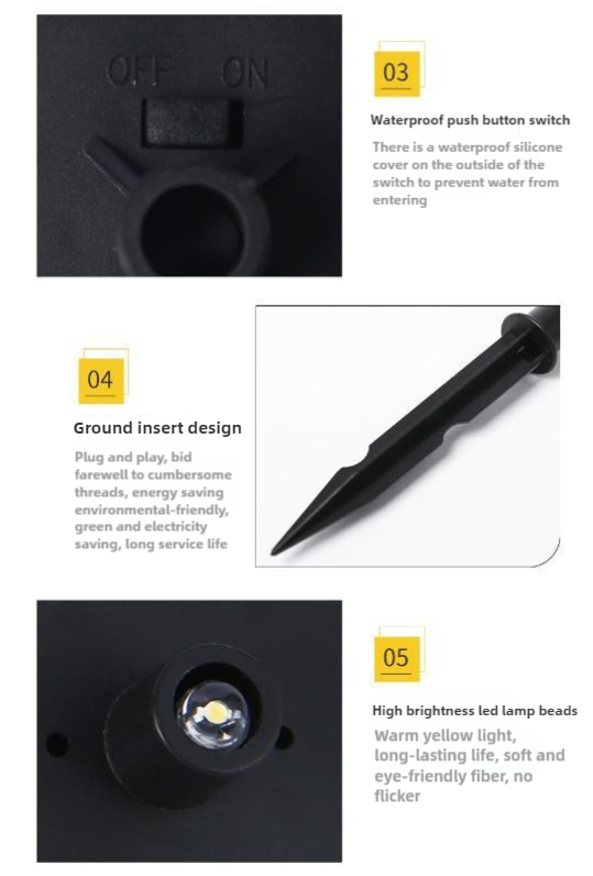 This solar resin garden stake light is designed to enhance outdoor spaces such as yards, patios, and gardens by providing soft, warm illumination at night. It combines decorative appeal with practical lighting, powered by a solar panel that charges during the day and automatically lights up after dusk.