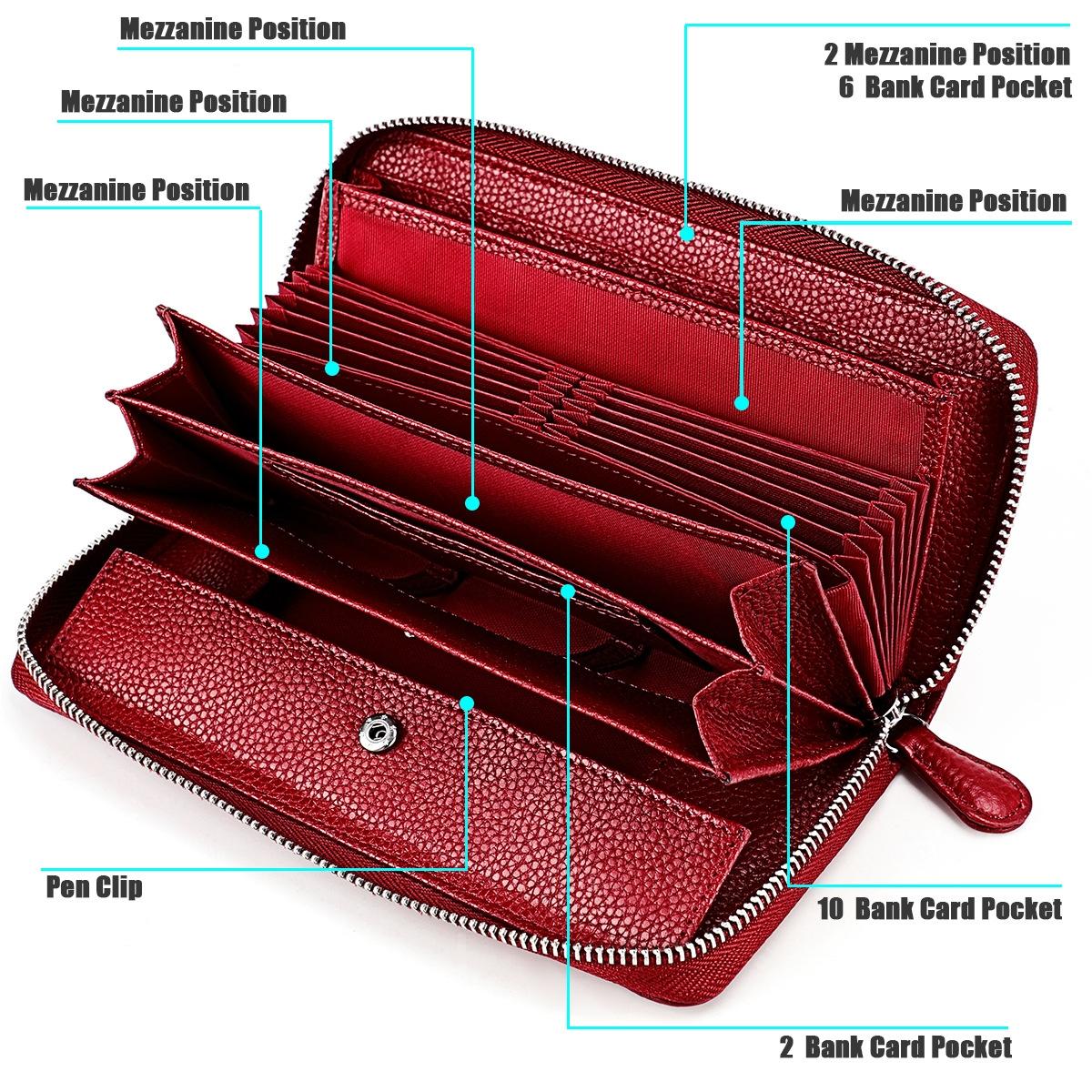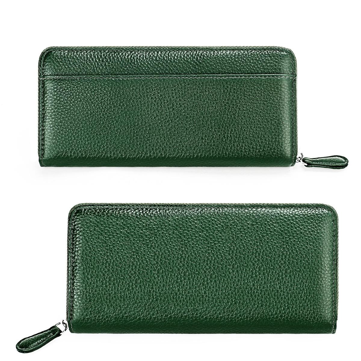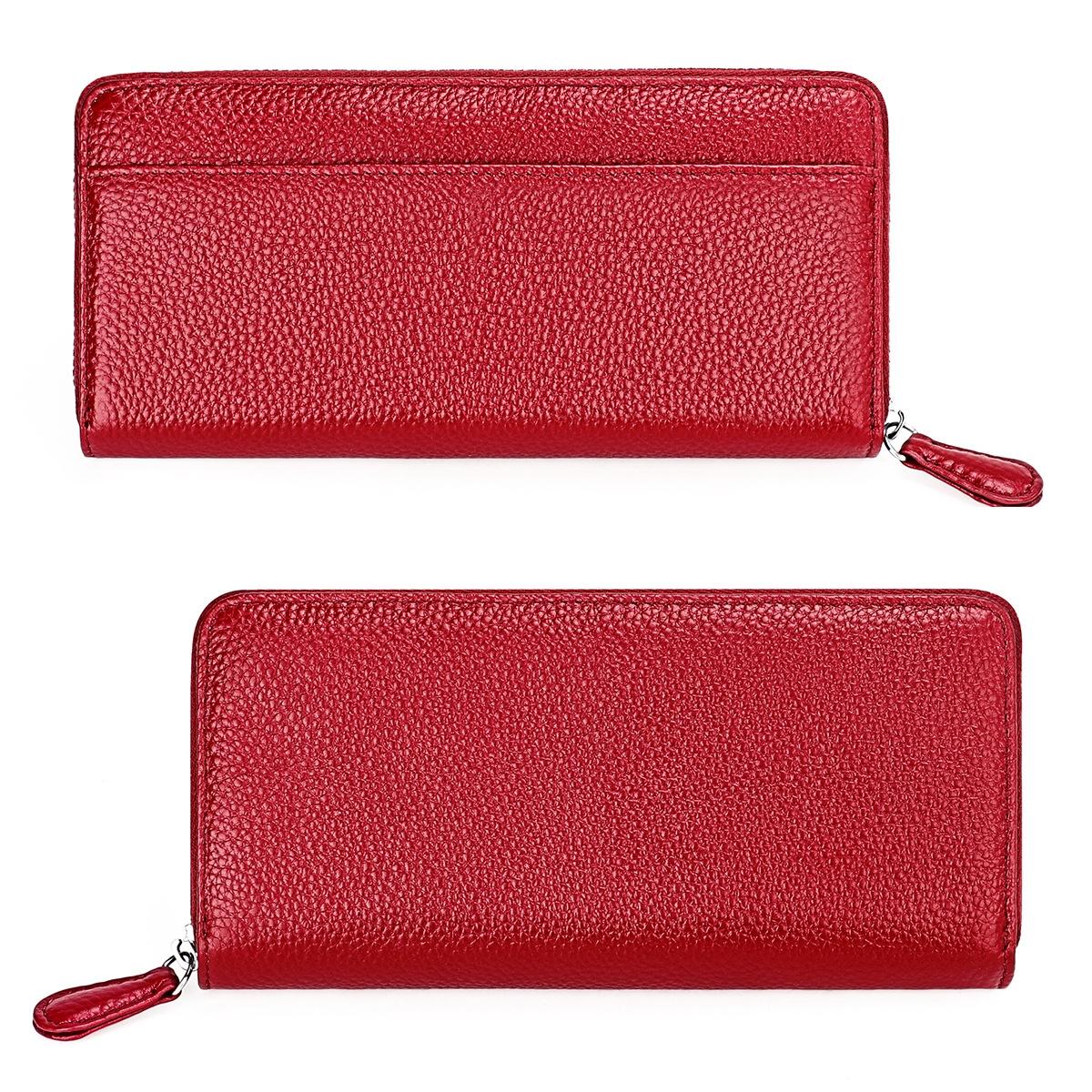 This stylish RFID clutch features a textured lychee pattern and a zipper closure, combining fashion with functionality. Crafted from high-quality cowhide, it offers a pleasant tactile experience and durable use. The design includes multiple compartments to organize bills, change, cards, and checks efficiently, making it suitable for everyday use.