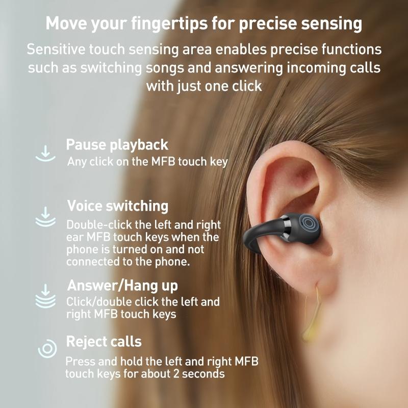 The Bluetooth earphones feature a compact and lightweight design with an ear-clip style for breathability and comfort. They offer high-definition calls and music playback, making them suitable for everyday use. The connection is stable within a range of about 10 meters, and the device automatically connects to your phone when in proximity.