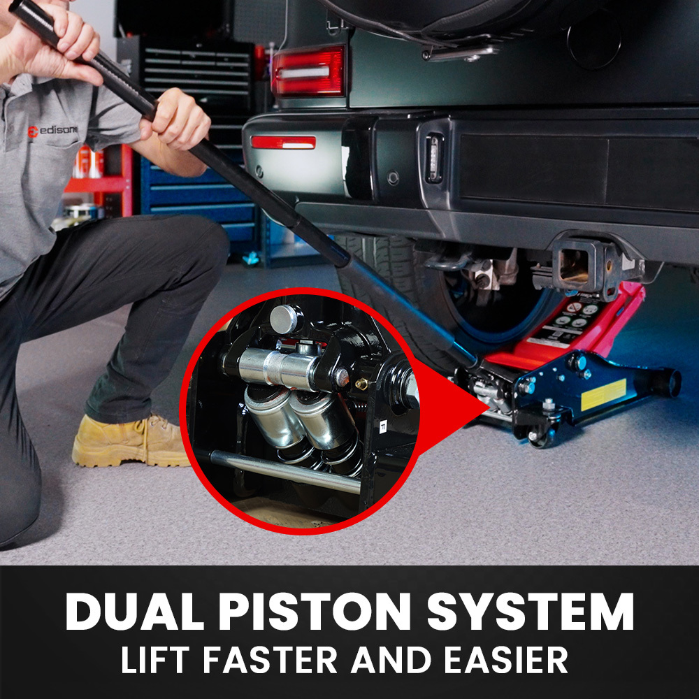 This hydraulic trolley floor jack is designed for lifting larger vehicles such as SUVs and trucks with ease and safety. It features a high lifting capacity, a dual-piston system for quick operation, and a durable steel construction. The jack complies with strict safety standards and includes convenient features for user safety and comfort.